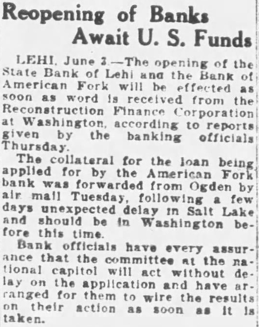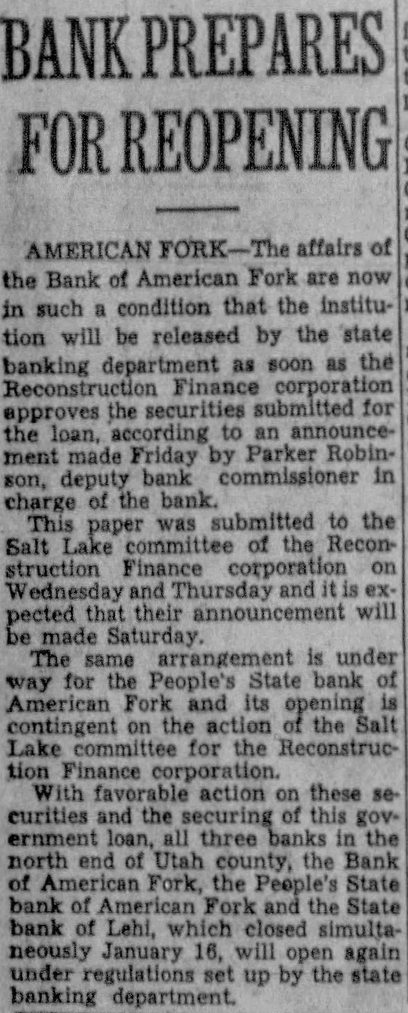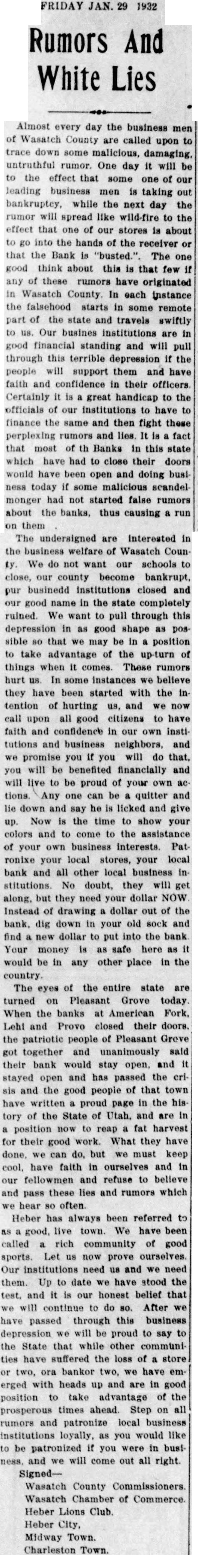 FRIDAY 1932 Rumors And White Lies Almost every day the business men of Wasatch County are called upon to trace down some malicious, damaging, untruthful rumor. One day it will the effect that some one of our leading business men is taking out bankruptcy, while the next day the rumor will spread like wild-fire to the effect that one of our stores is about to go into the hands of the receiver or that the Bank is "busted.". The one good think about this is that few any of these rumors have originated in Wasatch County. In each instance the falsehood starts in some remote part of the state and travels swiftly to us. Our busines institutions are in good financial standing and will pull through this terrible depression if the people will support them and have faith and confidence in their officers Certainly it is great handicap to the officials of our institutions to have to finance the same and then fight these perplexing rumors and lies. is fact that most of th Banks in this state which have had to close their doors would have been open and doing business today if some malicious scandel monger had not started false rumors about the banks. thus causing run on them The undersigned are interested the business welfare of Wasatch Coun ty. We do not want our schools to close, our county become bankrupt. pur businedd institutions closed and good name the state completely ruined. We want to pull through this depression in as good shape as possible that we may be in position to take advantage of the up-turn of things when it comes. These rumors hurt us. some instances believe they have been started with the intention of hurting us, and we now call upon all good citizens to have faith and confidence in our own institutions and business neighbors, and promise you if you will do that, you will be benefited financially and will live to be proud of your own ac tions. Any one can be quitter and lie down and say he is licked and give up. Now the time to show your colors and to come to the assistance of your own business interests. Pat ronixe your local stores, your local bank and all other local business in No doubt, they will get along. but they need your dollar NOW Instead of drawing dollar out of the bank. dig down in your old sock and find new dollar to put into the bank Your money is as safe here as would be in any other place in the country The eyes of the entire state are turned on Pleasant Grove today When the banks at American Fork. Lehi and Provo closed their doors. the patriotic people Pleasant Grove got together and unanimously said their bank would stay open, and stayed open and has passed the crisis and the good people of that town have written proud page in the his tory of the State of Utah. and are position now to reap fat harvest for their good work. What they have done. we can do, but we must keep cool, have faith in ourselves and in our fellowmen and refuse to believe and pass these lies and rumors which hear Heber has always been referred to good. live town. We have been called rich community of good sports Let us now prove ourselves Our institutions need us and we need them. Up to date we have stood the test. and our honest belief that will continue to do so. After we have passed through this business depression we will be proud to say the State that while other communities have suffered the loss of store two. ora bankor two, we have emerged with heads up and are in good position to take advantage of the times Step all prosperous rumors and patronize local business institutions loyally, as you would like to be patronized if you were in business. and we will come out all right. Wasatch County Commissioners Wasatch Chamber of Commerce. Heber Lions Club. Heber City, Midway Town. Charleston Town.