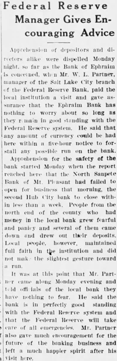 Federal Reserve Manager Gives Encouraging Advice Apprehension of depositors and directors alike were dispelled Monday night. SO far as the Bank of Ephraim is concerned. when Mr. W. Partner, manager of the Salt Lake City branch of the Federal Reserve Bank. paid the local institution visit and gave assurance that the Ephraim Bank has nothing to worry about so long as they main in good standing with the Federal Reserve system. He said that any amount of currency could be had here within a five-hour notice to forstall any possible run on the bank. Apprehension for the safety of the bank started Monday when the report reached here that the North Sanpete Bank of Mt. Pleasant had failed to open for business that morning, the second Hub City bank to close within less than a week. People from the north end of the county who had money in the local bank grew fearful and panicy and several of them came down and drew out their deposits. Local people, however. maintained full faith in the institution and did not mak the slightest gesture toward run. It was at this point that Mr. Partner came along Monday evening and offi ials of the local bank they have nothing to fear. He said the bank is in perfectly good standing with the Federal Reserve system and that the Federal Reserve will take of all emergencies. Mr. Partner also gave much encouragement for the future of the banking business and left much happler spirit after his visit here.