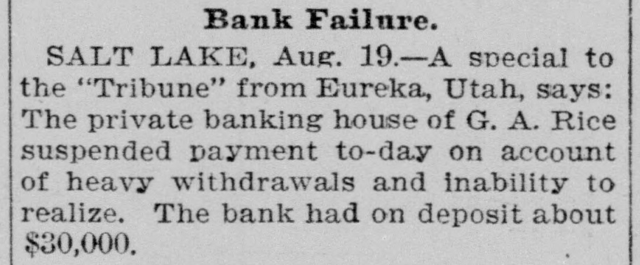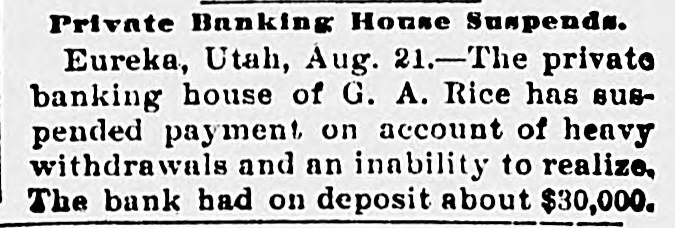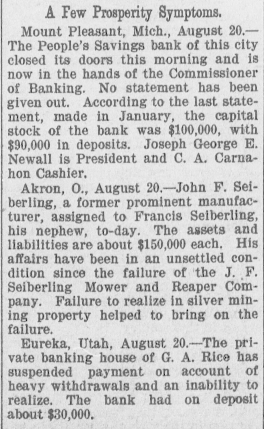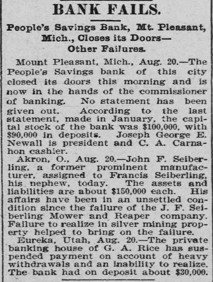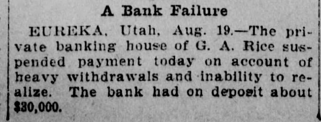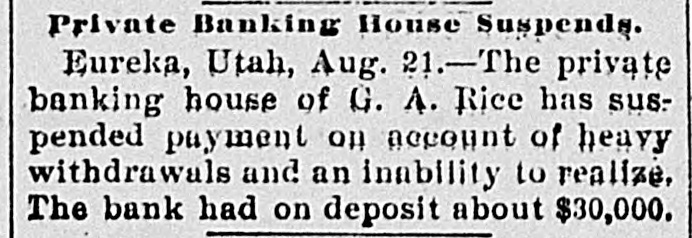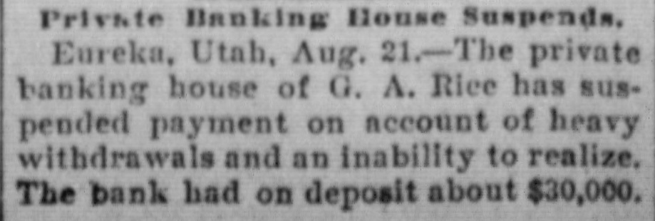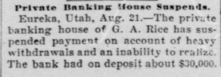 NEW YORK MINING STOCKS. Cholor $0 60 Ontario $3 00 Crown Point 53 15 Ophir Con. Cal. & Va 15 1 05 Plymouth Deadwood 1 00 95 Quicksilver 10 00 Gould & Curry 33 do pfd 50 Hale & Norcross. 90 Sierra Nevada Homestake 29 00 Standard 1 55 Iron Silver 32 30 Union Con. 28 Mexican 20 Yellow Jacket BOSTON MINING SHARES. 1 Allouez Min. Co Franklin 161/2 Atlantic 24 21 Kearsarge Boston & Mont Osceola 38 1437/8 118 Butte & Boston 275/8 Quincy Calumet & Hecla.415 Tamarack 135 Centennial 9 Wolverine 13 1/2 FOREIGN FINANCIAL. NEW YORK, Aug. 20.-Evening Post's London financial cablegram: The stock markets here were irregular today, with an improving tendency on the better news from India. Americans, however, closed flat in the street on the absence of New York support. Sales by recent purchasers here are not being pressed, but there will be no initiative for a rise until New York gives a fresh lead. The recovery in silver and silver stocks is regarded as comewhat artificial. Foreigners were better, a feature being the recovery in Brazils on improved exchange. Kaffirs were hard at the close, on reports in good quarters that Kruger is regarding the concessions more favorably. NEW YORK MONEY. NEW YORK, Aug. 20.-Money on call easy at 11/4@11/2 per cent; last loan, 11/4; close 11/4 per cent. Prime mercantile paper, 33/4@41/2 per cent. Sterling exchange, steady, with actual business in bankers' bills at $4.85% @4.853/4 for demand and at $4.831/@4.8334 for 60 days. Posted rates, $4.841/2@4.86, and $4.861/2@4.87. Commercial bills, $4.82. Silver certificates, 50@521/2c. Bar 523/c. silver, Mexican dollars, 401/2c. BRACE IN SILVER. NEW YORK, Aug. 20.-There was a sharp recovery in the price of silver today, bar silver opening in London at 241/2 pence, an advance of 7-16 of a penny. The opening price here for bar silver was 523/c, a rise of 3/4c. Mexican dollars were quoted this morning at 401/2c, against 397/80 yesterday. Yesterday's low level invited buying, which induced the recovery, but the market is reported rather weak at the rise. SAVINGS BANK SUSPENDS. MOUNT PLEASANT, Mich., Aug. 20.-The People's Savings bank, of this city, closed its doors this morning, and is now in the hands of the commissioner of banking. No statement has been given out. According to the last statement, made in January, the capital stock of the bank was $100,000, with $90,000 in deposits. George E. Newell is president, and C. A. Carnahan cashier. BANK CLEARINGS. St. Paul $669,812.84. Minneapolis, $1,157,268. Chicago, $14,845,336. New York. $98,897,744. Boston, $13,531,925. PRIVATE BANK FAILS. EUREKA, Utah., Aug. 20.-The private banking house of G. A. Rice has suspended payment on account of heavy withdrawals and inability to realize. The bank had on deposit about $30,000. CHICAGO MONEY. CHICAGO Aug. 20.-New York exchange, 40c discount. Sterling exchange, posted rates, $4.841/2 and $4.861/2. TREASURY STATEMENT. WASHINGTON. Aug. 20.-Today's statement of the condition of the treasury shows: Available cash, $220,915,183; gold reserve, $143,052,321.
