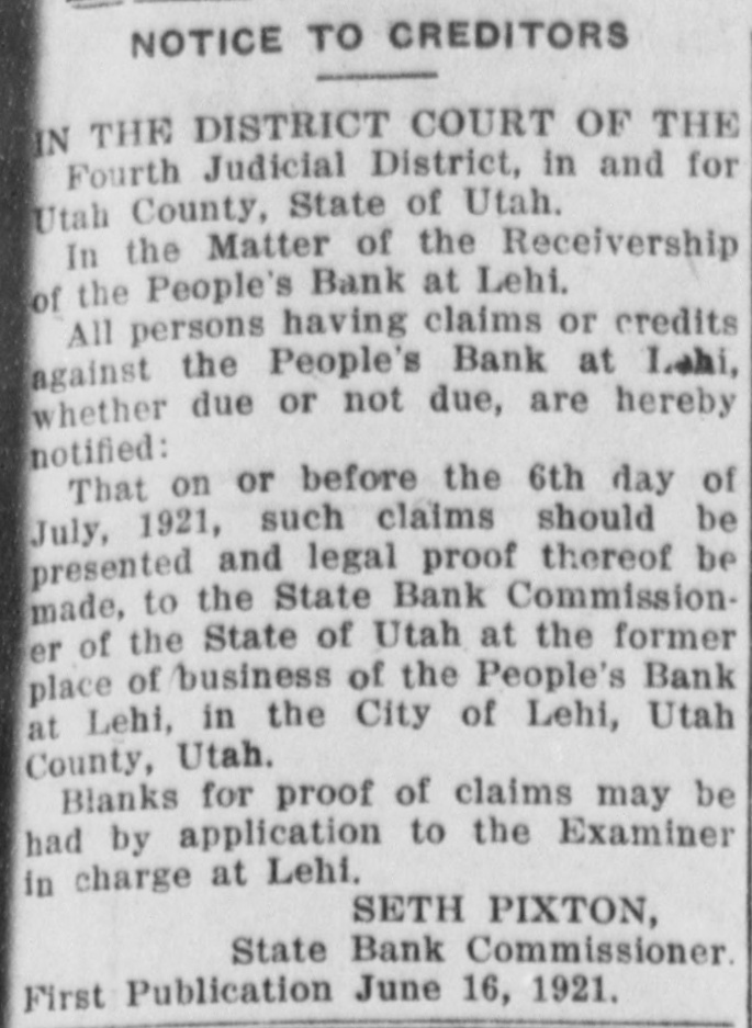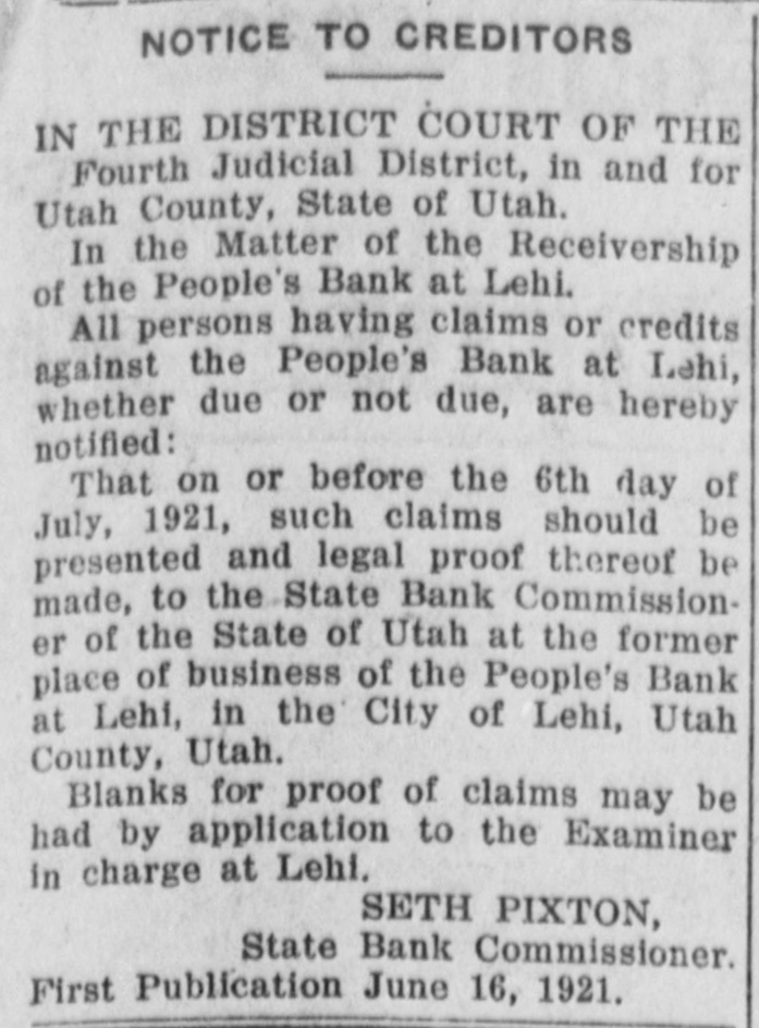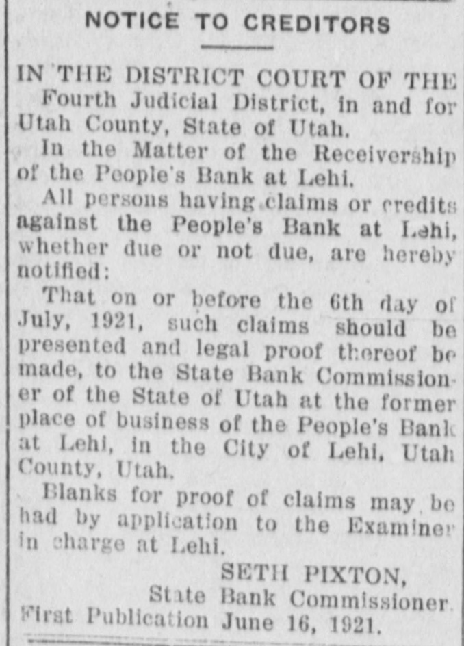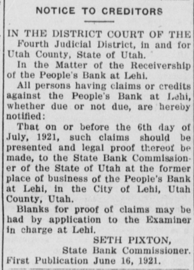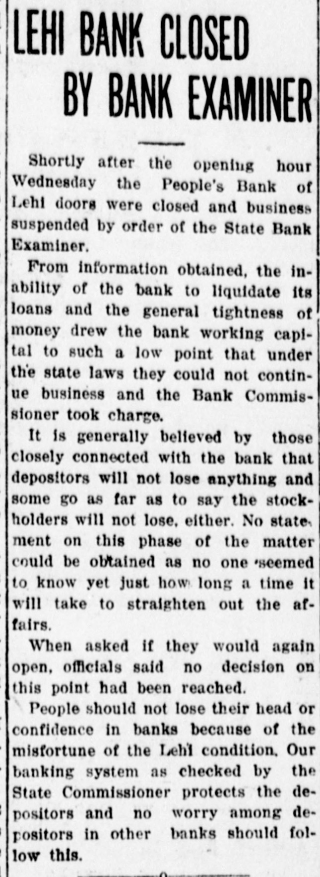 LEHI BANK CLOSED BY BANK EXAMINER Shortly after the opening hour Wednesday the People's Bank of Lehi doors were closed and business suspended by order of the State Bank Examiner. From information obtained, the inability of the bank to liquidate its loans and the general tightness of money drew the bank working capital to such a low point that under the state laws they could not continue business and the Bank Commissioner took charge. It is generally believed by those closely connected with the bank that depositors will not lose anything and some go as far as to say the stockholders will not lose, either. No state. ment on this phase of the matter could be obtained as no one 'seemed to know yet just how long a time it will take to straighten out the affairs. When asked if they would again open, officials said no decision on this point had been reached. People should not lose their head or confidence in banks because of the misfortune of the Lehi condition. Our banking system as checked by the State Commissioner protects the depositors and no worry among depositors in other banks should follow this.