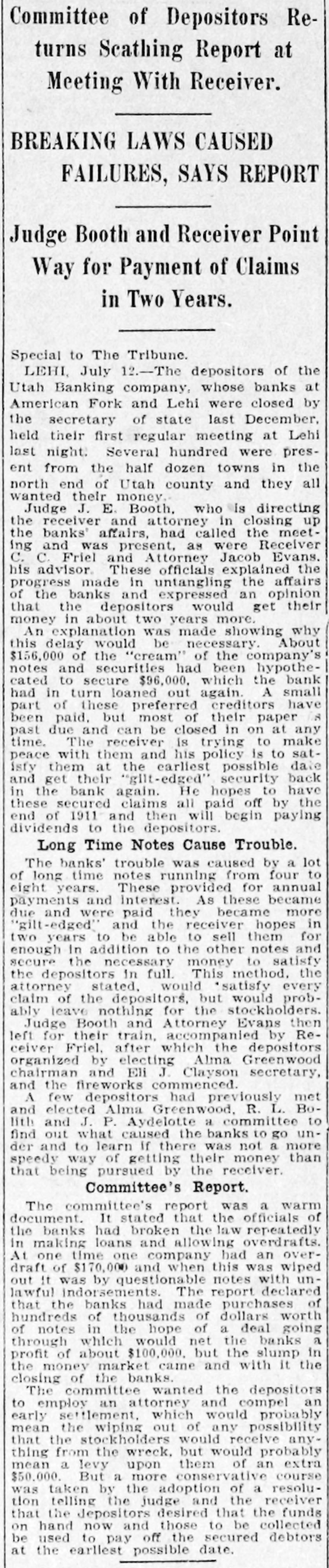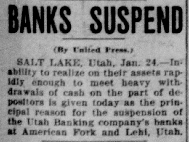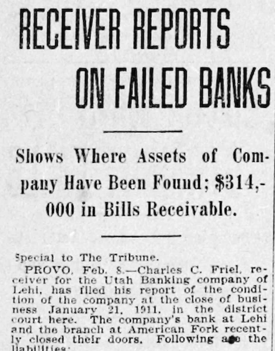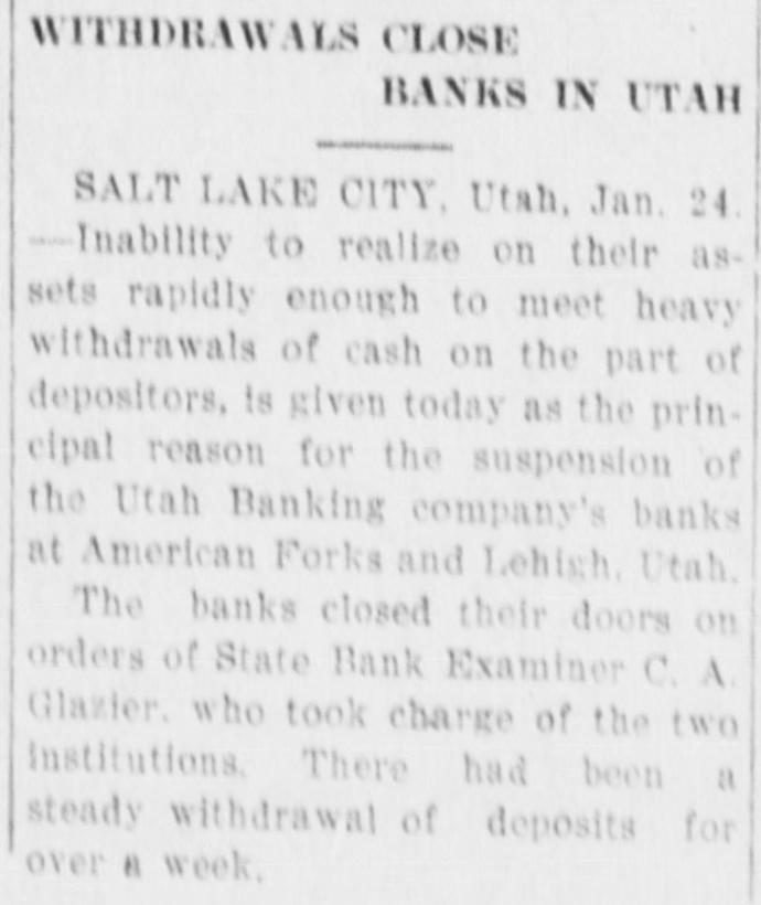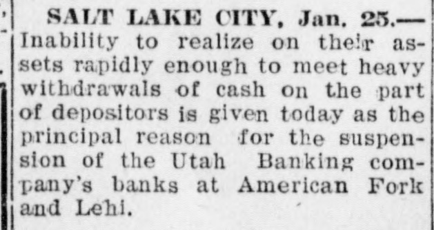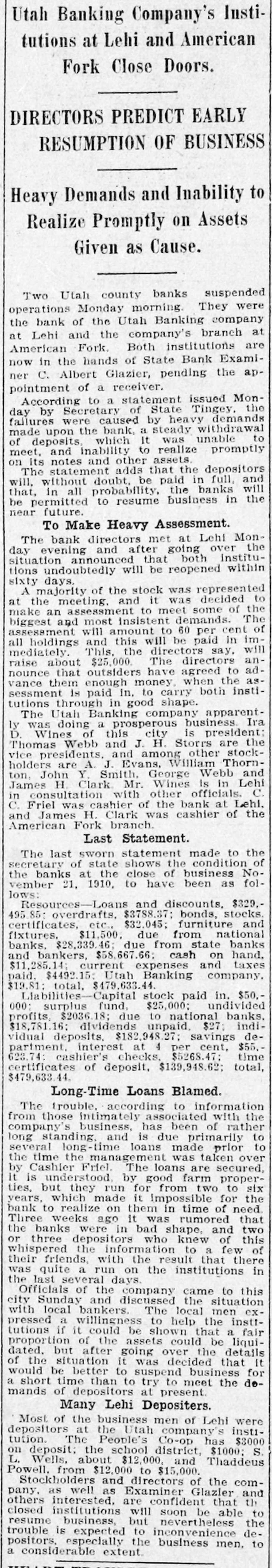 Utah Banking Company's Institutions at Lehi and American Fork Close Doors. DIRECTORS PREDICT EARLY RESUMPTION OF BUSINESS Heavy Demands and Inability to Realize Promptly on Assets Given as Cause. Two Utah county banks suspended operations Monday morning. They were the bank of the Utah Banking company at Lehi and the company's branch at American Fork. Both institutions are now in the hands of State Bank Examiner C. Albert Glazier, pending the appointment of a receiver. According to a statement issued Monday by Secretary of State Tingey. the failures were caused by heavy demands made upon the bank, a steady withdrawal to of deposits, which It was unable meet, and inability to realize promptly on its notes and other assets. The statement adds that the depositors will, without doubt, be paid in full, and that, in all probability, the banks will be permitted to resume business in the near future. To Make Heavy Assessment. The bank directors met at Lehi Monday evening and after going over the situation announced that both institutions undoubtedly will be reopened within sixty days. A majority of the stock was represented at the meeting. and it was decided to make an assessment to meet some of the biggest and most insistent demands. The assessment will amount to 60 per cent of all holdings and this will be paid in immediately. This. the directors say. will raise about $25,000. The directors announce that outsiders have agreed to advance them enough money. when the assessment is paid in. to carry both institutions through in good shape. The Utah Banking company apparently was doing a prosperous business Ira D. Wines of this city is president: Thomas Webb and J. H. Storrs are the vice presidents. and among other stockholders are A. J. Evans, William Thornton, John Y. Smith, George Webb and James H. Clark Mr. Wines Is in Lehi in consultation with other officials. C. C. Friel was cashier of the bank at Lehi. and James H. Clark was cashier of the American Fork branch. Last Statement. The last sworn statement made to the secretary of state shows the condition of the banks at the close of business November 21, 1910, to have been as follows: Resources-Loans and discounts, $329.495.85: overdrafts. $3788.37; bonds, stocks. certificates, etc., $32.045; furniture and fixtures. $11,500. due from national banks. $28,339.46; due from state banks and bankers, $58,667.66: cash on hand, $11,285.14; current expenses and taxes paid, $4492.15: Utah Banking company. $19.81: total, $479,633.44. Liabilities-Capital stock paid in. $50,000: surplus fund, $25,000; undivided profits, $2036.18; due to national banks. $18,781.16; dividends unpaid, $27: individual deposits, $182,948.27; savings department. interest at 4 per cent, $55.623.74: cashier's checks, $5268.47; time certificates of deposit, $139,948.62; total, $479,633.44. Long-Time Loans Blamed. The trouble. according to information from those intimately associated with the company's business, has been of rather long standing, and is due primarily to several long-time loans made prior to the time the management was taken over by Cashier Friel. The loans are secured, It is understood, by good farm properties, but they run for from two to six years, which made it Impossible for the bank to realize on them in time of need. Three weeks ago it was rumored that the banks were in bad shape, and two or three depositors who knew of this whispered the information to a few of their friends, with the result that there was quite a run on the institutions in the last several days. Officials of the company came to this city Sunday and discussed the situation with local bankers. The local men expressed a willingness to help the instttutions if it could be shown that a fair