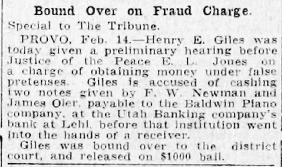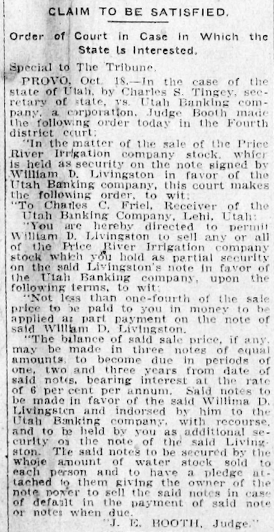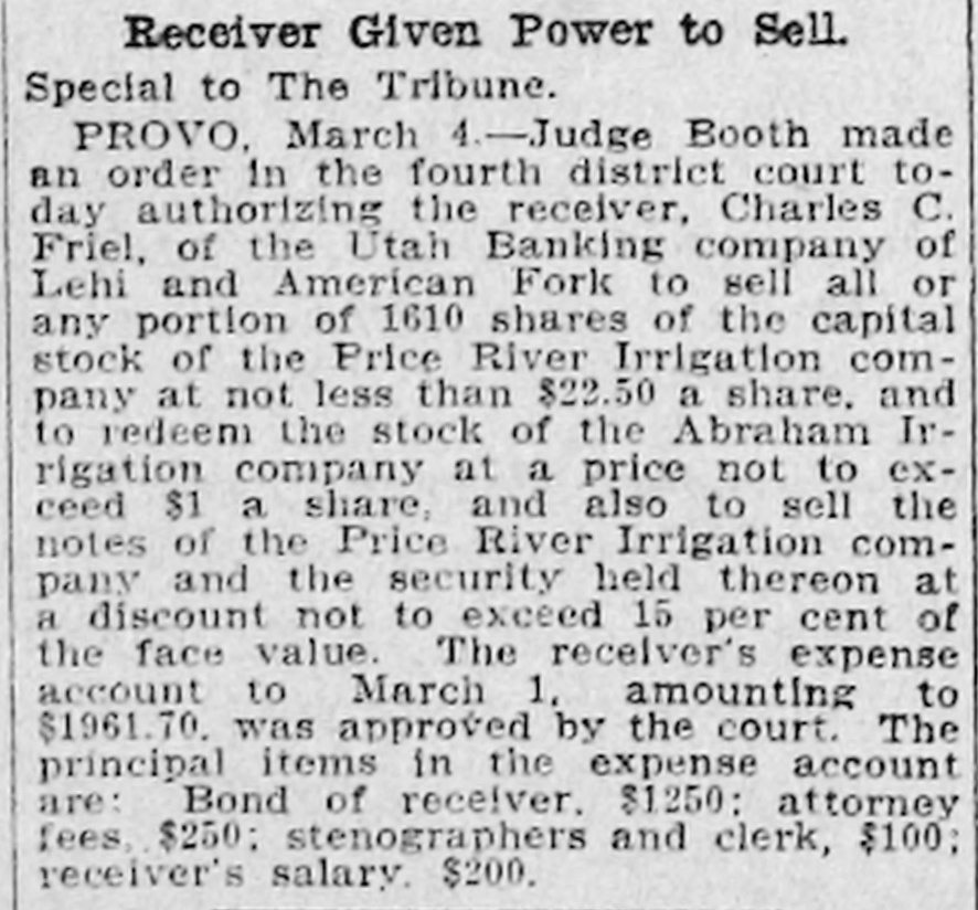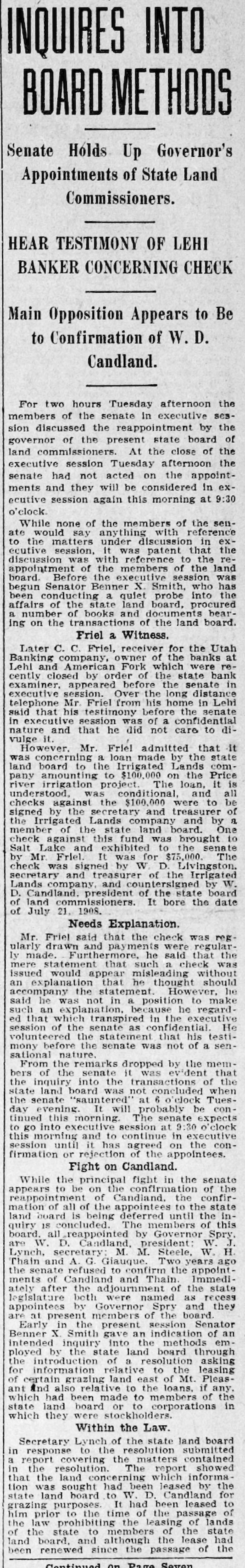 Utah Banking Company's Institutions at Lehi and American Fork Close Doors. DIRECTORS PREDICT EARLY RESUMPTION OF BUSINESS Heavy Demands and Inability to Realize Promptly on Assets Given as Cause. Two Utah county banks suspended operations Monday morning. They were the bank of the Utah Banking company at Lehi and the company's branch at American Fork. Both institutions are now in the hands of State Bank Examiner C. Albert Glazier, pending the appointment of a receiver. According to a statement issued Monday by Secretary of State Tingey. the failures were caused by heavy demands made upon the bank, a steady withdrawal to of deposits, which It was unable meet, and inability to realize promptly on its notes and other assets. The statement adds that the depositors will, without doubt, be paid in full, and that, in all probability, the banks will be permitted to resume business in the near future. To Make Heavy Assessment. The bank directors met at Lehi Monday evening and after going over the situation announced that both institutions undoubtedly will be reopened within sixty days. A majority of the stock was represented at the meeting. and it was decided to make an assessment to meet some of the biggest and most insistent demands. The assessment will amount to 60 per cent of all holdings and this will be paid in immediately. This. the directors say. will raise about $25,000. The directors announce that outsiders have agreed to advance them enough money. when the assessment is paid in. to carry both institutions through in good shape. The Utah Banking company apparently was doing a prosperous business Ira D. Wines of this city is president: Thomas Webb and J. H. Storrs are the vice presidents. and among other stockholders are A. J. Evans, William Thornton, John Y. Smith, George Webb and James H. Clark Mr. Wines Is in Lehi in consultation with other officials. C. C. Friel was cashier of the bank at Lehi. and James H. Clark was cashier of the American Fork branch. Last Statement. The last sworn statement made to the secretary of state shows the condition of the banks at the close of business November 21, 1910, to have been as follows: Resources-Loans and discounts, $329.495.85: overdrafts. $3788.37; bonds, stocks. certificates, etc., $32.045; furniture and fixtures. $11,500. due from national banks. $28,339.46; due from state banks and bankers, $58,667.66: cash on hand, $11,285.14; current expenses and taxes paid, $4492.15: Utah Banking company. $19.81: total, $479,633.44. Liabilities-Capital stock paid in. $50,000: surplus fund, $25,000; undivided profits, $2036.18; due to national banks. $18,781.16; dividends unpaid, $27: individual deposits, $182,948.27; savings department. interest at 4 per cent, $55.623.74: cashier's checks, $5268.47; time certificates of deposit, $139,948.62; total, $479,633.44. Long-Time Loans Blamed. The trouble. according to information from those intimately associated with the company's business, has been of rather long standing, and is due primarily to several long-time loans made prior to the time the management was taken over by Cashier Friel. The loans are secured, It is understood, by good farm properties, but they run for from two to six years, which made it Impossible for the bank to realize on them in time of need. Three weeks ago it was rumored that the banks were in bad shape, and two or three depositors who knew of this whispered the information to a few of their friends, with the result that there was quite a run on the institutions in the last several days. Officials of the company came to this city Sunday and discussed the situation with local bankers. The local men expressed a willingness to help the instttutions if it could be shown that a fair