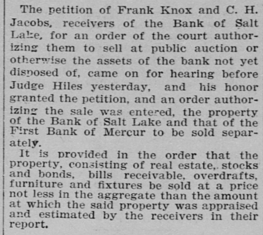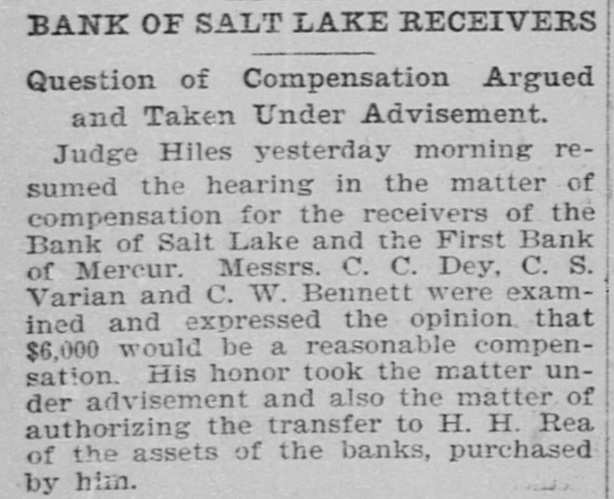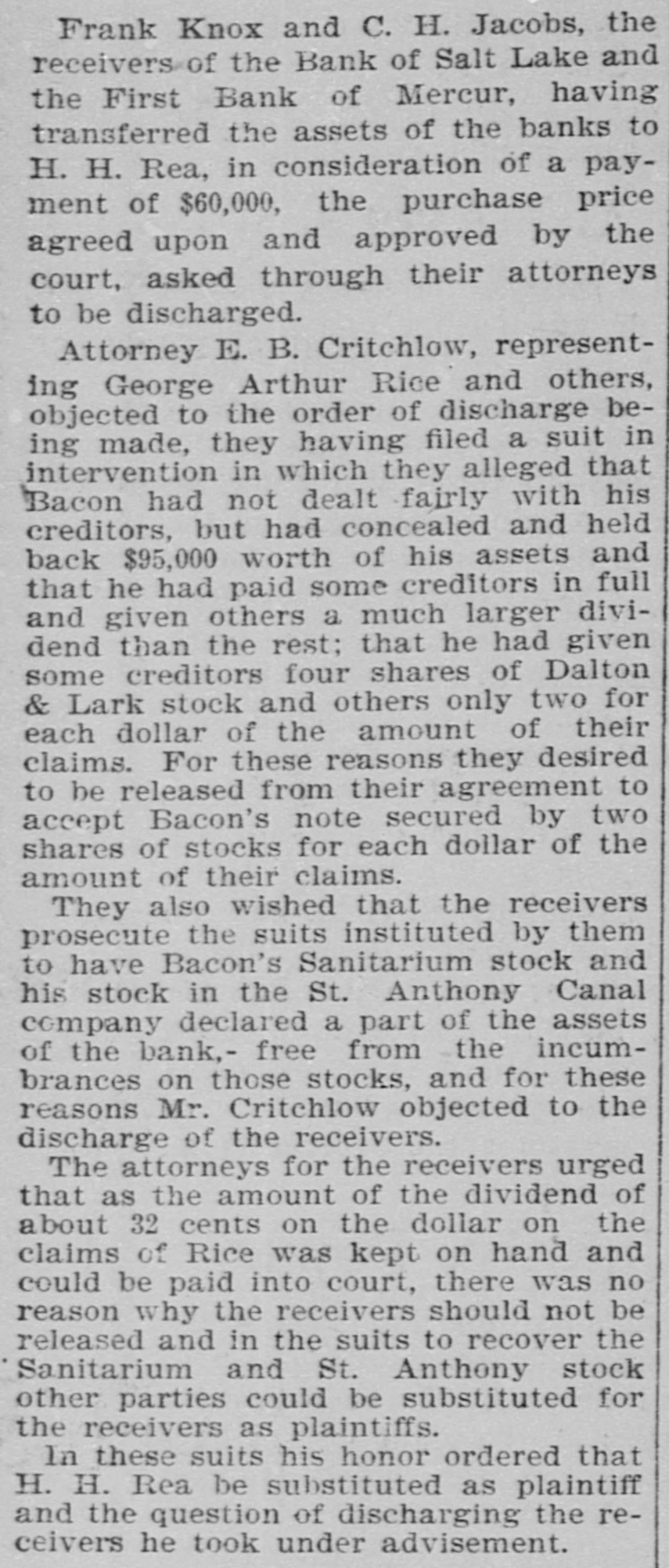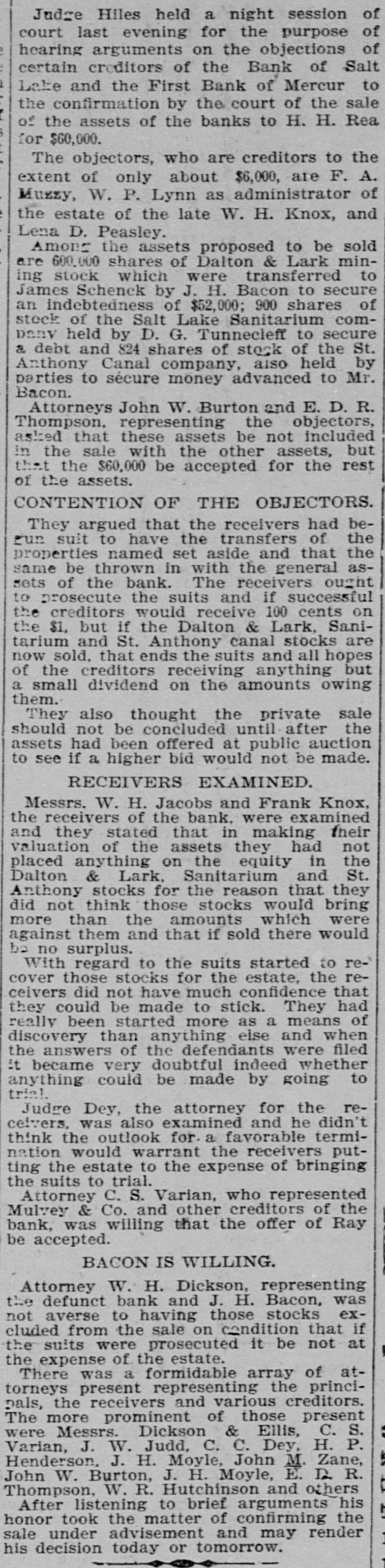 Judge Hiles held a night session of court last evening for the purpose of hearing arguments on the objections of certain creditors of the Bank of Salt Late and the First Bank of Mercur to the confirmation by the court of the sale of the assets of the banks to H. H. Rea for $60,000. The objectors, who are creditors to the extent of only about $6,000, are F. A. Muzzy, W. P. Lynn as administrator of the estate of the late W. H. Knox, and Lena D. Peasley. Amons the assets proposed to be sold are 600.000 shares of Dalton & Lark mining stock which were transferred to James Schenck by J. H. Bacon to secure an indebtedness of $52,000; 900 shares of stock of the Salt Lake Sanitarium comDany held by D. G. Tunnecleff to secure a debt and 824 shares of stock of the St. Anthony Canal company, also held by parties to sécure money advanced to Mr. Bacon. Attorneys John W. Burton and E. D. R. Thompson, representing the objectors, asked that these assets be not included in the sale with the other assets, but that the $60,000 be accepted for the rest of the assets. CONTENTION OF THE OBJECTORS. They argued that the receivers had begun suit to have the transfers of the properties named set aside and that the same be thrown in with the general assets of the bank. The receivers ought to prosecute the suits and if successful the creditors would receive 100 cents on the $1, but if the Dalton & Lark, Sanitarium and St. Anthony canal stocks are now sold, that ends the suits and all hopes of the creditors receiving anything but a small dividend on the amounts owing them. They also thought the private sale should not be concluded until after the assets had been offered at public auction to see if a higher bid would not be made. RECEIVERS EXAMINED. Messrs. W. H. Jacobs and Frank Knox, the receivers of the bank, were examined and they stated that in making their valuation of the assets they had not placed anything on the equity in the Dalton & Lark, Sanitarium and St. Anthony stocks for the reason that they did not think those stocks would bring more than the amounts which were against them and that if sold there would be no surplus. With regard to the suits started to recover those stocks for the estate, the receivers did not have much confidence that they could be made to stick. They had really been started more as a means of discovery than anything else and when the answers of the defendants were filed it became very doubtful indeed whether anything could be made by going to trial. Judge Dey, the attorney for the receivers, was also examined and he didn't think the outlook for. a favorable termination would warrant the receivers putting the estate to the expense of bringing the suits to trial. Attorney C. S. Varian, who represented Mulvey & Co. and other creditors of the bank, was willing that the offer of Ray be accepted. BACON IS WILLING. Attorney W. H. Dickson, representing the defunct bank and J. H. Bacon, was not averse to having those stocks excluded from the sale on condition that if the suits were prosecuted it be not at I the expense of the estate. There was a formidable array of attorneys present representing the principals, the receivers and various creditors. The more prominent of those present were Messrs. Dickson & Ellis, C. S. .. Varian, J. W. Judd, C. C. Dey, H. P. w Henderson, J. H. Moyle, John M. Zane, John W. Burton, J. H. Moyle, E. In R. t Thompson, W. R. Hutchinson and others After listening to brief arguments his b honor took the matter of confirming the sale under advisement and may render 1 his decision today or tomorrow.