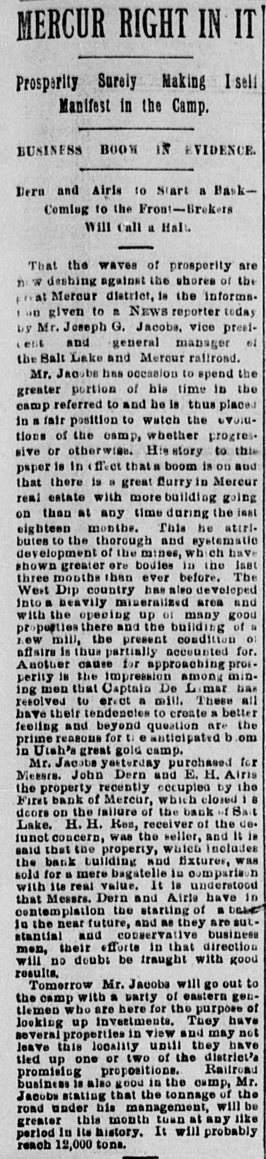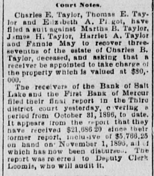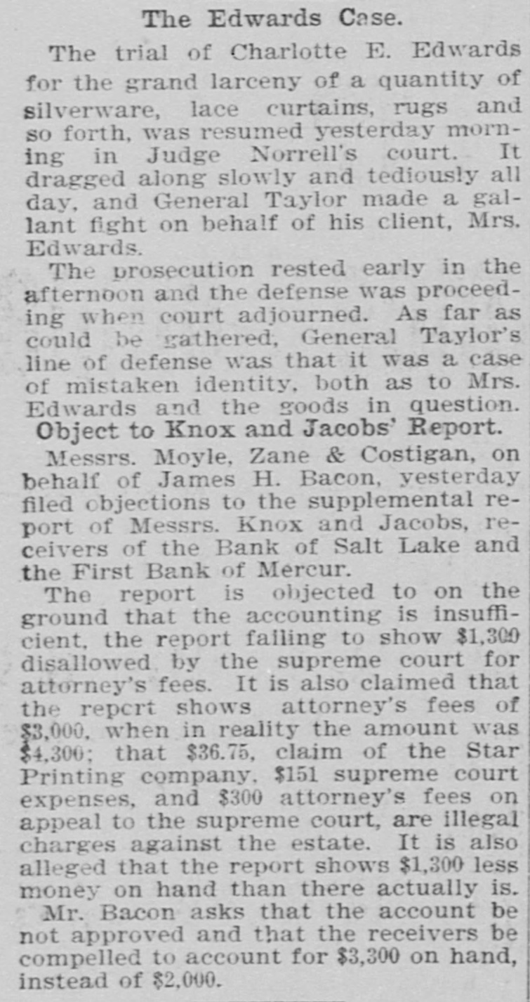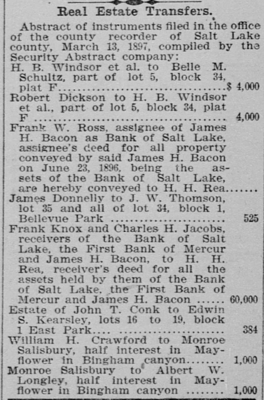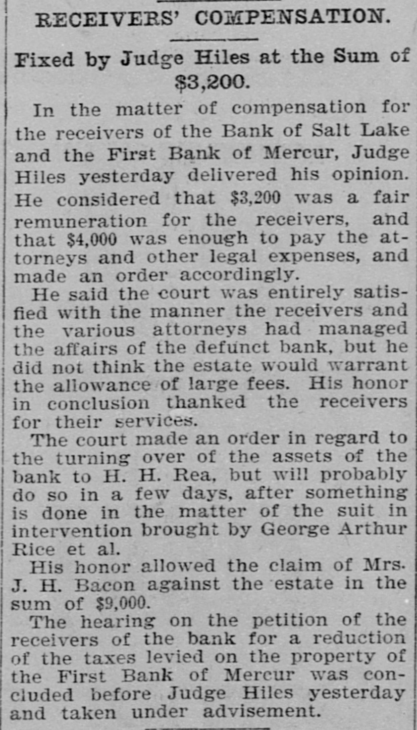 Judge Hiles held a night session of court last evening for the purpose of hearing arguments on the objections of certain creditors of the Bank of Salt Late and the First Bank of Mercur to the confirmation by the court of the sale of the assets of the banks to H. H. Rea for $60,000. The objectors, who are creditors to the extent of only about $6,000, are F. A. Muzzy, W. P. Lynn as administrator of the estate of the late W. H. Knox, and Lena D. Peasley. Amons the assets proposed to be sold are 600.000 shares of Dalton & Lark mining stock which were transferred to James Schenck by J. H. Bacon to secure an indebtedness of $52,000; 900 shares of stock of the Salt Lake Sanitarium comDany held by D. G. Tunnecleff to secure a debt and 824 shares of stock of the St. Anthony Canal company, also held by parties to sécure money advanced to Mr. Bacon. Attorneys John W. Burton and E. D. R. Thompson, representing the objectors, asked that these assets be not included in the sale with the other assets, but that the $60,000 be accepted for the rest of the assets. CONTENTION OF THE OBJECTORS. They argued that the receivers had begun suit to have the transfers of the properties named set aside and that the same be thrown in with the general assets of the bank. The receivers ought to prosecute the suits and if successful the creditors would receive 100 cents on the $1, but if the Dalton & Lark, Sanitarium and St. Anthony canal stocks are now sold, that ends the suits and all hopes of the creditors receiving anything but a small dividend on the amounts owing them. They also thought the private sale should not be concluded until after the assets had been offered at public auction to see if a higher bid would not be made. RECEIVERS EXAMINED. Messrs. W. H. Jacobs and Frank Knox, the receivers of the bank, were examined and they stated that in making their valuation of the assets they had not placed anything on the equity in the Dalton & Lark, Sanitarium and St. Anthony stocks for the reason that they did not think those stocks would bring more than the amounts which were against them and that if sold there would be no surplus. With regard to the suits started to recover those stocks for the estate, the receivers did not have much confidence that they could be made to stick. They had really been started more as a means of discovery than anything else and when the answers of the defendants were filed it became very doubtful indeed whether anything could be made by going to trial. Judge Dey, the attorney for the receivers, was also examined and he didn't think the outlook for. a favorable termination would warrant the receivers putting the estate to the expense of bringing the suits to trial. Attorney C. S. Varian, who represented Mulvey & Co. and other creditors of the bank, was willing that the offer of Ray be accepted. BACON IS WILLING. Attorney W. H. Dickson, representing the defunct bank and J. H. Bacon, was not averse to having those stocks excluded from the sale on condition that if the suits were prosecuted it be not at I the expense of the estate. There was a formidable array of attorneys present representing the principals, the receivers and various creditors. The more prominent of those present were Messrs. Dickson & Ellis, C. S. .. Varian, J. W. Judd, C. C. Dey, H. P. w Henderson, J. H. Moyle, John M. Zane, John W. Burton, J. H. Moyle, E. In R. t Thompson, W. R. Hutchinson and others After listening to brief arguments his b honor took the matter of confirming the sale under advisement and may render 1 his decision today or tomorrow.