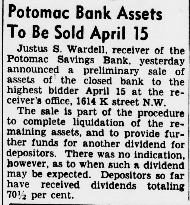 Potomac Bank Assets To Be Sold April 15 Justus S. Wardell, receiver of the Potomac Savings Bank, yesterday announced a preliminary sale of assets of the closed bank to the highest bidder April 15 at the receiver's office, 1614 K street N.W. The sale is part of the procedure to complete liquidation of the remaining assets, and to provide further funds for another dividend for depositors. There was no indication, however, as to when such a dividend may be expected. Depositors so far have received dividends totaling 70 1/2 per cent.