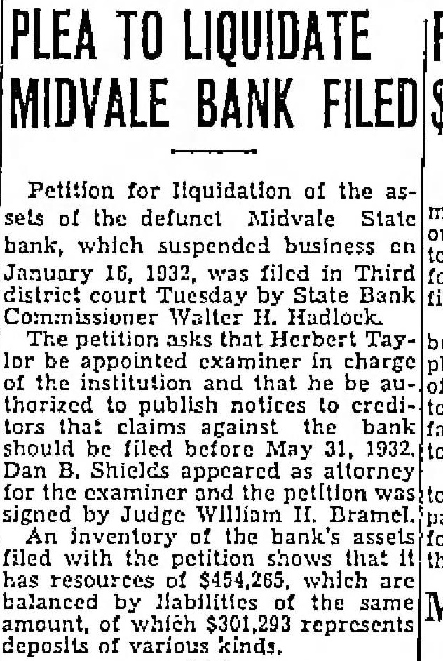 TO LIQUIDATE MIDVALE BANK FILED Petition for liquidation of the assets of the defunct Midvale State bank, which suspended business January 16, 1932, was filed in Third district court Tuesday by State Bank Walter Hadlock petition asks that Herbert lor be appointed examiner in charge of the institution and that he be thorized to publish notices to creditors that bank should be filed before May 31, 1932. Dan Shields appeared attorney examiner the signed by Judge William H. Bramel. An of the bank's assets filed with the petition shows that of which are balanced by Mabilities of the same amount, which represents deposits of various kinds.