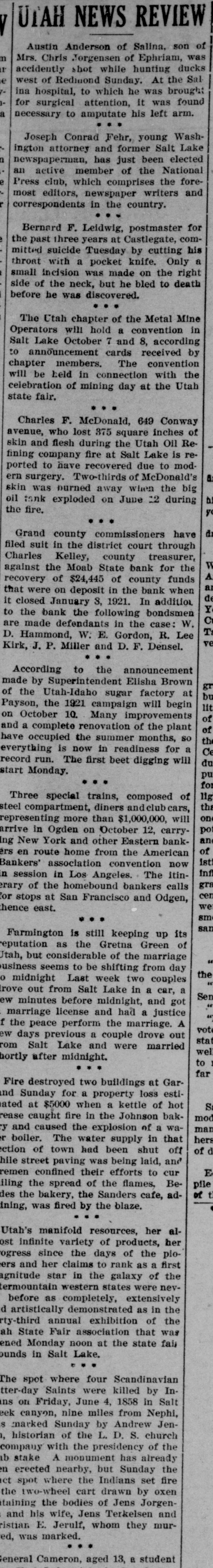 UTAH NEWS REVIEW V Anderson of Salina, son of in Mrs. Chris Jorgensen of was I Austin hunting Ephriam, accidently shot while ducks west of Redmond Sunday. At the Sal ina hospital, to which he was brought for surgical attention, it was found necessary to amputate his left arm. Joseph Conrad Fehr, young Washington attorney and former Salt Lake newspaperman, has just been elected an active member of the National Press club, which comprises the foremost editors, newspaper writers and correspondents in the country. Bernard F. Leidwig, postmaster for the past three years at Castlegate, committed suicide Tuesday by cutting his throat with a pocket knife. Only a small incision was made on the right side of the neck, but he bled to death before he was discovered. The Utah chapter of the Metal Mine Operators will hold a convention in Salt Lake October 7 and 8, according to announcement cards received by chapter members. The convention will be held in connection with the celebration of mining day at the Utah state fair. Charles F. McDonald, 649 Conway who lost 375 square inches of and flesh during the Reavenue, skin Utah Lake Oil is fining company fire at Salt reported to have recovered due to moda ern surgery. Two-thirds of McDonald's skin was Durned away when the big bi oil tank exploded on June 12 during the fire. you di Grand county commissioners have filed suit in the district court through Kelley, county treasurer, W the Moab State A Charles against county bank for funds the recovery of $24,445 of a de were on deposit in the bank when 3, 1921. Y that it closed January In bondsmen addition C to the bank the following W. defendants in the case: T W: E. Gordon, Lee ve D. are Hammond, made F. Densel. R. Kirk, J. P. Miller and D. According to the announcement gr made by Superintendent Elisha Brown at bu of the Utah-Idaho sugar factory lit Payson, the 1921 campaign will begin of on October 10. Many improvements of and a complete renovation of the plant th have occupied the summer months, so Ce everything is now in readiness for will a du record run. The first beet digging start Monday. pu for lig Three special trains, composed of the on steel compartment, diners and club cars, will representing more than $1,000,000, pot an arrive in Ogden on October 12, carry- bankNew York and other Eastern of ist! ers ing en route home from the American now infl Bankers' association convention itingra in session in Los Angeles. The calls of the homebound bankers cen we for erary stops at San Francisco and Odgen, hence east. sm ... san Farmington is still keeping up its of reputation as the Gretna Green Utah, but considerable of the marriage day the usiness seems to be shifting from couples midnight Last week two a Sen o out from Salt Lake in a car, ew rove minutes before midnight, and justice got marriage license and had a A vot f the peace perform the marriage. out stat days previous a couple drove married well rom ew Salt Lake and were to hortly after midnight. far Fire destroyed two buildings loss at Gar- estiS nd Sunday for a property of hot at $5000 when a kettle bakmod ated caught fire in the Johnson wamar hers rease y and caused the explosion of in a that of d boiler. The water supply off r of town had been shut and E hile etion street paving was being laid, to cur pile remen confined their efforts Be t the spread of the flames, adiling the bakery, the Sanders cafe, ining, des was fired by the blaze. Utah's manifold resources, her her alinfinite variety of products, the pioost since the days of first ogress her claims to rank as of a the ers and star in the galaxy termountain agnitude western states extensively were nevas completely. in the before demonstrated as of d annual exhibition rty-third artistically association that was the Fair fair ened ah State Monday noon at the state bunds in Salt Lake. spot where four Scandinavian by InThe Saints were killed in Salt eek tter-day Friday, June 4, 1858 Nephi, Jenns on canyon, Sunday nine miles by Andrew from S. church is marked of the L. D. of the 1, historian with the presidency already company monument has the b stake A but Sunday en erected Indians set nearby, the fire spot where drawn by oxen ct two-wheel cart Jorgenthe the bodies of Jens and taining wife, Jens Terkelsen muristian and his E. Jerulf, whom they ed, was marked. eneral Cameron, aged 13, B student