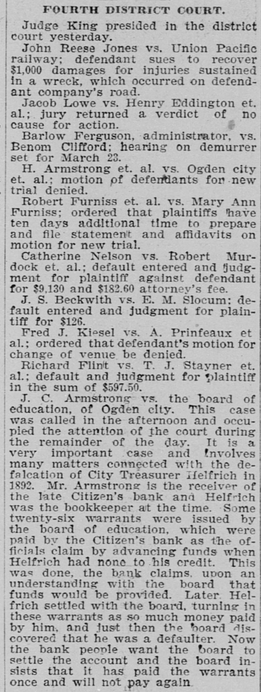 # FOURTH DISTRICT COURT. Judge King presided in the district court yesterday. John Reese Jones vs. Union Pacific railway; defendant sues to recover $1,000 damages for injuries sustained in a wreck, which occurred on defendant company's road. Jacob Lowe vs. Henry Eddington et. al.; jury returned a verdict of no cause for action. Barlow Ferguson, administrator, vs. Benom Clifford; hearing on demurrer set for March 23. H. Armstrong et. al. vs. Ogden city et. al.; motion of defendants for new trial denied. Robert Furniss et. al. vs. Mary Ann Furniss; ordered that plaintiffs have ten days additional time to prepare and file statement and affidavits on motion for new trial. Catherine Nelson vs. Robert Murdock et. al.; default entered and judgment for plaintiff against defendant for $9,130 and $182.60 attorney's fee. J. S. Beckwith vs. E. M. Slocum; default entered and judgment for plaintiff for $126. Fred J. Kiesel vs. A. Prinfeaux et al.; ordered that defendant's motion for change of venue be denied. Richard Flint vs. T. J. Stayner et. al.; default and judgment for plaintiff in the sum of $597.50. J. C. Armstrong vs. the board of education, of Ogden city. This case was called in the afternoon and occupied the attention of the court during the remainder of the day. It is a very important case and involves many matters connected with the defalcation of City Treasurer Helfrich in 1892. Mr. Armstrong is the receiver of the late Citizen's bank and Helfrich was the bookkeeper at the time. Some twenty-six warrants were issued by the board of education, which were paid by the Citizen's bank as the officials claim by advancing funds when Helfrich had none to his credit. This was done, the bank claims, upon an understanding with the board that funds would be provided. Later. Helfrich settled with the board, turning in these warrants as so much money paid by him, and just then the board discovered that he was a defaulter. Now the bank people want the board to settle the account and the board insists that it has paid the warrants once and will not pay again