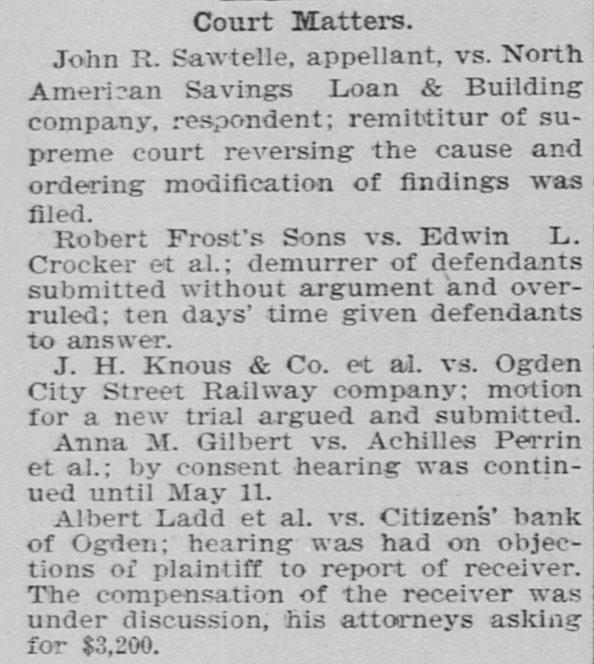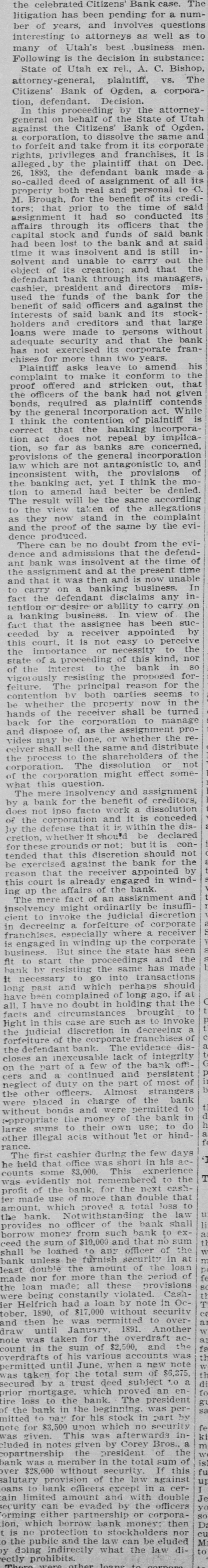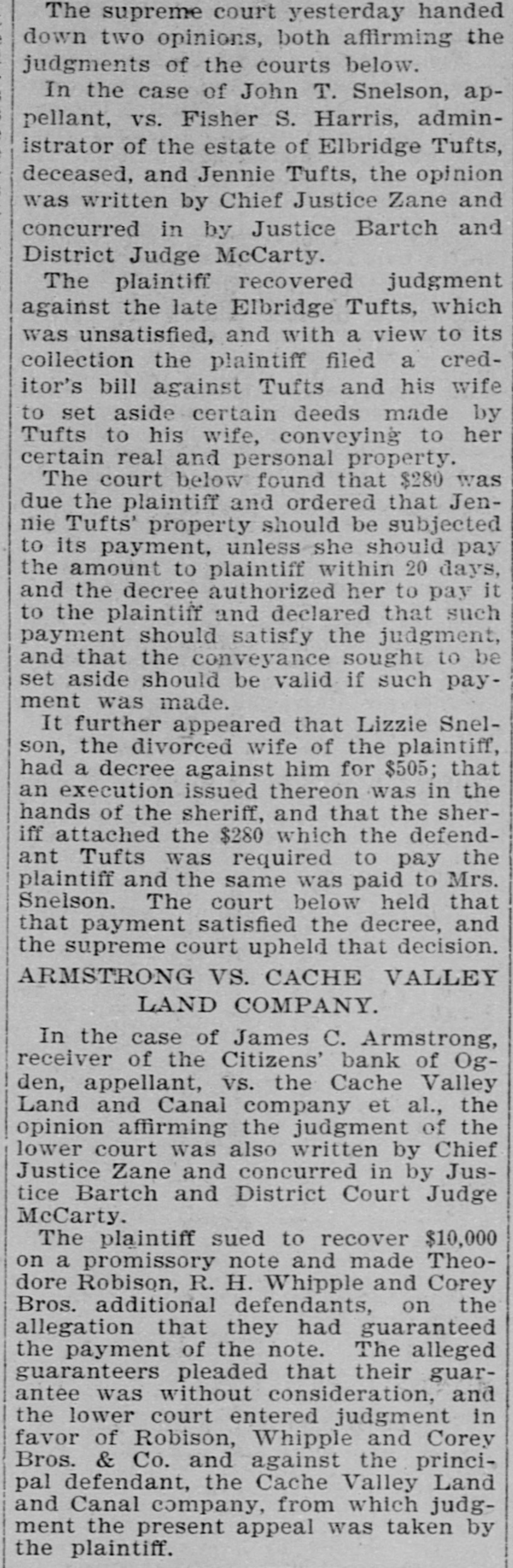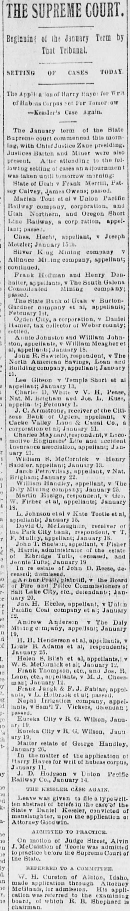 THE SUPREME COURT. Beginning of the January Term by That Tribunal. TODAY. CASES OF SETTING The Applica Harry Haye for Writ of Habens Corpus Set For Tomor ow -Kessler's Case Again. The January term of the State Supreme court commenced this morning, with Chief Justice Zane presiding. Justices Bartch and Miner were also present. After attending to the following setting of cases an adjournmen was taken until tomorrow morning: State of Utah V Frank Merrill, Pat. sey Calvey, James Owens; passed. Mariah Tout et ai V Union Pacific Railway company, corporation, and Utah Northern, and Oregon Short Line Railway, a corp ration, appellant; passed. Chas, Hecht, appellant, V Joseph Metzler; January 15th. Silver King Mining company V Allinace Mising company, appellant; continued. Frank Hoffman and Henry Dan. halter, appeilants, V The South Galena Consoltuated Mining company; passed. The State Bank of Utah V BurtonGardner company et ai, appellants; February 1st. Orden City, a corporation, V Daniel Hamer, tax collector of Weber county; settled. Annie Johnston and William Johnston, appellante, V William Meagher et al, appellants; January 18. John R. Sawtelle, respondent, V The North American Savings, Loan and Building company, appeliant; January 21. Lee Gibson V Temple Short et al appellant; January 13, Charles D. White V V. H. Pease, Nat. M. Brigham and Jos. L. Kuss, appella to; February 1. J. C. Armstrong, receiver of the Citizens Bank of Ogden, appellant, V Cache Valley Land & Canal Co., a corporation et al; January 21. Charles Maynard, respondent, V Loco. motive Engineers' Life and accident Insurance association, appellant; January 21. William S. MeCornick V Henry Saddler, appeliant; January 13. Jacob Petrovitsky, appellant, V Nat. Brigham; January 22. William Handley, appellant, V The Dily Mining company; January 25. Martin Ensign, respondent, V Geo. W. Fisher et al, appellants; January 18. L. Johnson etal V Kate Tootle et al, appellants; January 15. David C. McLaughiin, receiver of the Park City bank, respondent, V T. F. Mulloy, appellant; January 18. John T. Snelson, appellant, V Fisher 8. Harris, administrator of the estate of Elbridge Tuft, deceased, and Jennie Tufts; January 19 In re estate of John D. Reese, de. ceased; dismissed. platoriff, V the Board of Fire and Police Commissioners of Salt Lake City, etc., delendant; January 20. Jno. H. Eccles, appellant, V Union Pacific Coal company et a; January 22. Andrew Anderson V The Daly Mining e mpany, appellant; January n 19. H. H. Henderson et al, appellants, V Louis B. Adams et al, respondents; January 25. Helen S. Bilsh et al, appellants, V W.S. McCornick ot al; January 12. Frank Thompson, etc., and Jos. R. Lane, etc., appellants, V M. J. Chees. man; January 12. Franz Jungk & F.J. Fabian, appelants, V L. Holbrook et a; passed. Nephi Irrigation company, appellants, V Sam'l T. Vickers, delendary passed. Eureka City V R. G. Wilson, Januars 19. 10 Eureka City V R. G. Wilson, Janu ary 19, Matter estate of George Handley, January 26. In the matter of the application of Harry Hayes for writ of habeas corpus, January 11. J. D. Hodgson V Union Pecific y Rallway Co., January 14. 18 THE KESSLER CASE AGAIN. Leave was given to file a typewritten abstract of briefs in the case of the State V Daniel Kessler, convicted of manslaughter, upon the application 01 Attorney Goodwin.