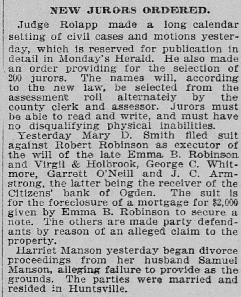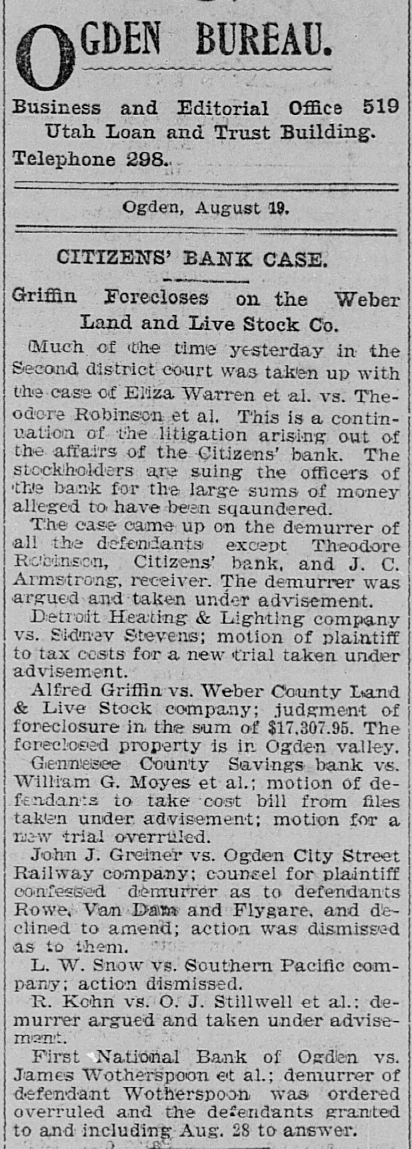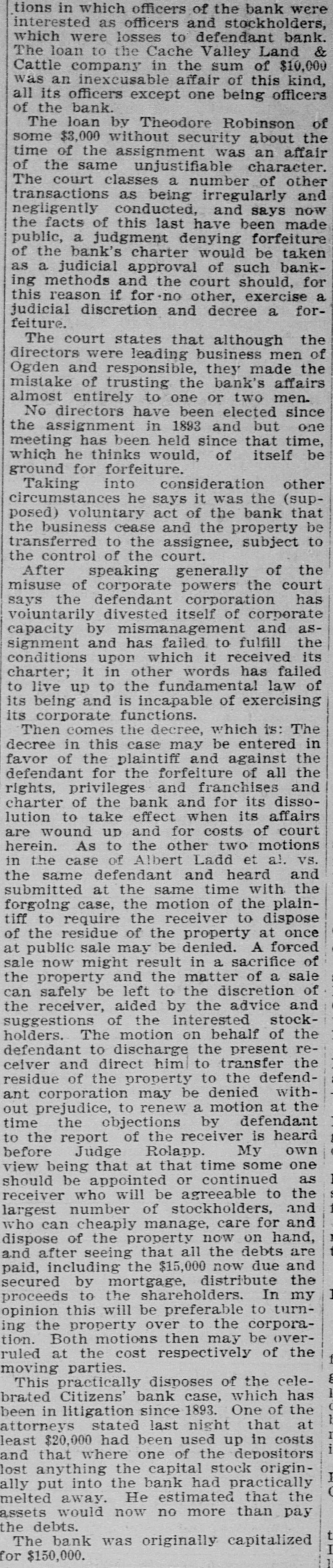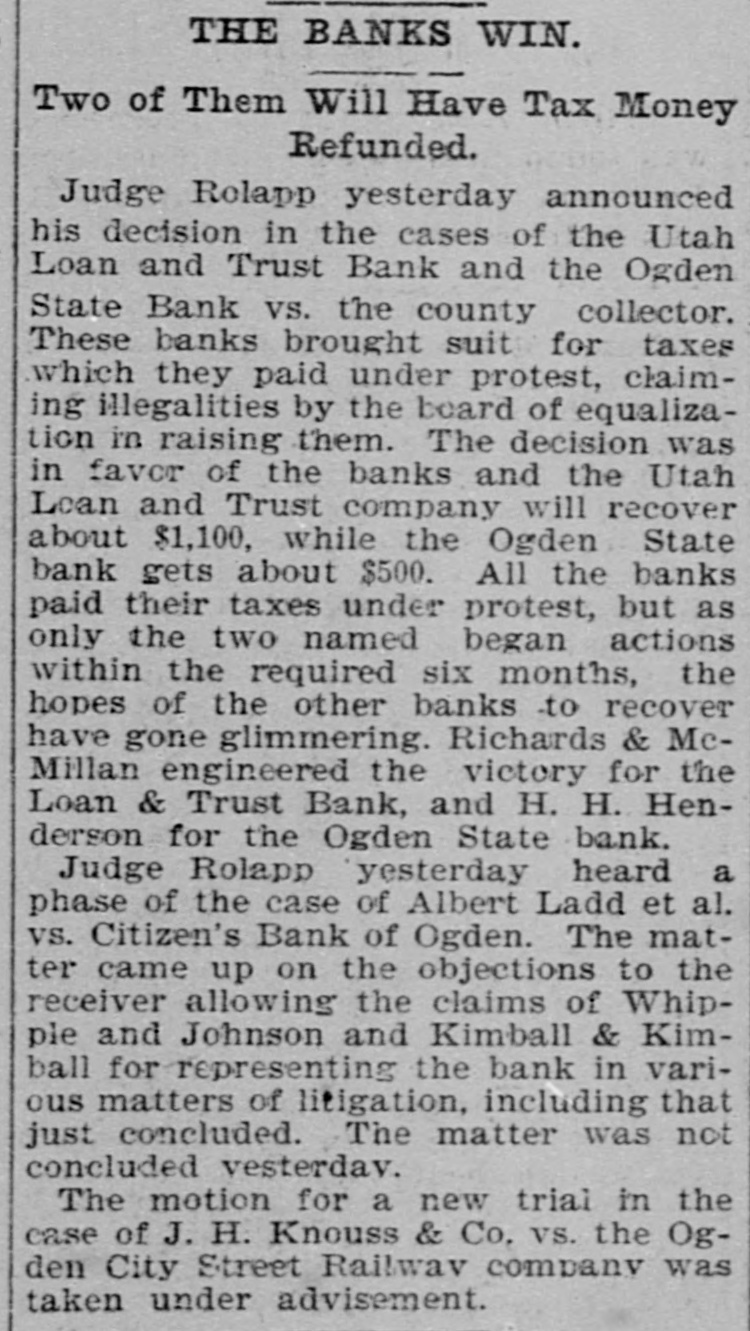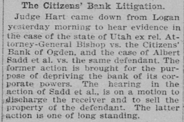 THE SUPREME COURT. Beginning of the January Term by That Tribunal. TODAY. CASES OF SETTING The Applica Harry Haye for Writ of Habens Corpus Set For Tomor ow -Kessler's Case Again. The January term of the State Supreme court commenced this morning, with Chief Justice Zane presiding. Justices Bartch and Miner were also present. After attending to the following setting of cases an adjournmen was taken until tomorrow morning: State of Utah V Frank Merrill, Pat. sey Calvey, James Owens; passed. Mariah Tout et ai V Union Pacific Railway company, corporation, and Utah Northern, and Oregon Short Line Railway, a corp ration, appellant; passed. Chas, Hecht, appellant, V Joseph Metzler; January 15th. Silver King Mining company V Allinace Mising company, appellant; continued. Frank Hoffman and Henry Dan. halter, appeilants, V The South Galena Consoltuated Mining company; passed. The State Bank of Utah V BurtonGardner company et ai, appellants; February 1st. Orden City, a corporation, V Daniel Hamer, tax collector of Weber county; settled. Annie Johnston and William Johnston, appellante, V William Meagher et al, appellants; January 18. John R. Sawtelle, respondent, V The North American Savings, Loan and Building company, appeliant; January 21. Lee Gibson V Temple Short et al appellant; January 13, Charles D. White V V. H. Pease, Nat. M. Brigham and Jos. L. Kuss, appella to; February 1. J. C. Armstrong, receiver of the Citizens Bank of Ogden, appellant, V Cache Valley Land & Canal Co., a corporation et al; January 21. Charles Maynard, respondent, V Loco. motive Engineers' Life and accident Insurance association, appellant; January 21. William S. MeCornick V Henry Saddler, appeliant; January 13. Jacob Petrovitsky, appellant, V Nat. Brigham; January 22. William Handley, appellant, V The Dily Mining company; January 25. Martin Ensign, respondent, V Geo. W. Fisher et al, appellants; January 18. L. Johnson etal V Kate Tootle et al, appellants; January 15. David C. McLaughiin, receiver of the Park City bank, respondent, V T. F. Mulloy, appellant; January 18. John T. Snelson, appellant, V Fisher 8. Harris, administrator of the estate of Elbridge Tuft, deceased, and Jennie Tufts; January 19 In re estate of John D. Reese, de. ceased; dismissed. platoriff, V the Board of Fire and Police Commissioners of Salt Lake City, etc., delendant; January 20. Jno. H. Eccles, appellant, V Union Pacific Coal company et a; January 22. Andrew Anderson V The Daly Mining e mpany, appellant; January n 19. H. H. Henderson et al, appellants, V Louis B. Adams et al, respondents; January 25. Helen S. Bilsh et al, appellants, V W.S. McCornick ot al; January 12. Frank Thompson, etc., and Jos. R. Lane, etc., appellants, V M. J. Chees. man; January 12. Franz Jungk & F.J. Fabian, appelants, V L. Holbrook et a; passed. Nephi Irrigation company, appellants, V Sam'l T. Vickers, delendary passed. Eureka City V R. G. Wilson, Januars 19. 10 Eureka City V R. G. Wilson, Janu ary 19, Matter estate of George Handley, January 26. In the matter of the application of Harry Hayes for writ of habeas corpus, January 11. J. D. Hodgson V Union Pecific y Rallway Co., January 14. 18 THE KESSLER CASE AGAIN. Leave was given to file a typewritten abstract of briefs in the case of the State V Daniel Kessler, convicted of manslaughter, upon the application 01 Attorney Goodwin.