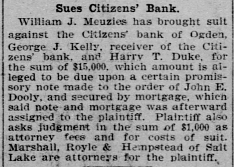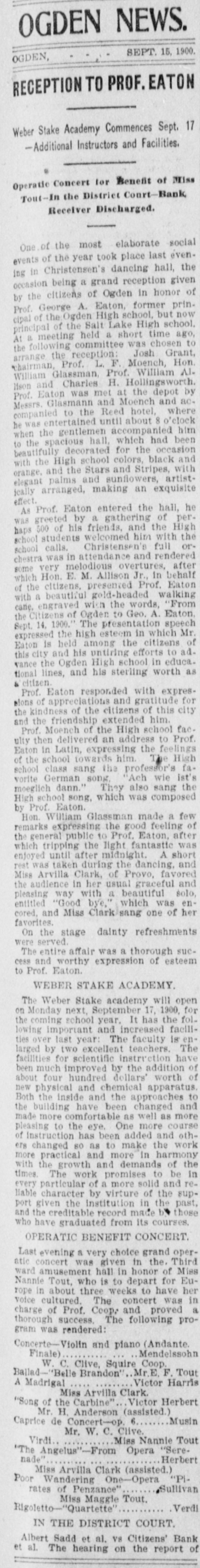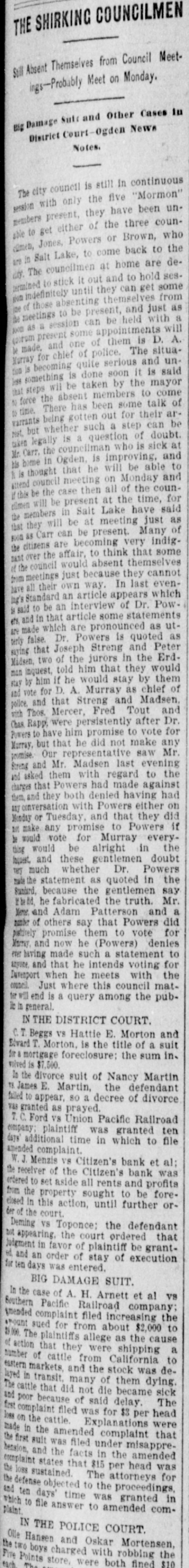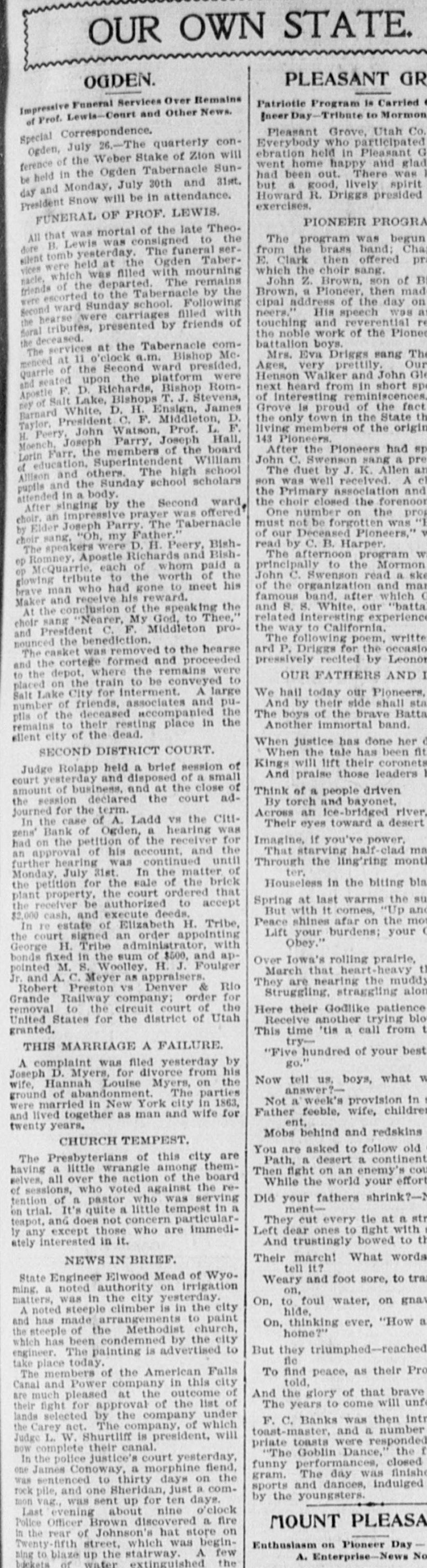 OUR OWN STAT PLEASAN OGDEN. Patriotic Program is Impressive Funeral Services Over Remains Ineer Day-Tribute to of Prof. Lewis-Court and Other News. Pleasant Grove, 1 Special Correspondence. Everybody who part Ogden, July 26.-The quarterly conebration held in Ple went home happy a ference of the Weber Stake of Zion will had been out. Ther held in the Ogden Tabernacle Sunbut a good, lively be day and Monday, July 30th and 31st. Howard R. Driggs I exercises. President Snow will be in attendance. FUNERAL OF PROF. LEWIS. PIONEER P that was mortal of the late TheoThe program was All B. Lewis was consigned to the from the brass bar dore tomb yesterday. The funeral serE. Clark then offe silent were held at the Ogden Taberwhich the choir sang vices which was filled with mourning John Z. Brown, so nacle, friends of the departed. The remains Brown, a Pioneer, t1 escorted to the Tabernacle by the cipal address of the Second were ward Sunday school. Following neers." His speech hearse were carriages filled with touching and rever floral the tributes, presented by friends of the noble work of th the deceased. battalion boys. The services at the Tabernacle comMrs. Eva Driggs e menced at 11 o'clock a.m. Bishop Mc. Ages, very prettily Quarrie of the Second ward presided. Henson Walker and seated upon the platform were next heard from in ! Apostle and F. D. Richards, Bishop Romof Salt Lake, DTd a 1 ney Barnard White, the only town in the Taylor. President C. F. Middleton, D. of ti Peery, John Watson, 1 Moench, H. Joseph Parry, After the Pioneers Lorin Farr. the members of the board John C. Swenson sai education, Superintendent William The duet by J. K. of Allison and others. The high school son was well receive pupils and the Sunday school scholars the Primary associat attended in a body. the choir closed the After singing by the Second ward One number on t choir. an impressive prayer was offered must not be forgotter by Elder Joseph Parry. The Tabernacle of our Deceased Pior choir sang. "Oh, my Father." read by C. B. Harpe The speakers were D. H. Peery, BishThe afternoon pro op Romney, Apostle Richards and Bishprincipally to the op McQuarrie, each of whom paid a John C. Swenson réa glowing tribute to the worth of the of the organization brave man who had gone to meet his famous band. after Maker and receive his reward. and S. S. White. our At the conclusion of the speaking the related interesting es choir sang 'Nearer, My God. to Thee," the way to California and President C. F. Middleton proThe following poen nounced the benediction. and P. Driggs for the The casket was removed to the hearse pressively recited by and the cortege formed and proceeded to the depot, where the remains were OUR FATHERS placed on the train to be conveyed to We hall today our I Salt Lake City for interment. A large And by their side number of friends, associates and puThe boys of the bra pils of the deceased accompanied the Another immortal remains to their resting place in the silent city of the dead. When justice has do When the tale has SECOND DISTRICT COURT. Kings will lift their Judge Rolapp held a brief session of And praise those 1 court yesterday and disposed of a small amount of business. and at the close of Think of a people dri the session declared the court adBy torch and bayor Across an ice-bridge journed for the term. In the case of A. Ladd VS the CitiTheir eyes toward zens' Bank of Ogden, a hearing was Imagine, if you've po had on the petition of the receiver for That starving half an approval of his account, and the Through the ling'rin further hearing was continued until ter. Monday, July 31st. In the matter of Houseless in the bl the petition for the sale of the brick plant property, the court ordered that Spring at last warm the receiver be authorized to accept But with it comes, $2,000 cash, and execute deeds. Peace shines afar on In re estate of Elizabeth H. Tribe, Lift your burdens the court signed an order appointing Obey." George H. Tribe administrator, with bonds fixed in the sum of $500. and apOver Iowa's rolling I pointed M. S. Woolley. H. J. Foulger March that heartJr. and A. C. Meyer as appraisers. They are nearing th Robert Preston V8 Denver & Rio Struggling, stragg! Grande Railway company; order for Here their Godlike 1 removal to the circuit court of the United States for the district of Utah Receive another tr This time 'tis a call granted. tryTHIS MARRIAGE A FAILURE. "Five hundred of y go." A complaint was filed yesterday by Joseph D. Myers, for divorce from his Now tell us, boys, wife, Hannah Louise Myers, on the answer?ground of abandonment. The parties Not a week's provi were married in New York city in 1863, Father feeble, wife, and lived together as man and wife for ent, twenty years. Mobs behind and r CHURCH TEMPEST. You are asked to foll The Presbyterians of this city are Path, a desert a e having a little wrangle among themThen fight on an ene selves, all over the action of the board While the world yo of sessions, who voted against the reDid your fathers sh tention of a pastor who was serving menton trial. It's quite a little tempest in a They cut every tie teapot, and does not concern particularLeft dear ones to figl ly any except those who are immediAnd trustingly bow ately interested in it. Their march! What NEWS IN BRIEF. tell It? State Engineer Elwood Mead of WyoWeary and foot sor on, ming. a noted authority on irrigation matters, was in the city yesterday. On, to foul water, A noted steeple climber is in the city hide. and has made arrangements to paint On, thinking ever, the steeple of the Methodist church, home?" which has been condemned by the city But they triumphedengineer. The painting is advertised to fic take place today. To find peace, as t The members of the American Falls told, Canal and Power company in this city And the glory of tha are much pleased at the outcome of The years to come their fight for approval of the list of lands selected by the company under F. C. 