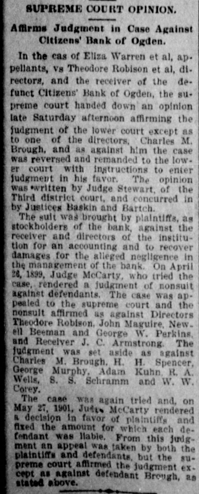 # SUPREME COURT OPINION. Affirms Judgment in Case Against Citizens' Bank of Ogden. In the cas of Eliza Warren et al, appellants, vs Theodore Robison et al, directors, and the receiver of the defunct Citizens' Bank of Ogden, the supreme court handed down an opinion late Saturday afternoon affirming the judgment of the lower court except as to one of the directors, Charles M. Brough, and as against him the case was reversed and remanded to the lower court with instructions to enter judgment in his favor. The opinion was written by Judge Stewart, of the Third district court, and concurred in by Justices Baskin and Bartch. The suit was brought by plaintiffs, as stockholders of the bank, against the receiver and directors of the institution for an accounting and to recover damages for the alleged negligence in the management of the bank. On April 26, 1899, Judge McCarty, who tried the case, rendered a judgment of nonsuit against defendants. The case was appealed to the supreme court and the nonsult affirmed as against Directors Theodore Robison, John Maguire, Newell Beeman and George W. Perkins. and Receiver J. C. Armstrong. The judgment was set aside as against Charles M. Brough. H. H. Spencer, George Murphy, Adam Kuhn, R. A. Wells, S. S. Schramm and W. W. Corey. The case was again tried and, on May 27, 1901, Judge McCarty rendered a decision in favor of plaintiffs and fixed the amount for which each defendant was liable. From this judgment an appeal was taken by both the plaintiffs and defendants, but the supreme court affirmed the judgment except as against defendant Brough, as stated above.