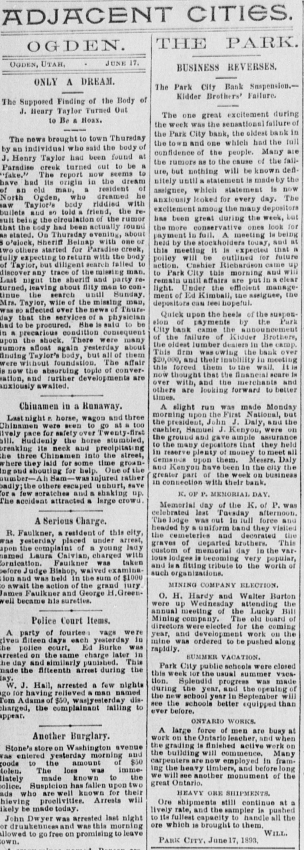 ADJACENT CITIES. THE PARK. OGDEN. JUNE 17. OGDEN, UTAH, BUSINESS REVERSES. ONLY A DREAM. The Park City Bank Suspension.Kidder Brothers' Failure. The Supposed Finding of the Body of J. Heary Taylor Turned Out The one great excitement during to Be a Hoax. the week was the sensational failure of the Park City bank, the oldest bank in The news brought to town Thursday the town and one which had the full by an individual who said the body of confidence of the people. Many are J. Henry Taylor had been found at the rumors as to the cause of the fallParadise creek turned out to be a ure, but nothing will be known defl"fake." The report NOW seems to nitely until a statement is made by the have had its origin in the dream of an old man, a resident of assignee, which statement is now North Ogden, who dreamed he anxiously looked for every day. The saw Taylor's body riddled with excitement among the many depositors bullets and BO told a friend, the rehas been great during the week, but suit being the circulation of the rumor the more conservative ones look for that the body had been actually round AR stated. On Thursday evening, about payment in full. A meeting 18 being 8 o'elock, Sheriff Belnap with one or held by the stockholders today, and at two others started for Paradise creek, this meeting it is expected that a fully expecting to return with the body polley will be outlined for future action. Cashier Richardson came up of Taylor, but diligent search failed to discover any trace of the missing man. to Park City this morning and will remain until affairs are put in a clear Last night the sheriff and party returned, leaving about nity men to conlight. Under the efficient managetinue the search until Sunday. ment of Ed Kimbali, the assignee, the Mrs. Taylor, wile of the missing man, depositors can feel hopeful. was 80 affected over the news of ThursQuick upon the heels of the suspenday that the services of a physician eion of payments by the Park had to be procured. She is said to be City bank came the announcement in a precarious condition consequent of the failure of Kidder Brothers, upon the shock. There were many the oldest lumber dealers in the camp. tumors afloat again yesterday about This firm as owing the bank over finding Taylor's body, but all of them $20,000, and their inability in meeting were without foundation. The affair this forced them to the wall. It is is now the absorbing topic of convernow thought that the financial scare is sation, and further developments are over with, and the merchants and anxiously awaited. others are looking forward to better times. Chinamen in a Runaway. A slight run was made Monday morning upon the First National, but Last night P. horse, wagon and three the president, John J. Daiy, and the Chinamen were seen to go at a too cashier, Samuel J. Kenyon, were on lively pace for safety over Twenty-first the ground and gave ample assurance bill. Suddenly the horse stumbled, to the many depositors that they held breaking its neck and precipitating in reserve plenty of money to meet all the three Chinamen into the street, demands upon them. Messre. Daly where they jaid for some time grownand Kenyou have been In the city the and shouting for help. One of the greater part of the week on business number-Ah injured rather in connection with their bank. badly;the others escaped unburt, save for a few soratches and a shaking up. K. OF P. MEMORIAL DAY. The accident attracted a large crowu. Memorial day of the K. of P. was celebrated last Tuesday afternoon. The lodge was out In full force and A Serious Charge. headed by a uniform band they visited R. Faulkner, a resident of this city, the cemeteries and decorated the was yesterday placed under arrest, graves of departed brothers. This upon the complaint of a young lady custom of memorial day in the var. named Laura Calvian, charged with lous lodges is becoming very popular, Cornication. Faulkner was taken and lan fitting tribute to the worth of before Judge Bishop, waived examinasuch organizations. ion and was held in the sum of $1000 MINING COMPANY ELECTION. to await the action of the grand jury James Faulkner and George H. GreenO. H. Hardy and Walter Burton well became his sureties. were up Wednesday attending the annual meeting of the Lucky Bill Mining company. The old board of Police Court Items. directors were elected for the coming A party of fourtee vaga were year, and development work on the given fliteen days each yesterday in mine was ordered to be pushed along the police court. Ed Burke was rapidly. Arrested on the same charge later in SUMMER VACATION. the day and similarly punished. This Park City public schools were closed nade the fifteenth arrest during the this week for the usual summer vacalay. tion. Splendid progress was made W. J. Hall, arrested a few nights during the year, and the opening of go for having relieved a man named the new school year in September will Tom Adams of $50, washyesterday dis. see the schools better equipped than charged, the complainant failing to ever before. appear. ONTARIO WORKS. A large force of men are busy at Another Burglary. work on the Ontario leacher, and when the grading is finished active work on Stone's store on Washington avenue the building will commence. Many was entered yesterday morning and carpenters are now employed in fram. goods to the amount of $50 ing the heavy timbers, and before long tolen. The loss was immeWe will see another monument of the dately made known to the great Ontario. police. Suspicion has fallen upon two HEAVY ORE SHIPMENTS. ada who are well known for their hieving proclivities. Arrests will Ore shipments still continue at a likely be made today. lively rate, and the sampler is pushed to its fullest capacity to handle all the John Dwyer was arrested last night ore which 18 brought to them. or drunkenneas and was this morning WILL. allowed to go free on promising to leave PARK CITY, June 1893. town.