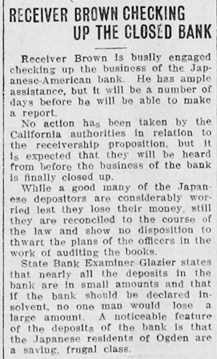 RECEIVER BROWN CHECKING UP THE CLOSED BANK Receiver Brown is busily engaged checking up the business of the Japanese-American bank. He has ample assistance, but It will be a number of days before he will be able to make a report. No action has been taken by the California authorities in relation to the receivership proposition, but it is expected that they will be heard from before the business of the bank is finally closed up. While a good many of the Japanese depositors are considerably worried lest they lose their money, still they are reconciled to the course of the law and show no disposition to thwart the plans of the officers in the work of auditing the books. State Bank Examiner Glazier states that nearly all the deposits in the bank are in small amounts and that If the bank should be declared insolvent, no one man would lose a large amount. A noticeable feature of the deposits of the bank is that the Japanese residents of Ogden are a saving, frugal class.