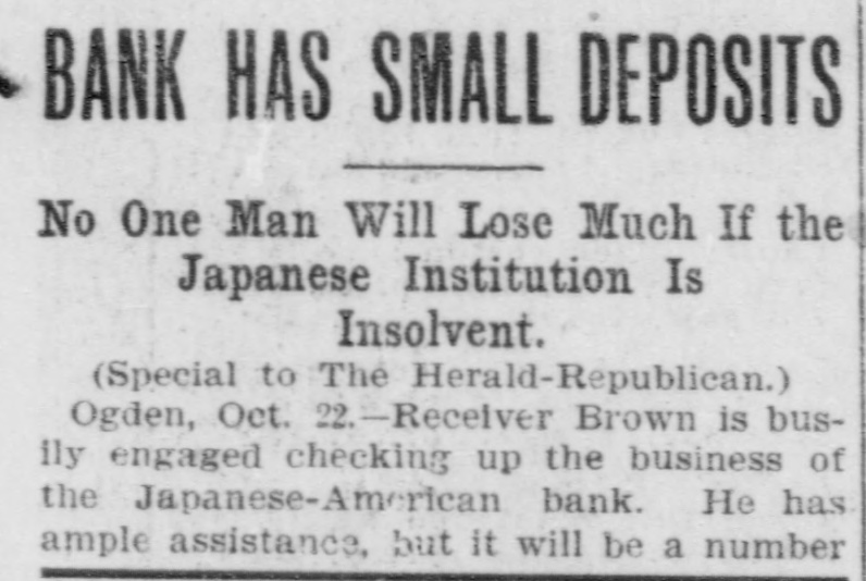 BANK HAS SMALL DEPOSITS No One Man Will Lose Much If the Japanese Institution Is Insolvent. (Special to The Herald-Republican.) Ogden, Oct. 22.-Receiver Brown is busily engaged checking up the business of the Japanese-American bank. He has ample assistance, but it will be a number