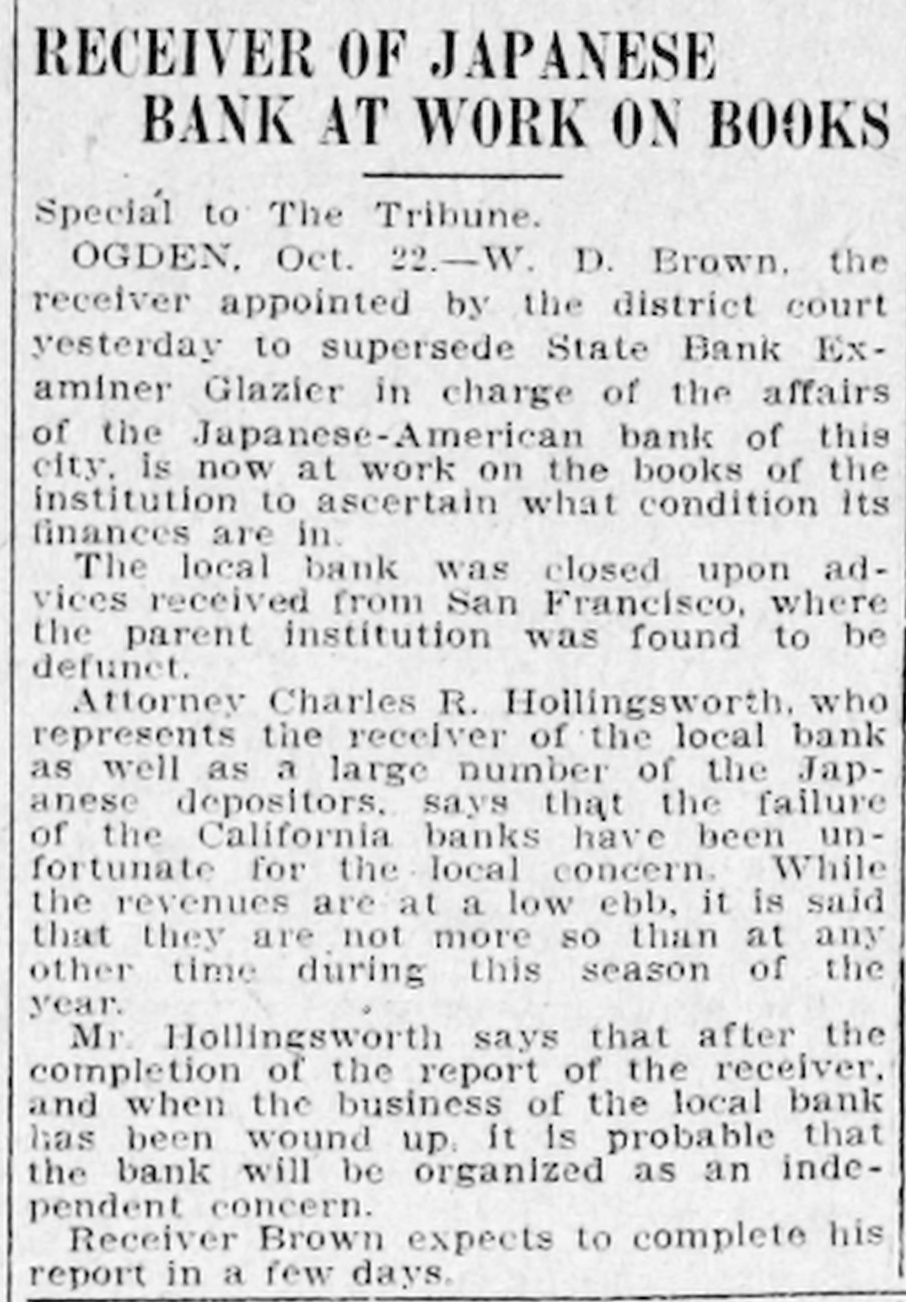 RECEIVER OF JAPANESE BANK AT WORK ON BOOKS Special to The Tribune. OGDEN, Oct. 22.W. D. Brown. the receiver appointed by the district court yesterday to supersede State Bank Examiner Glazier in charge of the affairs of the Japanese-American bank of this city. is now at work on the books of the institution to ascertain what condition its finances are in. The local bank was closed upon advices received from San Francisco, where the parent institution was found to be defunct. Attorney Charles R. Hollingsworth. who represents the receiver of the local bank as well as a large number of the Japanese depositors. says that the failure of the California banks have been unfortunate for the local concern. While the revenues are at a low ebb, it is said that they are not more 80 than at any other time during this season of the year. Mr. Hollingsworth says that after the completion of the report of the receiver, and when the business of the local bank has been wound up. it is probable that the bank will be organized as an independent concern. Receiver Brown expects to complete his report in a few days.