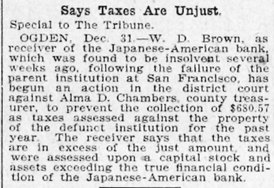 Says Taxes Are Unjust. Special to The Tribune. OGDEN, Dec. 31.-W. D. Brown, as receiver of the Japanese-American bank. which was found to be insolvent several weeks ago, following the failure of the parent institution at San Francisco, has begun an action in the district court against Alma D. Chambers, county treasurer, to prevent the collection of $680.57 as taxes assessed against the property of the defunct institution for the past year. The receiver says that the taxes are in excess of the just amount. and were assessed upon a capital stock and assets exceeding the true financial condition of the Japanese-American bank.