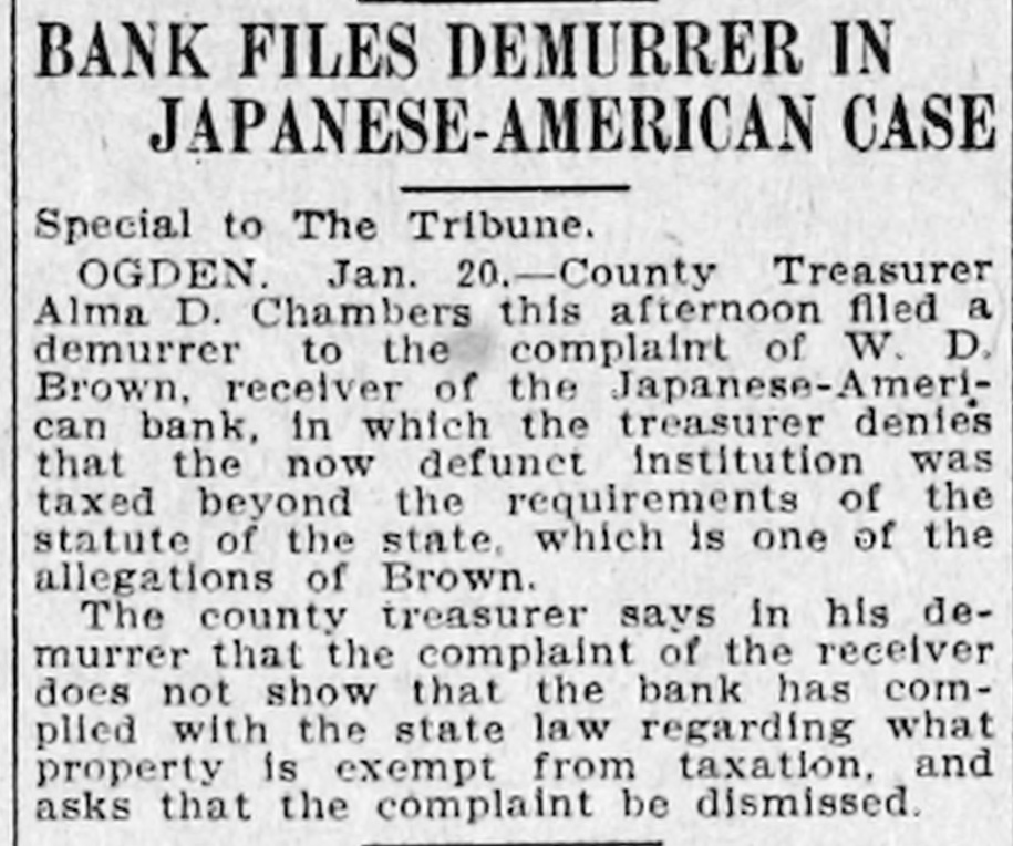BANK FILES DEMURRER IN JAPANESE-AMERICAN CASE Special to The Tribune. OGDEN. Jan. 20.-County Treasurer Alma D. Chambers this afternoon filed a demurrer to the complaint of W. D. Brown, receiver of the Japanese-American bank, in which the treasurer denies that the now defunct institution was taxed beyond the requirements of the statute of the state, which is one of the allegations of Brown. The county treasurer says in his demurrer that the complaint of the receiver does not show that the bank has complied with the state law regarding what property is exempt from taxation, and asks that the complaint be dismissed.