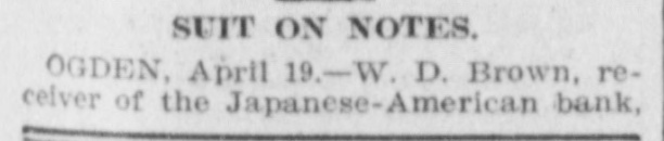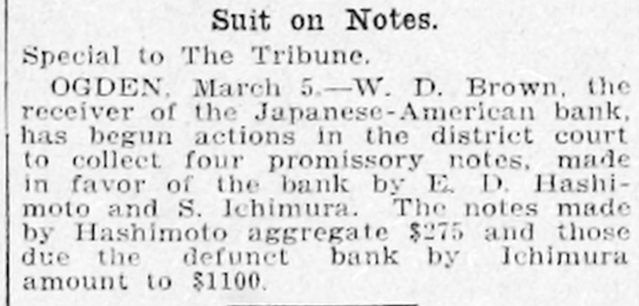 Suit on Notes. Special to The Tribune. OGDEN, March 5.-W. D. Brown, the receiver of the Japanese-American bank, has begun actions in the district court to collect four promissory notes, made in favor of the bank by E. D. Hashimoto and S. Ichimura. The notes made by Hashimoto aggregate $275 and those due the defunct bank by Ichimura amount to $1100.