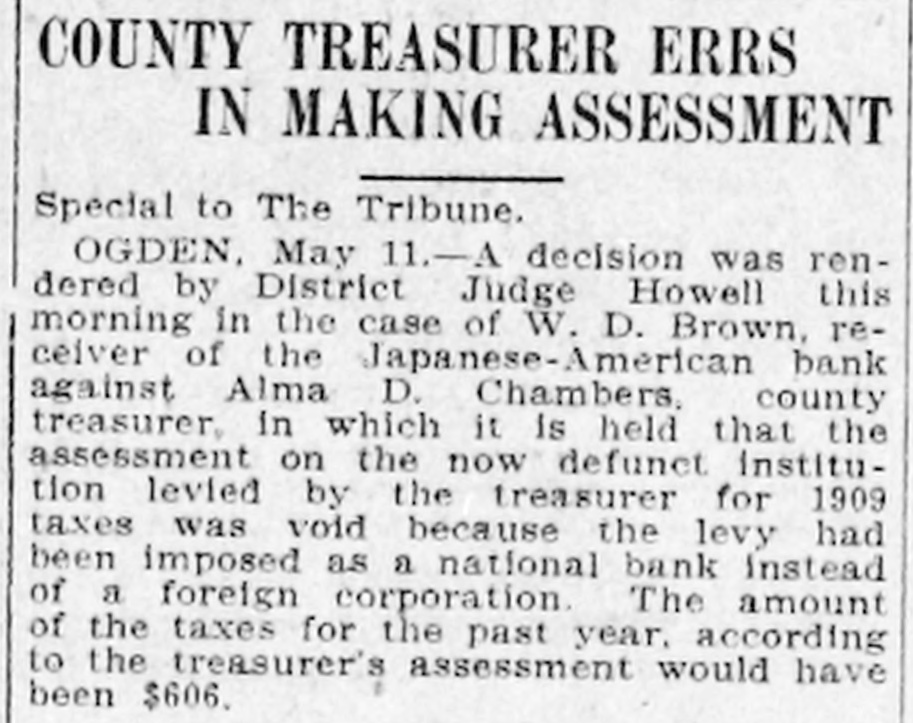 COUNTY TREASURER ERRS IN MAKING ASSESSMENT Special to The Tribune. OGDEN, May 11.-A decision was rendered by District Judge Howell this morning in the case of W. D. Brown, receiver of the Japanese-American bank against Alma D. Chambers, county treasurer, in which it is held that the assessment on the now defunct institution levied by the treasurer for 1909 taxes was void because the levy had been imposed as a national bank instead of a foreign corporation. The amount of the taxes for the past year. according to the treasurer's assessment would have been $606.