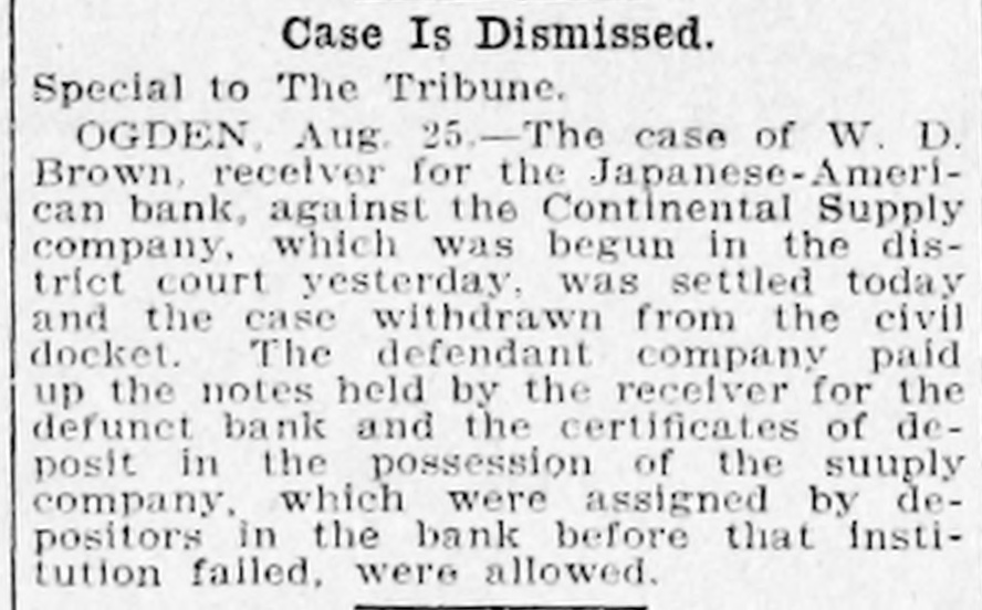 Case Is Dismissed. Special to The Tribune. OGDEN Aug. 25.-The case of W. D. Brown, receiver for the Japanese-American bank, against the Continental Supply company, which was begun in the district court yesterday, was settled today and the case withdrawn from the civil docket. The defendant company paid up the notes held by the receiver for the defunct bank and the certificates of deposit in the possession of the sumply company, which were assigned by depositors in the bank before that institution failed. were allowed.