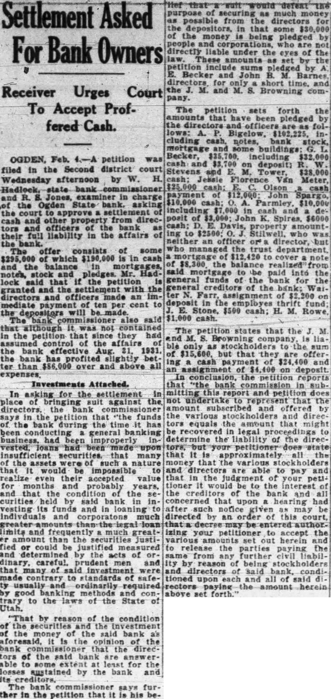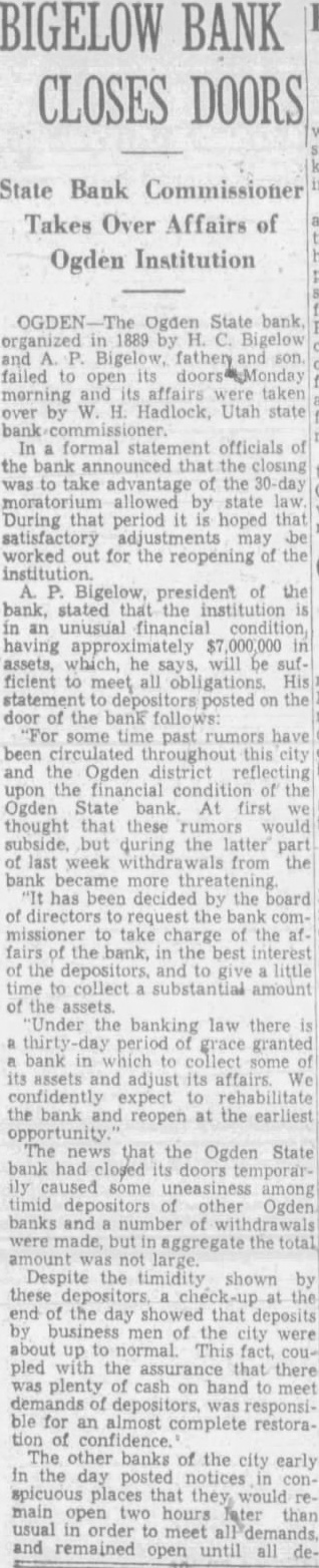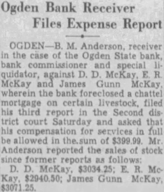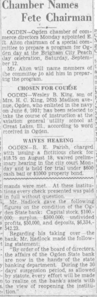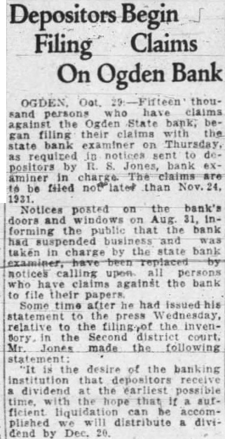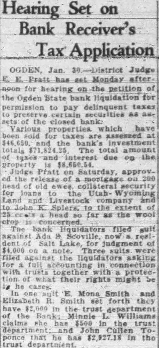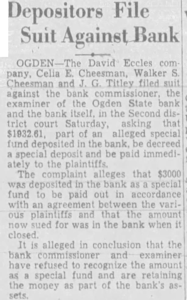 A number of suits were filed Second district court early this week depositors the closed Ogden State bank, who seek recover the amount of their posits from the directors of the funct institution. The largest individual suit was that filed Tuesday Thomas, who seeks judgment in the amount of together interest since the bank suspended business August, 1931. Mr. Thomas sets forth in his complaint that the directors, knowing the Ogden State bank to be in insolvent condition, continued transact business permitted false misleading financial ports concerning solvency the bank published. plaintiff further sets forth that the directors personally assured him of condition the bank durthe month of June, 1931, therecausing him make large posits in the institution. in the action include Bigelow, Becker, John Spargo, Edward Olson, Parmley, H. Rowe, Stone, John Spiers, Jessie Florence Van Meter, Albert Becker, Tower, Stevens and John Doe, administrain the estate of John Barnes. Other suits filed Tuesday against W. Hadlock, state bank commisioner; Jones, examiner in charge of liquidating the bank, and the Ogden State bank, corporainclude that of Lena Wells tion; recover $1,579.80; Elizabeth Nebeker, suing to recover plus interest; and Mary Carnathe aforementioned defendants the amount of $800, which amount she says was left at the bank for purpose purchasing shares of stock of the institution when was available, and which to mingled with assets funds of the bank. Suits filed Monday afternoon by the construction interand by the Whitmeyer family totalled Plaintiffs in these cases and the amounts sought are: Mr. and Mrs. Raymond Whitmeyer, $3,424.98; George Whitmeyer, Mr. and Mrs. Whitmeyer, George Whitmeyer Sons Mr. company, and Mrs. Albert Whitmeyer, 290.04. In each instance the amount sought less cent divident paid since the bank closed, although interest on the judgment also asked. Defendants in these cases are Bigelow, Becker, John Spargo, Edward Olson, Parmley, Rowe, Stone, Davis, John Spiers, Albert Becker and John Doe, of the estate of John Barnes, deceased, when the bank closed, and E. M. Tower and Stevens, directors from 1928 January 13, 1931. the who were directors when bank closed had served that capacity for several least with the exception Mr. Barnes and Albert Becker, who took office on January 13, 1931. filed for the Whitmeyers by Attorney Arthur Woolley allege that the insolvent and known be so by the directors at the time the deposits made; that directors caused published annual statements showing the bank solvent, its capital and showing surplus when was and that these were fraudulent; that defendants divers 1931 to the plaintiffs that the bank solvent, said representations being fraudulently made. Dr. Robinson, in suing the bank, the banking department liquidators, and the individual directors the time the bank closed, seeks to have $2,800 deposit of August 1931, declared preferred claim payable at that he be given judgment the amount against the several rectors. He alleges that the legal loan limit the bank, been that at the time made his deposits the capital, plus and undivided profits of the were completely wiped loan other losses the sum $650,and that this condition had isted least 30 the days prior to bank's closing; that the legal the capital had been impaired payment of illegal excess, unsafe and that the directors, knowing