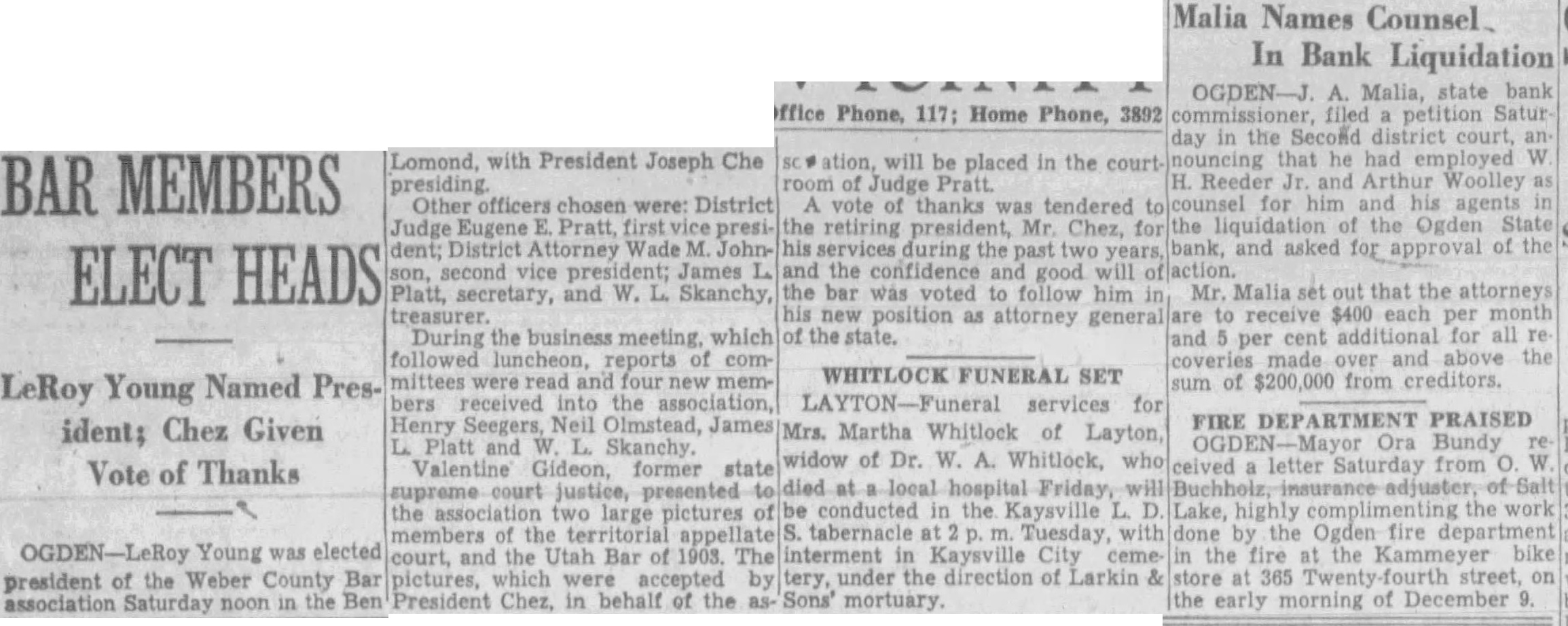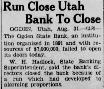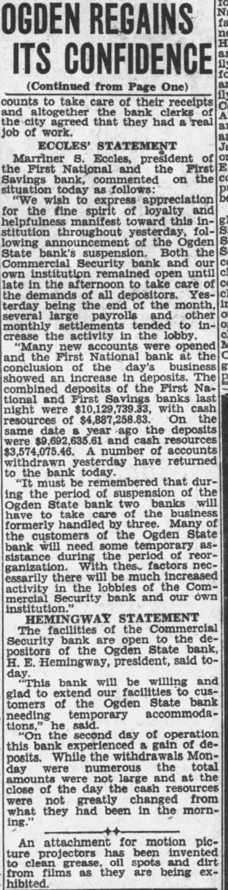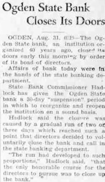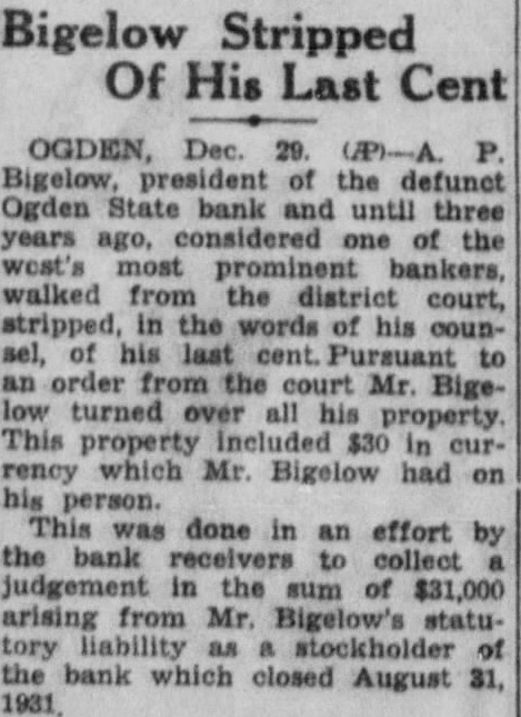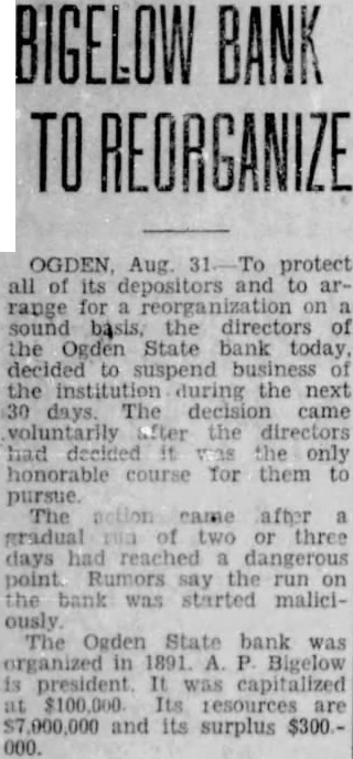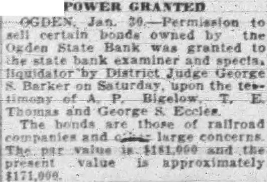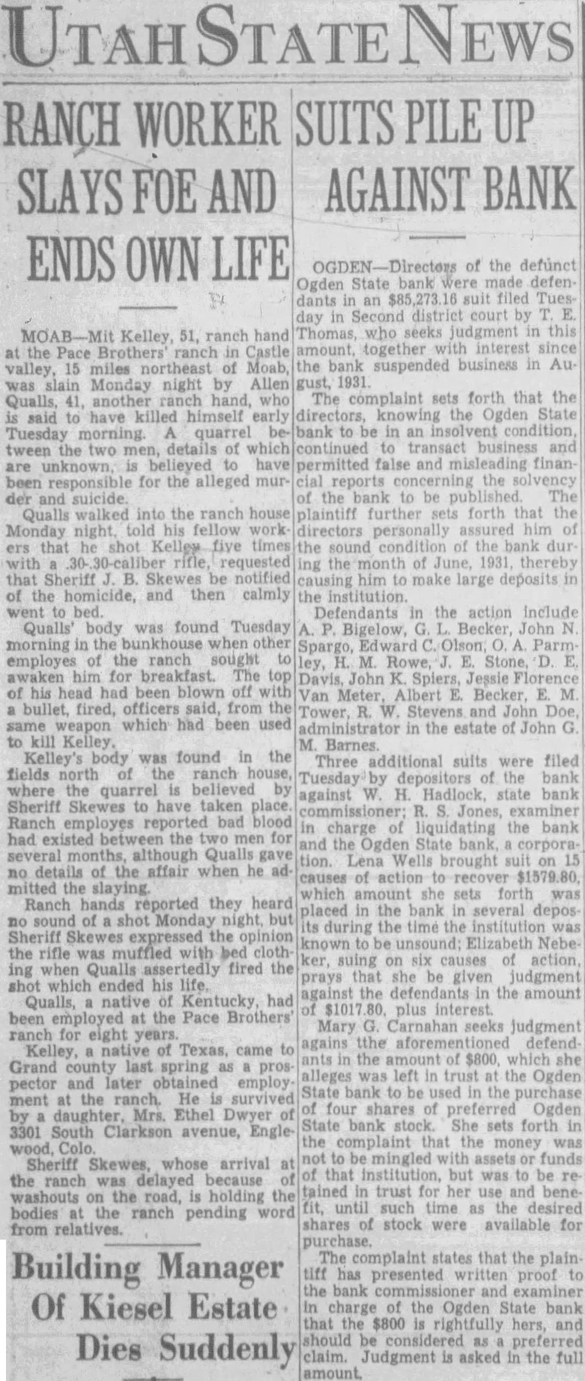 A number of suits were filed Second district court early this week depositors the closed Ogden State bank, who seek recover the amount of their posits from the directors of the funct institution. The largest individual suit was that filed Tuesday Thomas, who seeks judgment in the amount of together interest since the bank suspended business August, 1931. Mr. Thomas sets forth in his complaint that the directors, knowing the Ogden State bank to be in insolvent condition, continued transact business permitted false misleading financial ports concerning solvency the bank published. plaintiff further sets forth that the directors personally assured him of condition the bank durthe month of June, 1931, therecausing him make large posits in the institution. in the action include Bigelow, Becker, John Spargo, Edward Olson, Parmley, H. Rowe, Stone, John Spiers, Jessie Florence Van Meter, Albert Becker, Tower, Stevens and John Doe, administrain the estate of John Barnes. Other suits filed Tuesday against W. Hadlock, state bank commisioner; Jones, examiner in charge of liquidating the bank, and the Ogden State bank, corporainclude that of Lena Wells tion; recover $1,579.80; Elizabeth Nebeker, suing to recover plus interest; and Mary Carnathe aforementioned defendants the amount of $800, which amount she says was left at the bank for purpose purchasing shares of stock of the institution when was available, and which to mingled with assets funds of the bank. Suits filed Monday afternoon by the construction interand by the Whitmeyer family totalled Plaintiffs in these cases and the amounts sought are: Mr. and Mrs. Raymond Whitmeyer, $3,424.98; George Whitmeyer, Mr. and Mrs. Whitmeyer, George Whitmeyer Sons Mr. company, and Mrs. Albert Whitmeyer, 290.04. In each instance the amount sought less cent divident paid since the bank closed, although interest on the judgment also asked. Defendants in these cases are Bigelow, Becker, John Spargo, Edward Olson, Parmley, Rowe, Stone, Davis, John Spiers, Albert Becker and John Doe, of the estate of John Barnes, deceased, when the bank closed, and E. M. Tower and Stevens, directors from 1928 January 13, 1931. the who were directors when bank closed had served that capacity for several least with the exception Mr. Barnes and Albert Becker, who took office on January 13, 1931. filed for the Whitmeyers by Attorney Arthur Woolley allege that the insolvent and known be so by the directors at the time the deposits made; that directors caused published annual statements showing the bank solvent, its capital and showing surplus when was and that these were fraudulent; that defendants divers 1931 to the plaintiffs that the bank solvent, said representations being fraudulently made. Dr. Robinson, in suing the bank, the banking department liquidators, and the individual directors the time the bank closed, seeks to have $2,800 deposit of August 1931, declared preferred claim payable at that he be given judgment the amount against the several rectors. He alleges that the legal loan limit the bank, been that at the time made his deposits the capital, plus and undivided profits of the were completely wiped loan other losses the sum $650,and that this condition had isted least 30 the days prior to bank's closing; that the legal the capital had been impaired payment of illegal excess, unsafe and that the directors, knowing