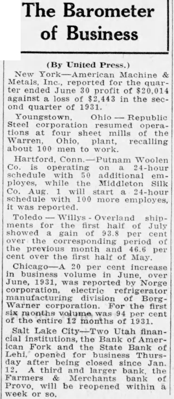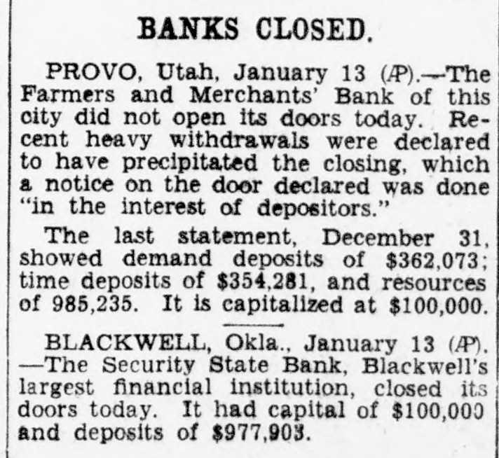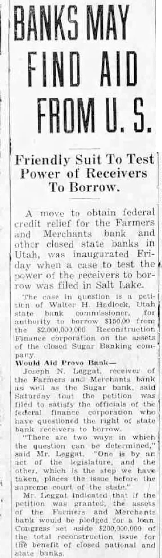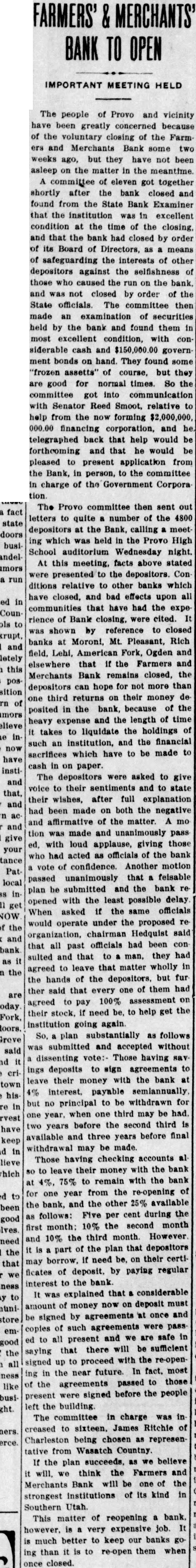 The people of Provo and vicinity been greatly concerned because of the voluntary closing of the Farm ers and Merchants Bank some two weeks ago, but they have not been asleep on the matter in the meantime committee of eleven got together shortly after the bank closed and found from the State Bank Examiner that the institution was in excellent condition at the time of the closing and that the bank had closed by order of its Board of Directors, as means of safeguarding the interests of other depositors against the selfishness those who caused the run on the bank. and was not closed by order of the State officials The then made an examination of securities held by the bank and found them most excellent condition, with siderable cash and ment bonds on hand They found some "frozen assetts" of course, but they are good for normal So the committee got into communication with Senator Reed Smoot, relative help from the forming 000.00 financing corporation, and telegraphed back that help would forthcoming and that he would be pleased to present application from the Bank, in person, to the committee in charge of the Government Corpora