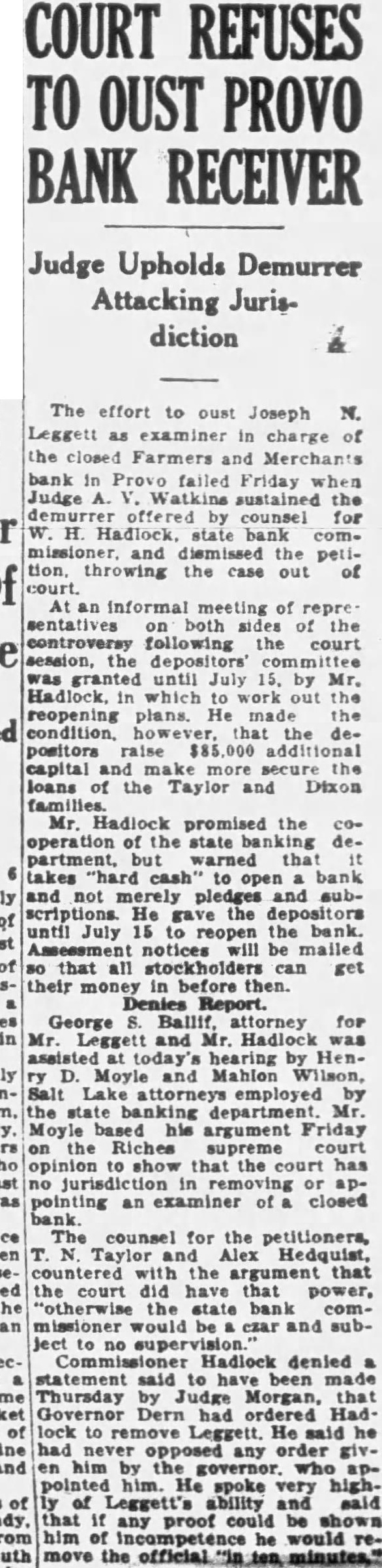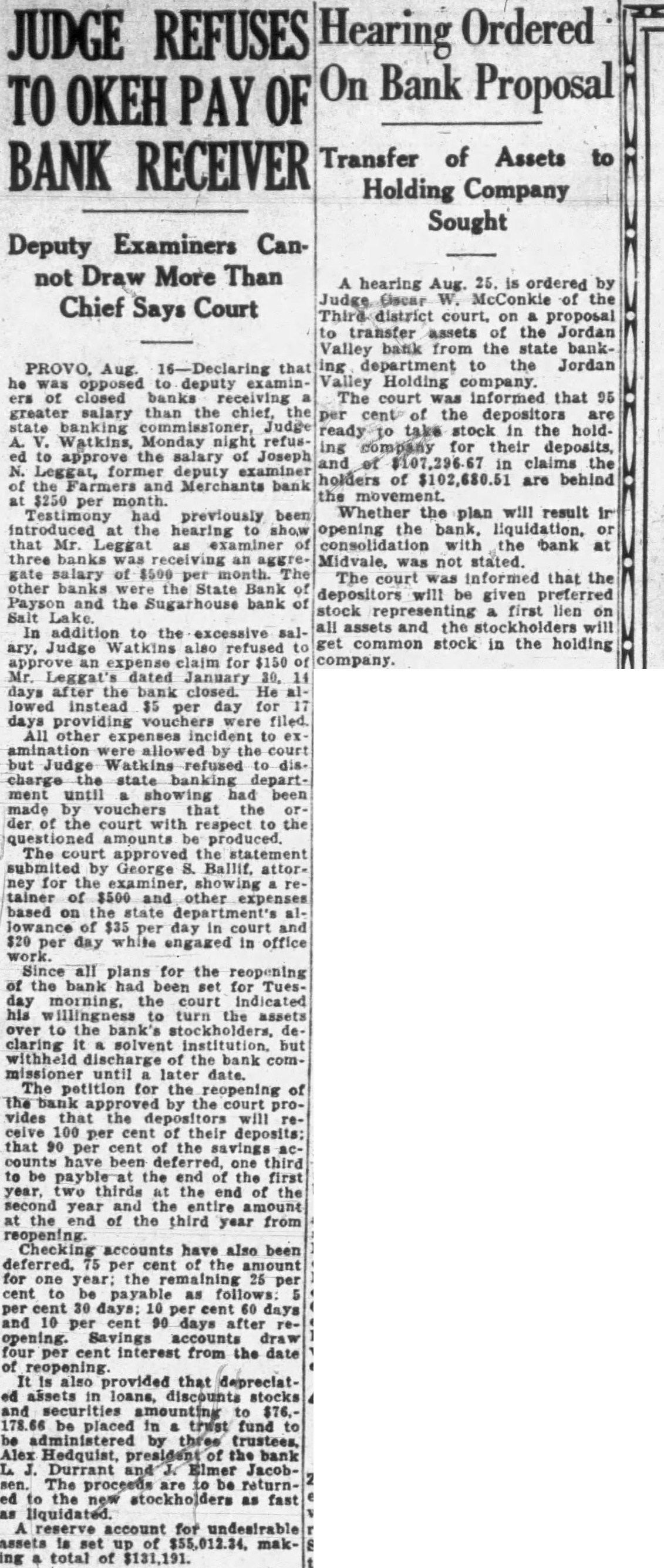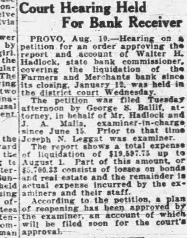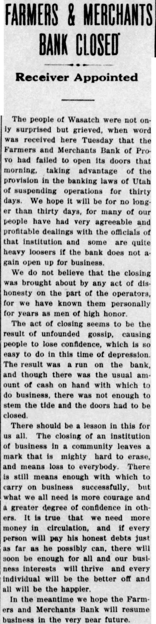 The Provo committee then sent out letters to quite number of the 4800 depositors at the Bank, calling meet ing which was held in the Provo High School auditorium Wednesday night. At this meeting, facts above stated were presented to the depositors. Con ditions relative to other banks which have closed, and bad effects upon all communities that have had the experience of Bank closing, were cited. was shown by reference to closed banks at Moroni, Mt. Pleasant, Rich field. Lehi, American Fork, Ogden and elsewhere that If the Farmers and Merchants Bank remains closed, the depositors can hope for not more than one third returns on their money de posited in the bank, because of the and the length of time heavy expense takes to liquidate the holdings of institution, and the financial such an sacrifices which have to be made to cash in on paper. The depositors were asked to give voice to their sentiments and to state their wishes, after full explanation had been made on both the negative and affirmative of the matter. mo tion was made and unanimously pass ed, with loud applause, giving those who had acted as officials of the bank vote of confidence. Another motion passed unanimously that feisable plan be submitted and the bank reopened with the least possible delay When asked if the same officials would operate under the proposed re organization, chairman Hedquist said that all past officials had been con sulted that to man, they had and agreed to leave that matter wholly in the hands of the depositors, but fur that of them had ther said every one agreed to pay 100% assessment on help get the their stock, need be, to institution going again. So, plan substantially as follows was submitted and accepted without dissenting vote:- Those having say ings deposits to sign agreements to leave their money with the bank at 4% interest. payable semiannually principal to be withdrawn for but no when one third may be one two before the second third years available and three years before final withdrawal may be made. Those having checking accounts al to leave their money with the bank 75% to remain with the bank 4%, for one year from the re-opening of the bank, and the other 25% available Five per cent during the as follows: 10% the second month first month: the third month. However and 10% of the plan that depositors is part If need be, on their certimay of by paying regular ficates to the bank. interest that considerable It was explained of now on deposit must amount money agreements at once and be signed by copies of such agreements were pass and we are safe in ed to all present there will be sufficient that with the re-opensigned up to proceed future. In fact. most ing in the near passed to those the agreements signed before the people present were the The committee in charge was in creased to James Ritchie of Charleston being chosen as representative from Wasatch Country. If the plan succeeds, as believe will, we think the Farmers and Merchants Bank will be one of the strongest institutions of its kind in Southern Utah. This matter of reopening however, very expensive job. much better to keep our banks gothan is to re-open them when ing closed.