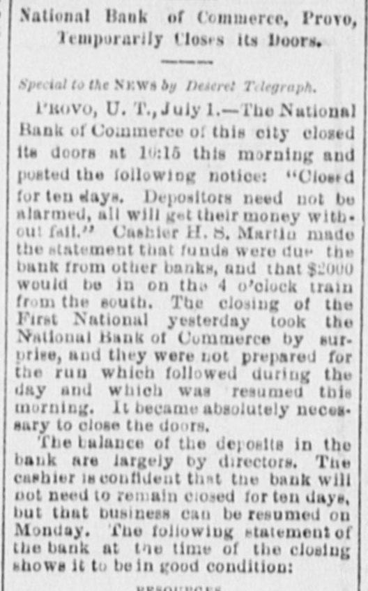 National Bank of Commerce, Provo, Temporarily Closes its Doors. Special to the NEWS by Descret Telegraph. PROVO, U. T., July -The National Bank of Commerce of this city closed its doors at 10:15 this morning and posted the following notice: "Closed for ten days. Depositors need not be alarmed, all will get their money with. out fail." Cashier H. 8. Martin made the statement that funds were due the bank from other banks, and that $2000 would be in on the 4 o'clock train from the south. The closing of the First National yesterday took the National Bank of Commerce by surprise, and they were not prepared for the run which followed during the day and which was resumed this morning. It became absolutely neces. sary to close the doors. The balance of the deposits in the bank are largely by directors. The cashier 18 confident that the bank will not need to remain closed for ten days, but that business can be resumed on Monday. The following statement of the bank at the time of the closing shows it to be in good condition: