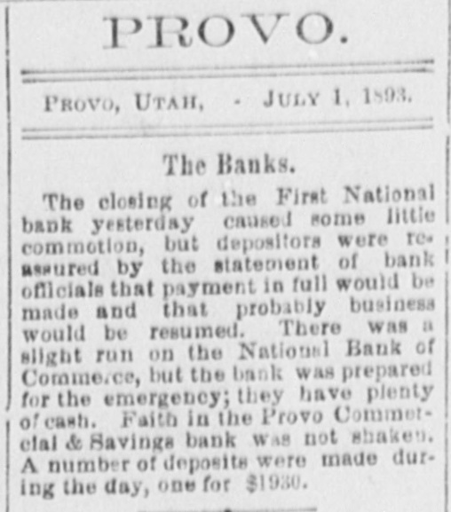 PROVO PROVO, UTAH, . JULY 1. 1893. The Banks. The closing of the First National bank yesterday caused some little commotion, but depositors were re+ assured by the statement of bank officials that payment in full would be made and that probably business would be resumed. There was a slight run on the National Bank of Commerce, but the bank was prepared for the emergency; they have plenty of cash. Faith in the Provo Commetcial & Savings bank Was not shakes. A number of deposits were made during the day, one for $1930.
