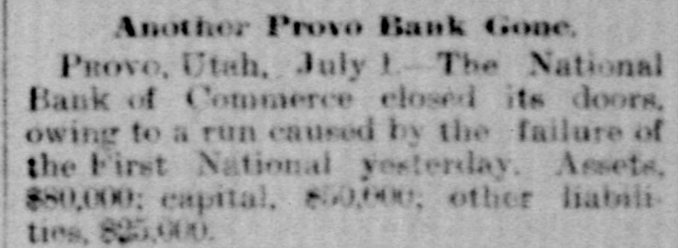 Newspapers report a run on the National Bank of Commerce (Provo) after the failure/closing of the First National. The bank temporarily closed on July 1, 1893 and was later listed among national banks that have resumed business (late JulyAugust 1893). Cause tied to runs triggered by another local bank's failure.
