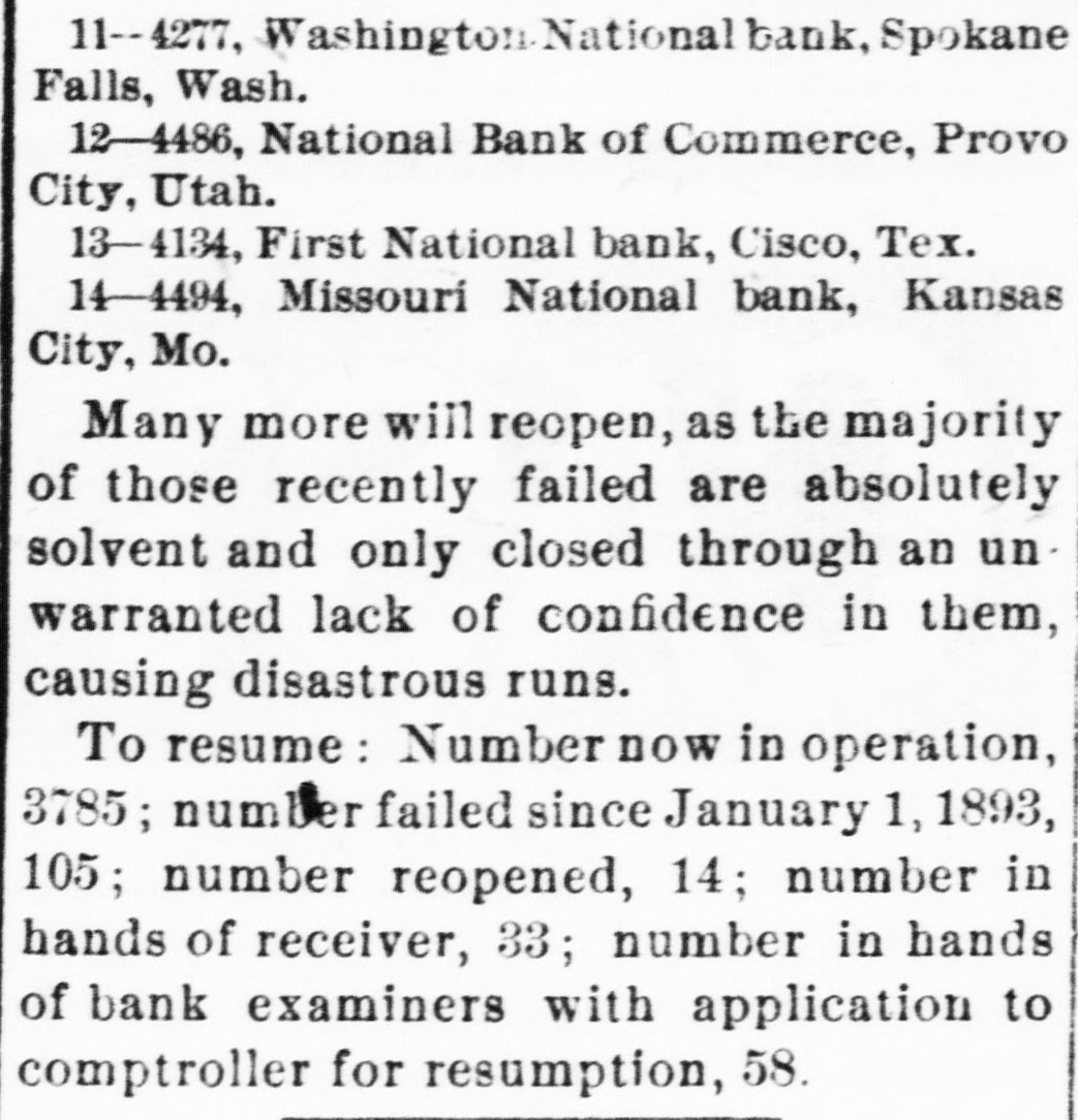 11--4277, Washington National bank, Spokane Falls, Wash. 12-4486, National Bank of Commerce, Provo City, Utah. 13-4134, First National bank, Cisco, Tex. 14-4494, Missouri National bank, Kansas City, Mo. Many more will reopen, as the majority of those recently failed are absolutely solvent and only closed through an un- warranted lack of confidence in them, causing disastrous runs. To resume: Number now in operation, 3785; number failed since January 1, 1893, 105; number reopened, 14; number in hands of receiver, 33; number in hands of bank examiners with application to comptroller for resumption, 58.