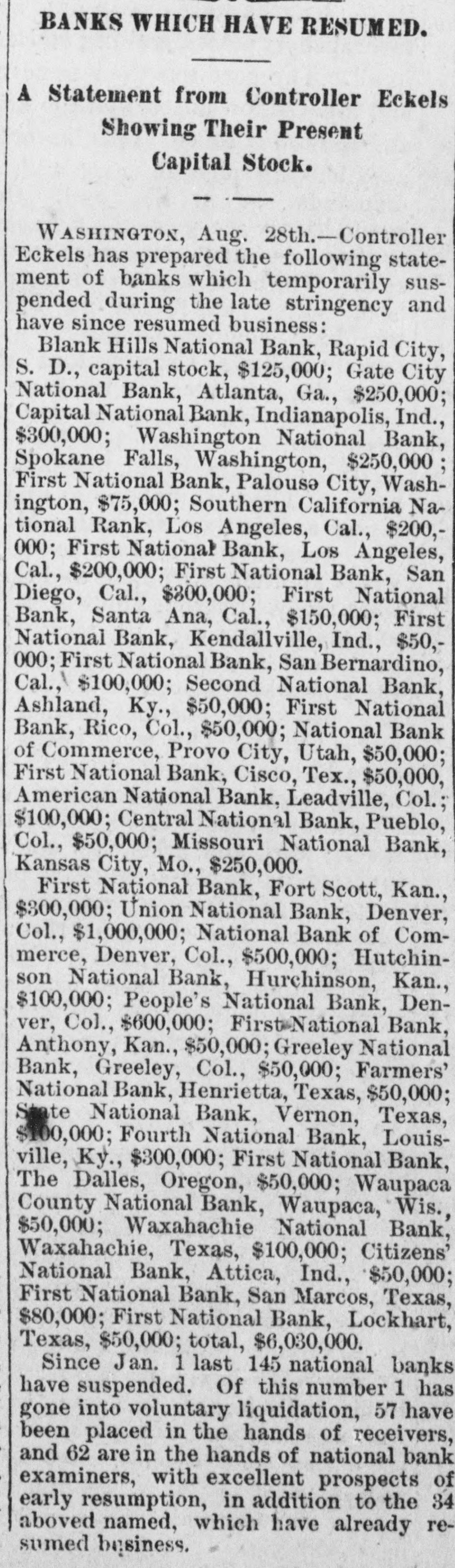 BANKS WHICH HAVE RESUMED. A Statement from Controller Eckels Showing Their Present Capital Stock. WASHINGTON, Aug. 28th.-Controller Eckels has prepared the following statement of banks which temporarily suspended during the late stringency and have since resumed business: Blank Hills National Bank, Rapid City, S. D., capital stock, $125,000; Gate City National Bank, Atlanta, Ga., $250,000; Capital National Bank, Indianapolis, Ind., $300,000; Washington National Bank, Spokane Falls, Washington, $250,000 ; First National Bank, Palouse City, Washington, $75,000; Southern California National Rank, Los Angeles, Cal., $200,000; First National Bank, Los Angeles, Cal., $200,000; First National Bank, San Diego, Cal., $800,000; First National Bank, Santa Ana, Cal., $150,000; First National Bank, Kendallville, Ind., $50,000; First National Bank, San Bernardino, Cal., $100,000; Second National Bank, Ashland, Ky., $50,000; First National Bank, Rico, Col., $50,000; National Bank of Commerce, Provo City, Utah, $50,000; First National Bank, Cisco, Tex., $50,000, American National Bank, Leadville, Col.; $100,000; Central National Bank, Pueblo, Col., $50,000; Missouri National Bank, Kansas City, Mo., $250,000. First National Bank, Fort Scott, Kan., $300,000; Union National Bank, Denver, Col., $1,000,000; National Bank of Commerce, Denver, Col., $500,000; Hutchinson National Bank, Hurchinson, Kan., $100,000; People's National Bank, Denver, Col., $600,000; First-National Bank, Anthony, Kan., $50,000; Greeley National Bank, Greeley, Col., $50,000; Farmers' National Bank, Henrietta, Texas, $50,000; State National Bank, Vernon, Texas, $100,000; Fourth National Bank, Louisville, Ky., $300,000; First National Bank, The Dalles, Oregon, $50,000; Waupaca County National Bank, Waupaca, Wis., $50,000; Waxahachie National Bank, Waxahachie, Texas, $100,000; Citizens' National Bank, Attica, Ind., $50,000; First National Bank, San Marcos, Texas, $80,000; First National Bank, Lockhart, Texas, $50,000; total, $6,030,000. Since Jan. 1 last 145 national banks have suspended. Of this number 1 has gone into voluntary liquidation, 57 have been placed in the hands of receivers, and 62 are in the hands of national bank examiners, with excellent prospects of early resumption, in addition to the 34 aboved named, which have already resumed business.