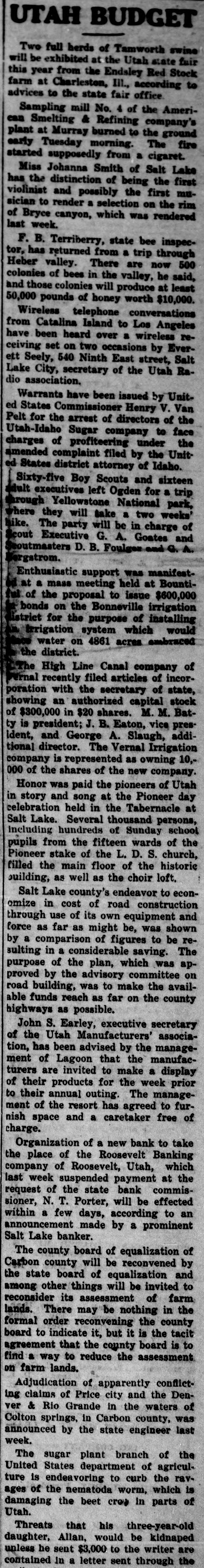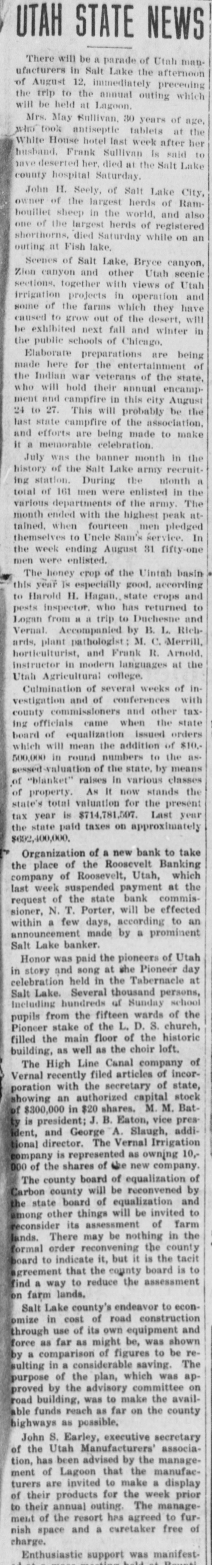 UTAH STATE NEWS There will be a parade of Utah manufacturers in Salt Lake the afternoon of August 12, immediately preceding the trip to the annual outing which will be held at Lagoon. Mrs. May Sullivan, 30 years of age, who took antiseptic tablets at the White House hotel last week after her husband. Frank Sullivan Is said to have deserted her, died at the Salt Lake county hospital Saturday. John H. Seely, of Salt Lake City, owner of the largest herds of Rambouillet sheep in the world, and also one of the largest herds of registered shorthorns, died Saturday while on an outing at Fish lake. Scenes of Salt Lake, Bryce canyon, Zion canyon and other Utah scenic sections, together with views of Utah irrigation projects in operation and some of the farms which they have caused to grow out of the desert, will be exhibited next fall and winter in the public schools of Chicago. Elaborate preparations are being made here for the entertainment of the Indian war veterans of the state, who will hold their annual encampment and campfire in this city August 24 to 27. This will probably be the last state campfire of the association, and efforts are being made to make it a memorable celebration. July was the banner month in the history of the Salt Lake army recruiting station. During the month a total of 161 men were enlisted in the various departments of the army. The month ended with the highest peak attained. when fourteen men pledged themselves to Uncle Sam's service. In the week ending August 31 fifty-one men were enlisted. The honey crop of the Uintah basin this year Is especially good. according to Harold H. Hagan, state crops and pests inspector. who has returned to Logan from a a trip to Duchesne and Vernal. Accompanied by B. L. Richards, plant pathologist M. C. Merrill, horticulturist, and Frank R. Arnold, Instructor in modern languages at the Utah Agricultural college. Culmination of several weeks of investigation and of conferences with county commissioners and other taxing officials came when the state board of equalization issued orders which will mean the addition of $10.500,000 in round numbers to the asgessed-valuation of the state, by means of "blanket" raises in various classes of property. As It now stands the state's total valuation for the present tax year is $714,781,597. Last year the state paid taxes on approximately $692,400,000. Organization of a new bank to take the place of the Roosevelt Banking company of Roosevelt, Utah, which last week suspended payment at the request of the state bank commissioner, N. T. Porter, will be effected within a few days, according to an announcement made by a prominent Salt Lake banker. Honor was paid the pioneers of Utah in story and song at she Pioneer day celebration held in the Tabernacle at Salt Lake. Several thousand persons, Including hundreds of Sunday school pupils from the fifteen wards of the Pioneer stake of the L. D. S. church, filled the main floor of the historic building, as well as the choir loft. The High Line Canal company of Vernal recently filed articles of incorporation with the secretary of state, showing an authorized capital stock of $300,000 in $20 shares. M. M. Batty is president; J. B. Eaton, vice president, and George A. Slaugh, additional director. The Vernal Irrigation company is represented as owning 10,000 of the shares of the new company. The county board of equalization of Carbon county will be reconvened by the state board of equalization and among other things will be invited to reconsider its assessment of farm lands. There may be nothing in the formal order reconvening the county board to indicate it, but it is the tacit agreement that the county board is to find a way to reduce the assessment on farm lands. Salt Lake county's endeavor to economize in cost of road construction through use of its own equipment and force as far as might be, was shown by a comparison of figures to be resulting in a considerable saving. The purpose of the plan, which was approved by the advisory committee on road building, was to make the avail-