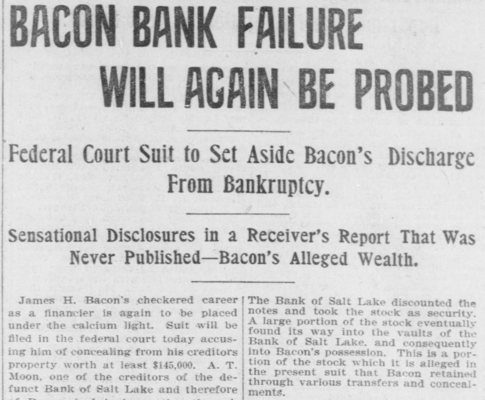 # BACON BANK FAILURE # WILL AGAIN BE PROBED Federal Court Suit to Set Aside Bacon's Discharge From Bankruptcy. Sensational Disclosures in a Receiver's Report That Was Never Published-Bacon's Alleged Wealth. James H. Bacon's checkered career as a financier is again to be placed under the calcium light. Suit will be filed in the federal court today accusing him of concealing from his creditors property worth at least $145,000. A. T. Moon, one of the creditors of the defunct Bank of Salt Lake and therefore The Bank of Salt Lake discounted the notes and took the stock as security. A large portion of the stock eventually found its way into the vaults of the Bank of Salt Lake, and consequently into Bacon's possession. This is a portion of the stock which it is alleged in the present suit that Bacon retained through various transfers and concealments.