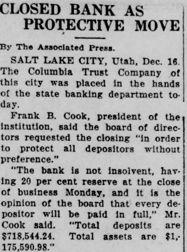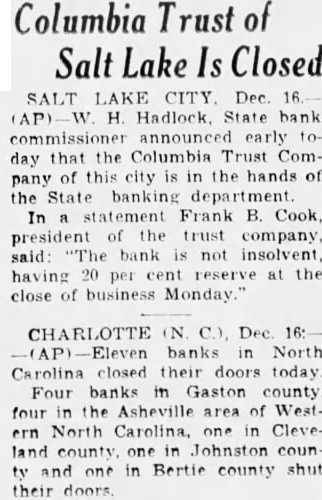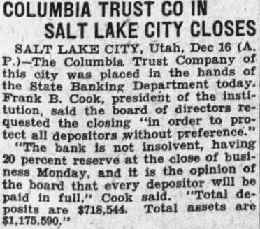 Columbia Trust of Lake Is Closed SALT LAKE CITY. Dec. State bank commissioner announced early day that the Columbia Trust Comthis city is in the hands of pany State banking department. Frank Cook, president the trust company, said: bank not insolvent, reserve the close of business Monday. CHARLOTTE Dec banks North Carolina closed their doors today Four banks county four Asheville area WestNorth one Cleveland county Johnston coun and one in Bertie county shut their