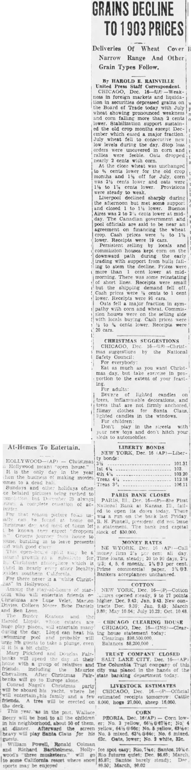 DECLINE Deliveries Of Wheat Cover Narrow Range And Other Grain Types Follow. By HAROLD RAINVILLE United Staff Dec. foreign markets and liquidagrains on Board Trade today with July wheat pronounced weakness and falling than cents lower. support sustainthe old crop months except December which eased major fraction July wheat fell low levels during the day. Stop orders corn and rallies were feeble. dropped cents with corn. At the close wheat was unchanged cents lower for the old months and off for July, corn was 2½ cents lower and were 1½ lower. Provisions steady Liverpool sharply during the afternoon but support closed to 1½ Buenos Aires was to cents lower midCanadian government and officials are said be near agreement financing the wheat crop. prices to lower. Receipts were cars. Persistent selling by locals and commission houses kept corn on downward path during the early trading with support from bulls failing stem the Prices cent lower midThere was reinstating short lines. but the fell off. Cash prices cents to cent were Oats fell fraction sympathy with corn and wheat. sion houses were selling side with locals prices were cents lower. Receipts were cars. CHRISTMAS SUGGESTIONS CHICAGO, -Christmas suggestions by the National Safety Council everybody: Eat much you want Christmas but take proportion to the extent of your feast- adults: Beware lighted candles and trees that are not firmly flimsy clothes Santa lighted candles in the windows. play the streets with toys and hitch your automobiles At-Homes To Entertain. LIBERTY BONDS NEW YORK, 16 bonds Christmas 101.31 house day the year the making movies Treas comes dead Treas 3% 106.11 Sundays and holidays often belated being PARIS BANK CLOSES always First 16-(P)-8he of Bank Kansas tivities ed its There For reason picture on Friday home Pinnell, did Christmas and most of them statement bank had capital be known droppers stock of Groups to bursting presents MONEY RATES NE WYORK Dec be firm cent day months per cent. nearly locality Prime commercial Bankers acceptances unchanced For never white Christ- of starwill Christmas Lupe Davies Colleen Moore Bebe Daniels and Ben Lyon Buster Keatons Harold Lloyds are huge entertain during the day. Lloyd can heat his wimming pool and will his take even chilly Pickford Douglas Fairspend the their with group of relatives and friends including Maurice Christmas Fairwill Christmas party aboard his family and few friends. tree will be erected on the This in the Wallace Beery will host to children in of them. Afterward the heavy will play Santa for his guests. William Ronald Colman and Richard Bartholmess, Hollywood's three will to some California resort where snow sports may be enjoyed COTTON NEW Dec. opened points higher Jan. conDec. 9.39 Jan. May July Oct. CLEARING HOUSE CHICAGO, ing house statement today: Clearings Balances $8,200,000 TRUST COMPANY CLOSED SALT LAKE Dec. The Columbia Trust company city placed the hands of the state banking department today. LIVESTOCK ESTIMATES estimated tomorrow Cattle hogs sheep 16,000. CORN Dec Corn No. mixed. mixed. Oats, lower; white, 32c. fee easy; Rio, futures quiet: March $5.87; Santos barely March,