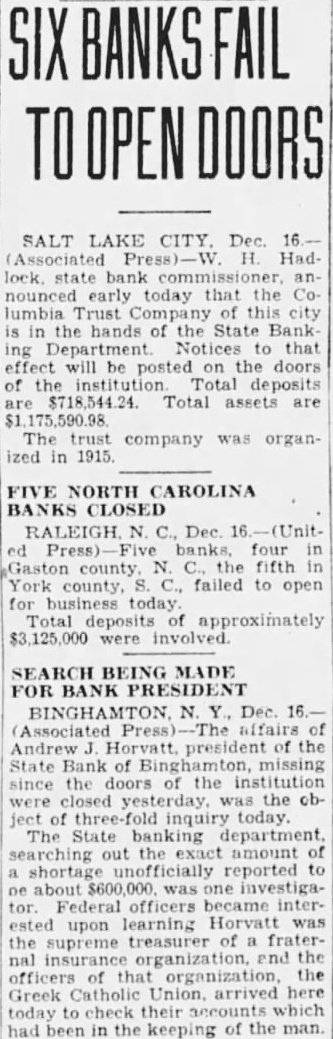 SALT LAKE CITY. Dec. (Associated Hadlock. state today that the lumbia Trust this city the hands of the State BankNotices that effect will be posted the doors of the Total deposits $718,544.24 Total assets are The trust company was organized in 1915. FIVE NORTH CAROLINA CLOSED RALEIGH four N. fifth York county, failed to open for business Total of approximately were involved. MADE FOR BANK PRESIDENT BINGHAMTON Dec. affairs Andrew of the State Bank of missing since the doors the institution closed yesterday, the object inquiry today. The State department, searching exact amount of unofficially reported about investigator. Federal officers became interested upon learning Horvatt the supreme treasurer of fraternal insurance organization, end the officers that organization, the Greek Catholic Union, arrived here today to check their which had been in the keeping of the man.