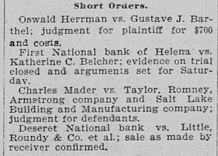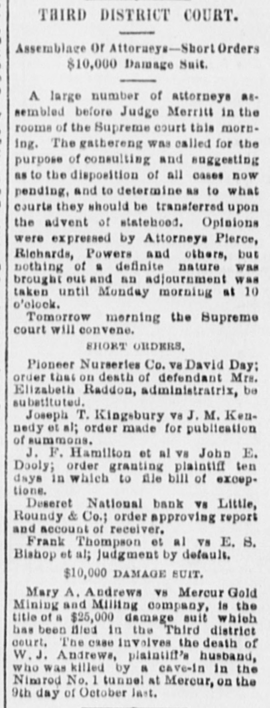 THIRD DISTRICT COURT. Assemblage or Attorneys-Short Orders $10,000 Damage Suit. A. large number of attorneys assembled before Judge Merritt in the rooms of the Supreme court this morning. The gathereng was called for the purpose of consulting and suggesting as to the disposition of all cases now pending, and to determine as to what courts they should be transferred upon the advent of statehood. Opinions were expressed by Attorneys Pierce, Richards, Powers and others, but nothing of a definite nature was brought out and an adjournment was taken until Monday morning at 10 o'clock. Tomorrow merning the Supreme court will convene. SHORT ORDERS. Pioneer Nurseries Co. va David Day; order that on death of defendant Mrs. Elizabeth Raddon, administratrix, be substituted. Joseph T. Kingsbury V8 J. M. Kennedy et al; order made for publication of summons. J. F. Hamilton et al V8 John E. Dooly; order granting plaintiff ten days in which to file bill of exceptions. Deseret National bank V8 Little, Roundy & Co.; order approving report and account of receiver. Frank Thompson et al VS E. S. Bishop et al; judgment by default. $10,000 DAMAGE SUIT. Mary A. Andrews V8 Mercur Gold Mining and Milling company, is the title of a $25,000 damage suit which has been filed in the Third district court. The case involves the death of W. J. Andrews, plaintiff's husband, who was killed by a cave-in in the Ninared No. 1 tunnel at Mereur, on the 9th day of October last.