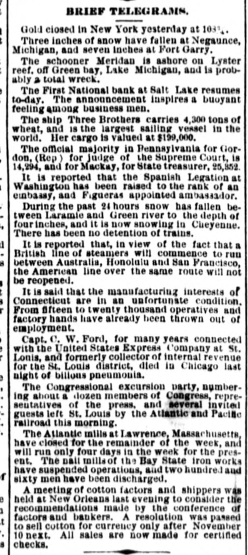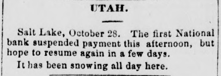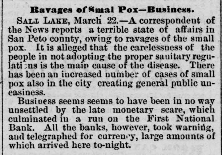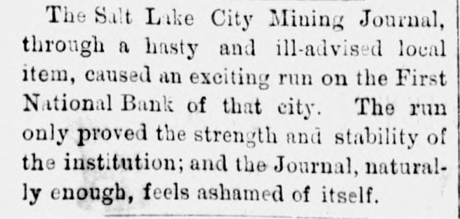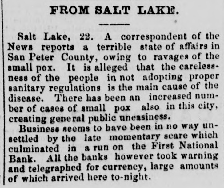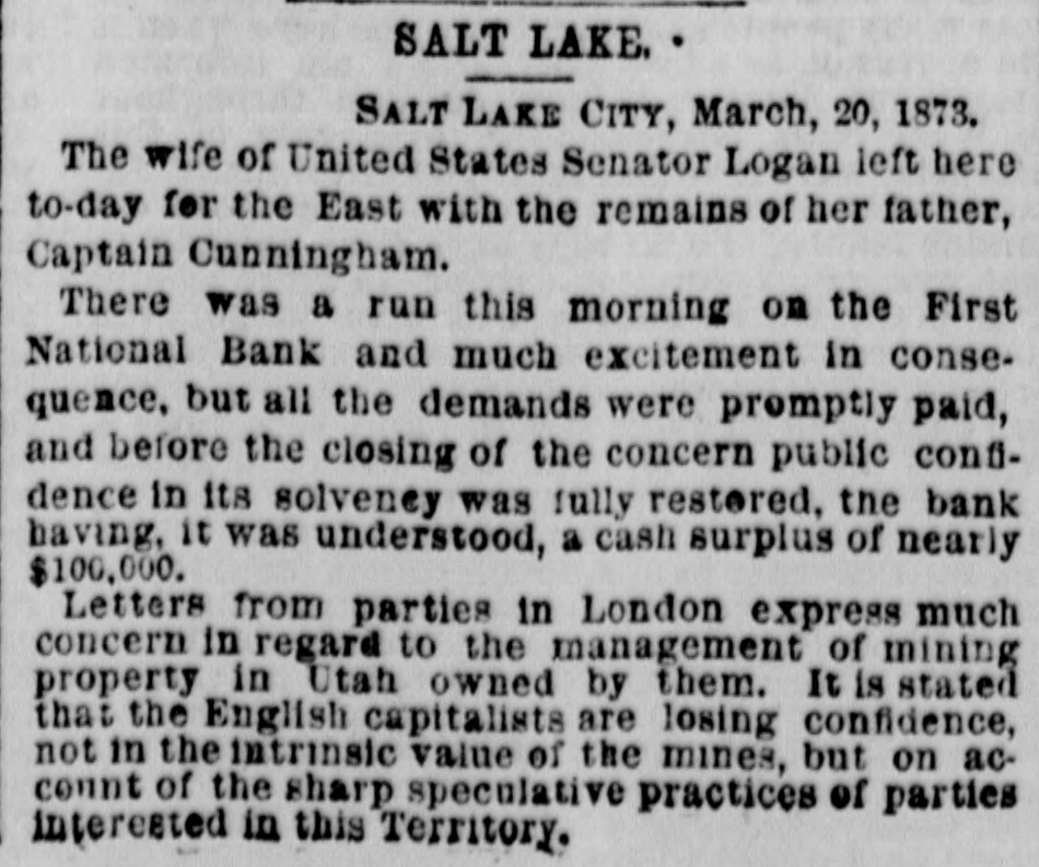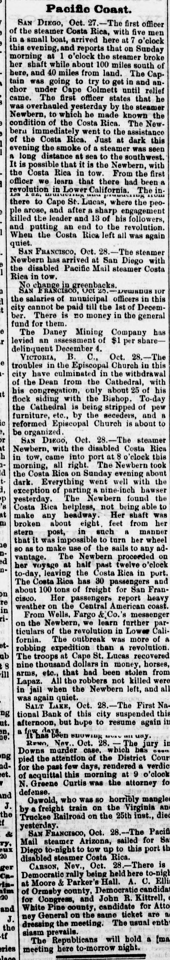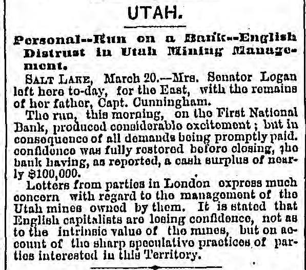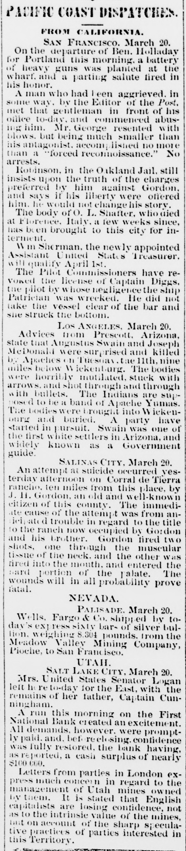 COAST PIN FROM CALIFORNIA. SAN FRANCISCO. March 20. On the departure of Ben. Holladay for Portland this morning. a battery of heavy guns was planted at the wharf. and a parting salute fired in his honor. A man who had Leen aggrieved. in some way, by the Editor of the Post. met that gentleman in front of his office to-day. and commenced abusing him. Mr. George resented with blows. but being much smaller than his antagonist. accomplished no more than a *forced recomoissance." No arrests. Robinson, in the Oakland Jail. still insists upon the truth of the charges preferred by him against Gordon, and says it his liberty were offered him. he would not change his story. The body of O. L. Shafter, who died at Florence, Italy, a few weeks since, has been brought to this city for interment. Win Sherman. the newly appointed Assistant United States Treasurer. will qualify April 1st. The Pilot Commissioners have reVoised the license of Captain Diggs, the pilot by whose negligence the ship Patrician was wrecked. He did not take the vessel clear of the bar and she struck the bottom. Los ANGELES, March 20. Advices from Prescott. Arizona, state that Augustus Swain and Joseph McDonald were surprised and killed by Apaches on Tuesday. the 11th, nine miles below Wickenturg. The bodies were horribly mutilated, stuck with arrows. and shot through and through with bullets. The Indians are supmosed to be a band of Apache Yumas. The bodies were brought into Wickenourg and buried. A party have started in pursuit. Swain was one of the first white settlers in Arizona, and widely known as a Government guide. SALINAS CITY. March 20. An attempt at suicide occurred yesterday afternoon on Corral de Tierra rancho, ten miles from this place, by J. 11. Gordon, an old and well-known citizen of this county. The immediate cause of the attempt was from anlicipate d trouble in regard to the title to the ranch now occupied by Gordon and his brother. Gordon fired two shots, one through the muscular tissue of the neck. and the other was tired into the month, and entered the pard portion of the ralate. The wounds will in all probability prove fatal. NEVADA. PALISADE. March 20. Wells, Fargo & Co. shipped by today's exp ress sixty bar- of silver bullion. weighing 8.304 pounds. from the Meadow Valley Mining Company, Pioche, to San Francisco. UTAH. SALT LAKE CITY, March 20. Mrs. United States Senator Logan left he re to-day for the East, with the remains of her father, Captain Cunningham. A run this morning on the First National Bank created an excitement. All demands, however, were promptly paid. and, bef reclosing. confidence was fully restored, the bank having, as reported, a cash surplus of nearly $100000.00 Letters from parties in London express much concern in regard to the management of Utah mines owned by them. It is stated that English capitalists are losing confidence, not as to the intrinsie value of the mines, but on account of the sharp speculative practices of parties interested in this Territory.