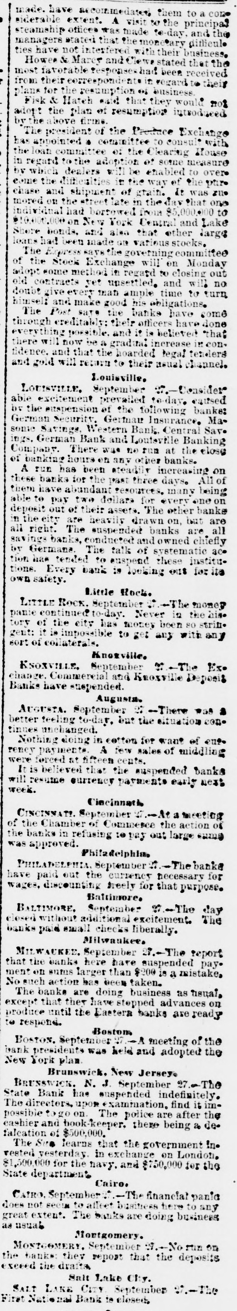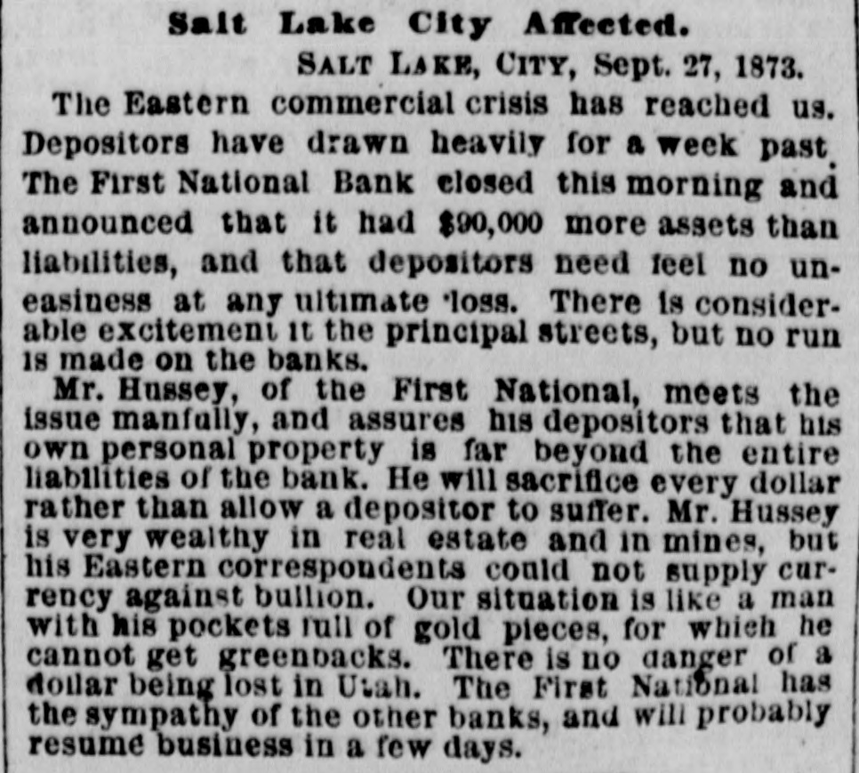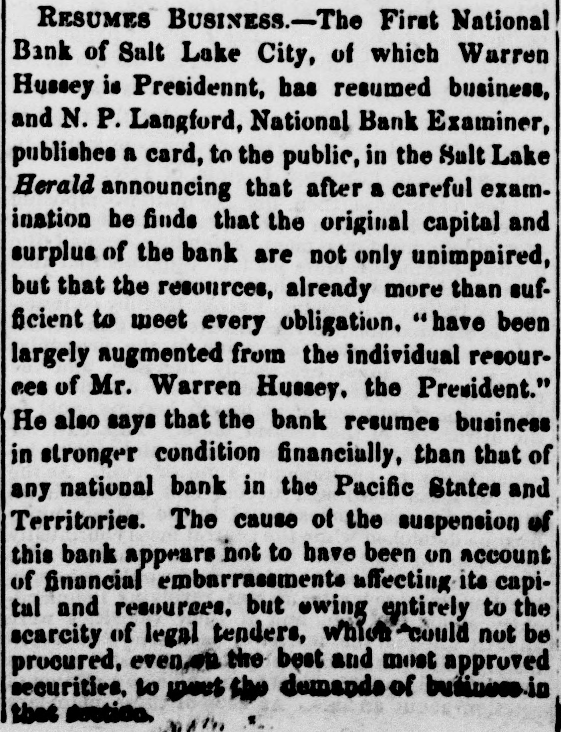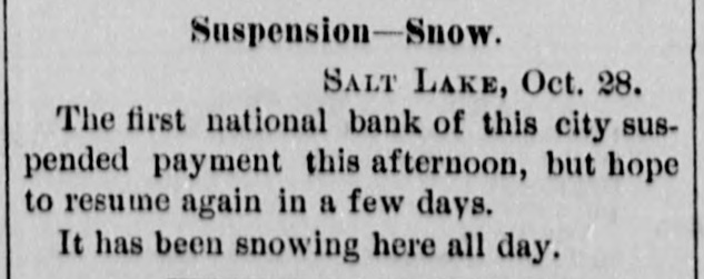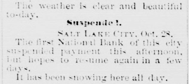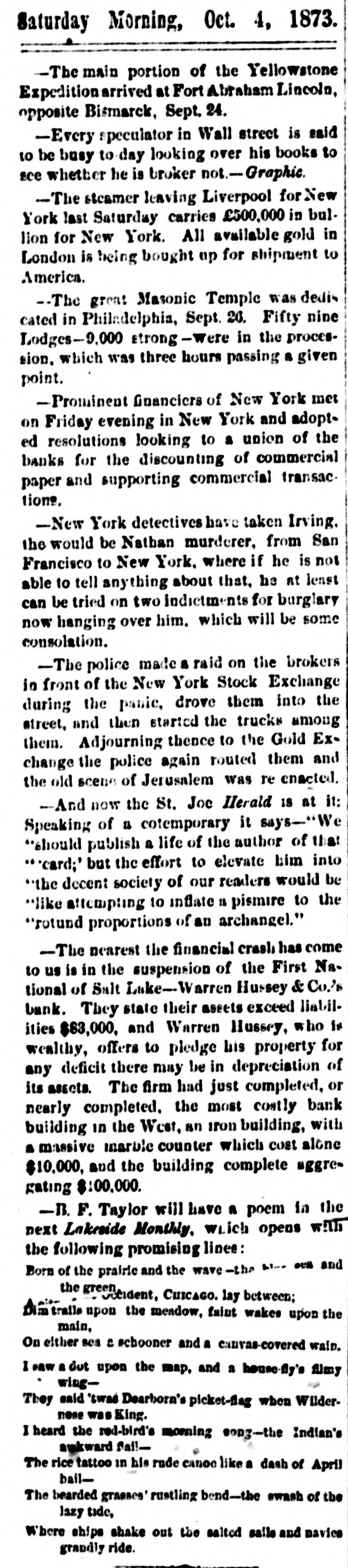 COAST PIN FROM CALIFORNIA. SAN FRANCISCO. March 20. On the departure of Ben. Holladay for Portland this morning. a battery of heavy guns was planted at the wharf. and a parting salute fired in his honor. A man who had Leen aggrieved. in some way, by the Editor of the Post. met that gentleman in front of his office to-day. and commenced abusing him. Mr. George resented with blows. but being much smaller than his antagonist. accomplished no more than a *forced recomoissance." No arrests. Robinson, in the Oakland Jail. still insists upon the truth of the charges preferred by him against Gordon, and says it his liberty were offered him. he would not change his story. The body of O. L. Shafter, who died at Florence, Italy, a few weeks since, has been brought to this city for interment. Win Sherman. the newly appointed Assistant United States Treasurer. will qualify April 1st. The Pilot Commissioners have reVoised the license of Captain Diggs, the pilot by whose negligence the ship Patrician was wrecked. He did not take the vessel clear of the bar and she struck the bottom. Los ANGELES, March 20. Advices from Prescott. Arizona, state that Augustus Swain and Joseph McDonald were surprised and killed by Apaches on Tuesday. the 11th, nine miles below Wickenturg. The bodies were horribly mutilated, stuck with arrows. and shot through and through with bullets. The Indians are supmosed to be a band of Apache Yumas. The bodies were brought into Wickenourg and buried. A party have started in pursuit. Swain was one of the first white settlers in Arizona, and widely known as a Government guide. SALINAS CITY. March 20. An attempt at suicide occurred yesterday afternoon on Corral de Tierra rancho, ten miles from this place, by J. 11. Gordon, an old and well-known citizen of this county. The immediate cause of the attempt was from anlicipate d trouble in regard to the title to the ranch now occupied by Gordon and his brother. Gordon fired two shots, one through the muscular tissue of the neck. and the other was tired into the month, and entered the pard portion of the ralate. The wounds will in all probability prove fatal. NEVADA. PALISADE. March 20. Wells, Fargo & Co. shipped by today's exp ress sixty bar- of silver bullion. weighing 8.304 pounds. from the Meadow Valley Mining Company, Pioche, to San Francisco. UTAH. SALT LAKE CITY, March 20. Mrs. United States Senator Logan left he re to-day for the East, with the remains of her father, Captain Cunningham. A run this morning on the First National Bank created an excitement. All demands, however, were promptly paid. and, bef reclosing. confidence was fully restored, the bank having, as reported, a cash surplus of nearly $100000.00 Letters from parties in London express much concern in regard to the management of Utah mines owned by them. It is stated that English capitalists are losing confidence, not as to the intrinsie value of the mines, but on account of the sharp speculative practices of parties interested in this Territory.