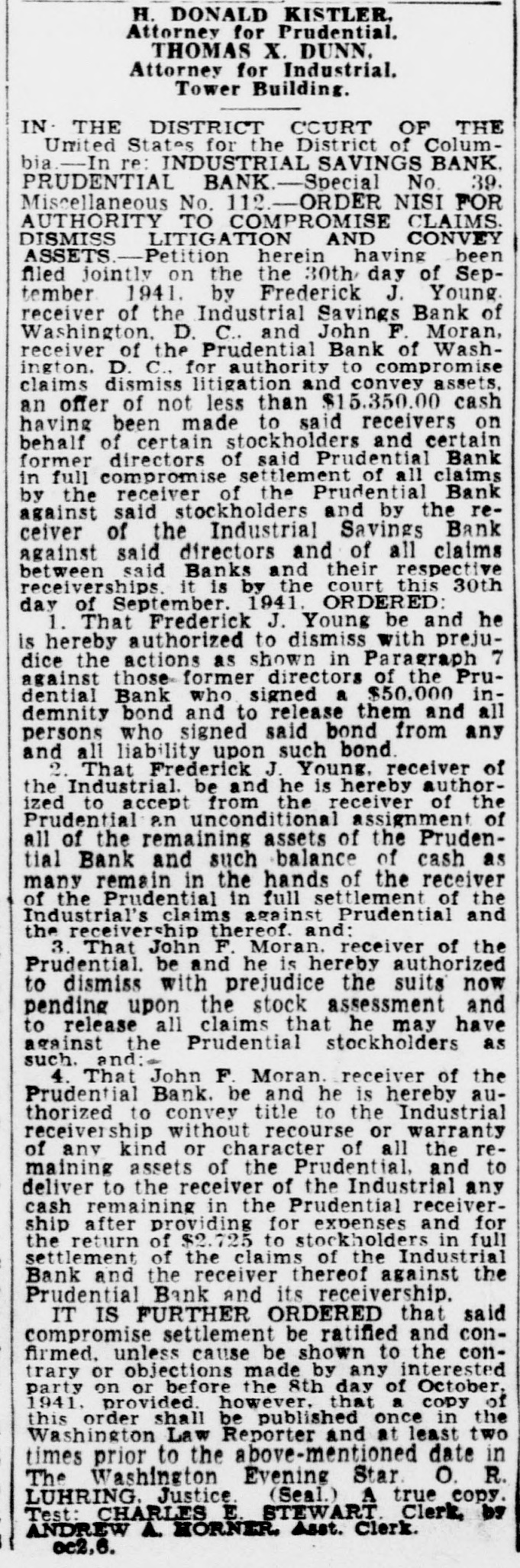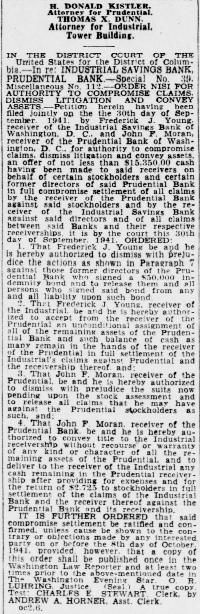 H. DONALD KISTLER. Attorney for Prudential. THOMAS X. DUNN. Attorney for Industrial. Tower Building. IN THE DISTRICT COURT OF THE United States for the District of Columbia In re: INDUSTRIAL SAVINGS BANK PRUDENTIAL BANK.-Special No. 39. Miscellaneous No. 112.-ORDER - NISI FOR AUTHORITY TO COMPROMISE CLAIMS. DISMISS LITIGATION AND CONVEY ASSETS.-Petition herein having been filed jointly on the the 30th day of September 1941. by Frederick J. Young. receiver of the Industrial Savings Bank of Washington, D. C.. and John F. Moran, receiver of the Prudential Bank of Washington. D. C., for authority to compromise claims dismiss litigation and convey assets, an offer of not less than $15,350.00 cash having been made to said receivers on behalf of certain stockholders and certain former directors of said Prudential Bank in full compromise settlement of all claims by the receiver of the Prudential Bank against said stockholders and by the receiver of the Industrial Savings Bank against said directors and of all claims between said Banks and their respective receiverships. it is by the court this 30th day of September. 1941. ORDERED: 1. That Frederick J. Young be and he is hereby authorized to dismiss with prejudice the actions as shown in Paragraph 7 against those former directors of the Prudential Bank who signed a $50.000 indemnity bond and to release them and all persons who signed said bond from any and all liability upon such bond. 2. That Frederick J. Young. receiver of the Industrial. be and he is hereby authorized to accept from the receiver of the Prudential an unconditional assignment of all of the remaining assets of the Prudential Bank and such balance of cash as many remain in the hands of the receiver of the Prudential in full settlement of the Industrial's claims against Prudential and the receivership thereof. and: 3. That John F. Moran. receiver of the Prudential. be and he is hereby authorized to dismiss with prejudice the suits now pending upon the stock assessment and to release all claims that he may have against the Prudential stockholders as such. and: 4. That John F. Moran. receiver of the Prudential Bank. be and he is hereby authorized to convey title to the Industrial receivership without recourse or warranty of any kind or character of all the remaining assets of the Prudential. and to deliver to the receiver of the Industrial any cash remaining in the Prudential receivership after providing for expenses and for the return of $2.725 to stockholders in full settlement of the claims of the Industrial Bank and the receiver thereof against the Prudential Bank and its receivership. IT IS FURTHER ORDERED that said compromise settlement be ratified and confirmed. unless cause be shown to the contrary or objections made by any interested party on or before the 8th day of October, 1941. provided. however. that a copy of this order shall be published once in the Washington Law Reporter and at least two times prior to the above-mentioned date in The Washington Evening Star O. R. LUHRING, Justice (Seal.) A true copy. Test: CHARLES E STEWART Clerk. by ANDREW A. MORNER. Asst. Clerk. oc2,6.