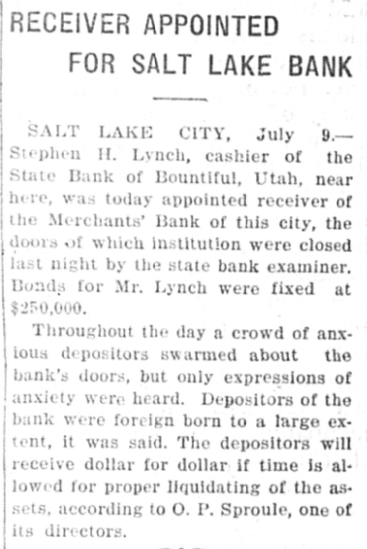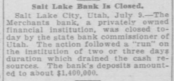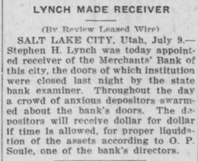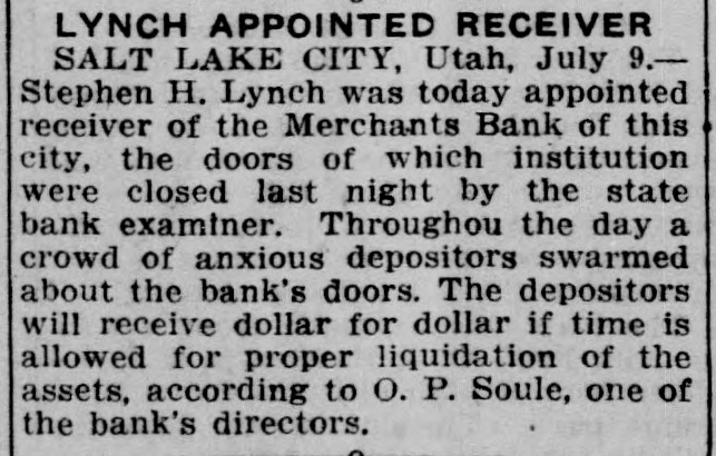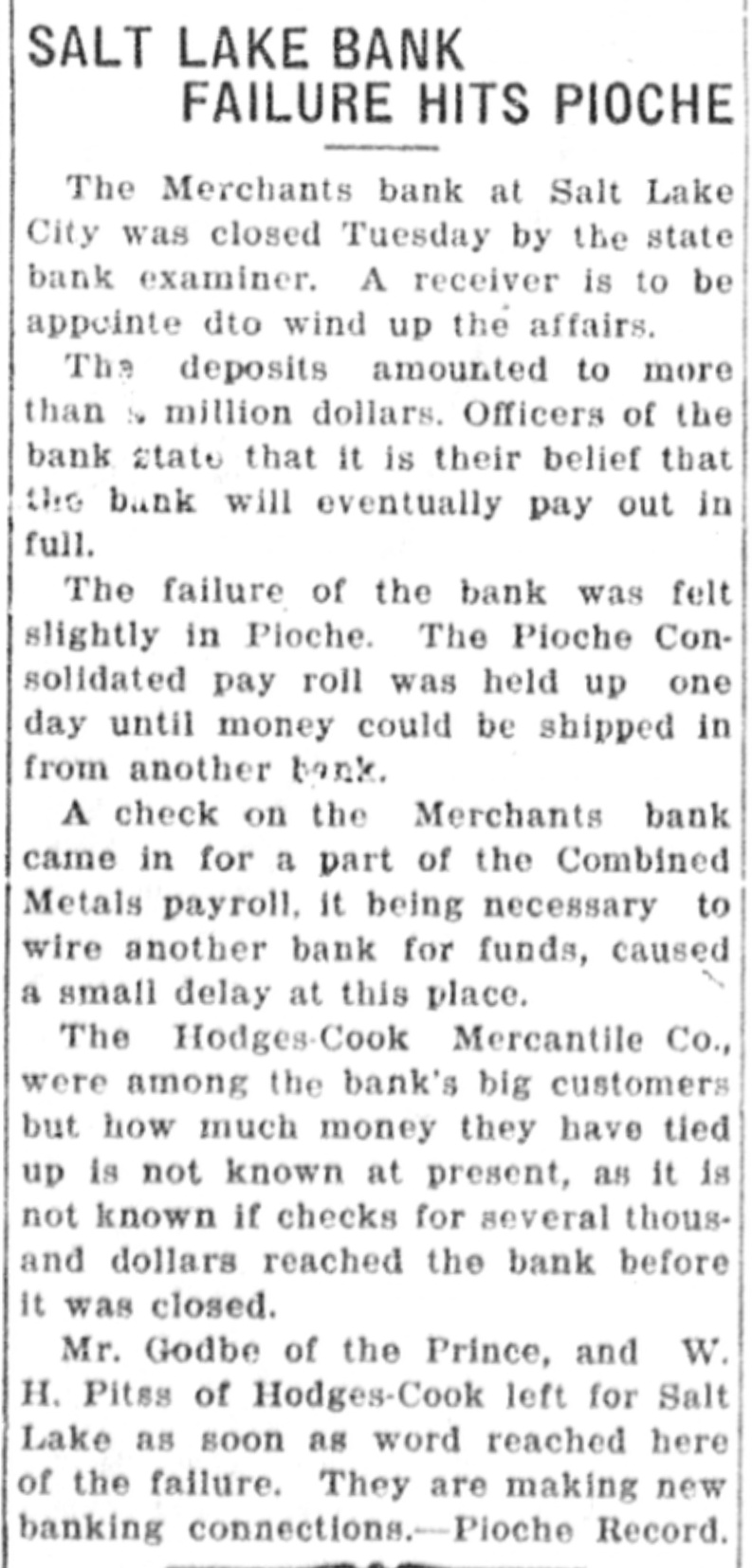 Paloma Mining company of which M. P. Braffet is president and general manager was caught in the Merchants bank failure at Salt Lake City with two thousand dollats on deposit in that institution. However, Braffet was more lucky personally, for the day before the bank closed he checked out a thousand dollars of his own account for use at Price.
