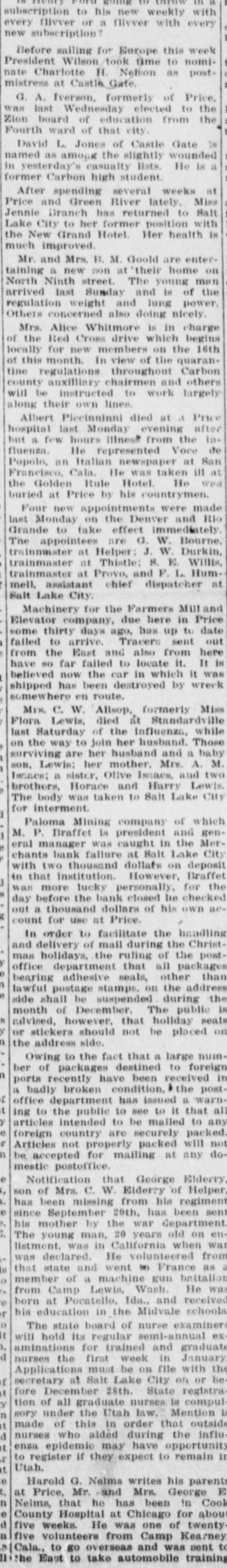 Notification that George Elderry, son of Mrs. C. W. Elderry of Helper, has been missing from his regiment since September 20th, has been sent his mother by the war Gepartment. The young man, 20 years old on enlistment, was in California when war was declared. He volunteered from that state and went to France as a member of a machine gun battalion from Camp Lewis, Wash. He was reborn at Pocatello, Ida., and received his education in the Midvale schools.