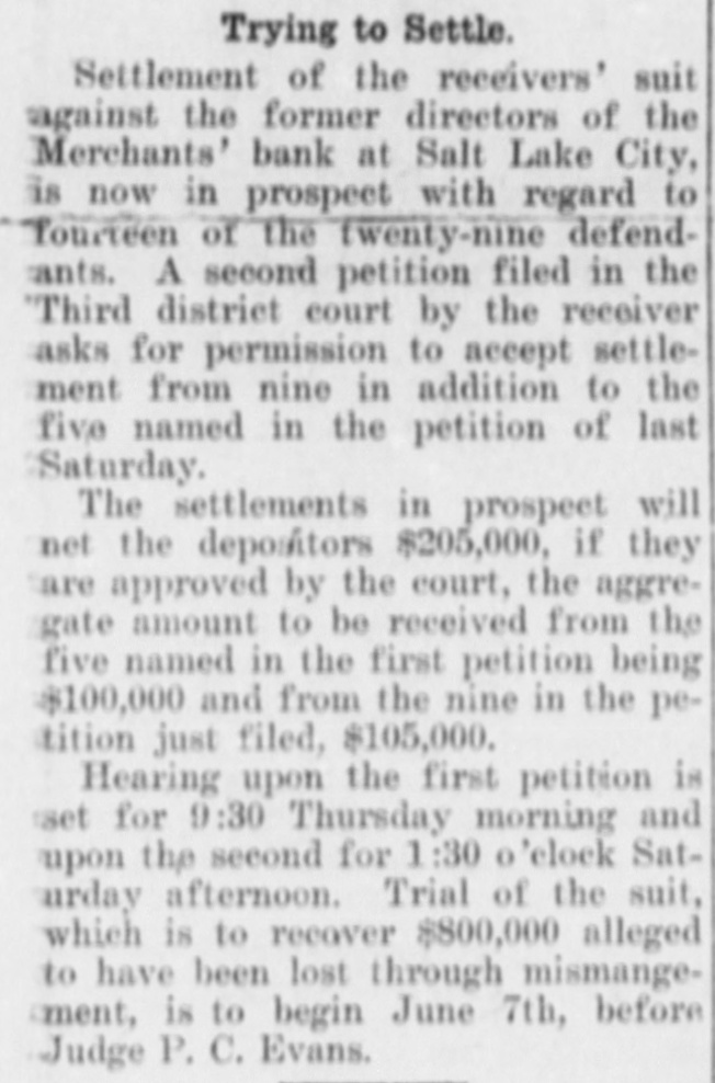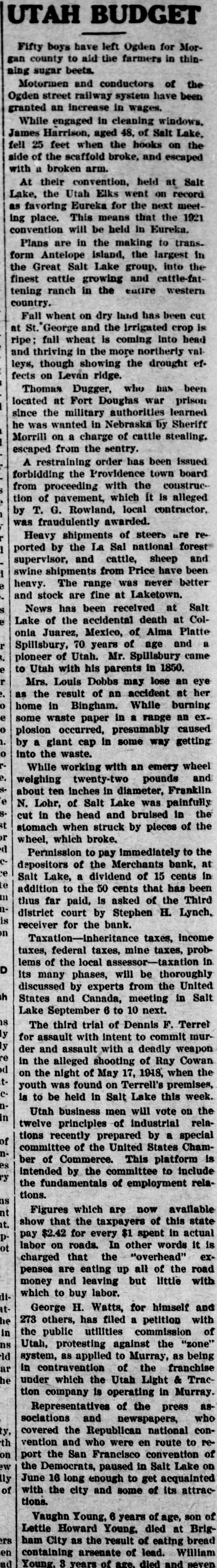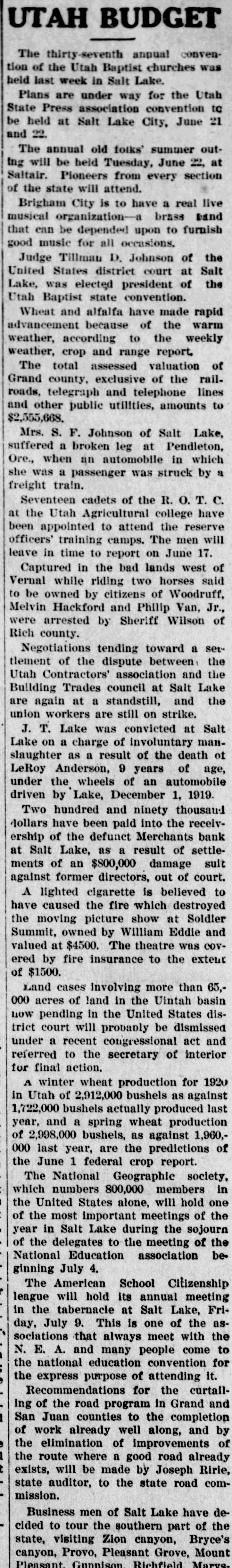 UTAH budget The thirty-seventh anpual convention of the Utah Baptist churches was held last week in Salt Lake. Plans are under way for the Utah State Press association convention to be held at Salt Lake City, June 21 and 22. The annual old folks' summer outIng will be held Tuesday, June 22, at Saltair. Pioneers from every section of the state will attend. Brigham City is to have a real live musical organization-a brass band that can be depended upon to furnish good music for all occasions. Judge Tillman D. Johnson of the United States district court at Salt Lake, was elected president of the Utah Baptist state convention. Wheat and alfalfa have made rapid advancement because of the warm weather, according to the weekly weather, crop and range report. The total assessed valuation of Grand county, exclusive of the railroads, telegraph and telephone lines and other public utilities, amounts to $2,555,668. Mrs. S. F. Johnson of Salt Lake, suffered a broken leg at Pendleton, Ore., when an automobile in which she was a passenger was struck by a freight train. Seventeen cadets of the R. O. T. C. at the Utah Agricultural college have been appointed to attend the reserve officers' training camps. The men will leave in time to report on June 17. Captured in the bad lands west of Vernal while riding two horses said to be owned by citizens of Woodruff, Melvin Hackford and Philip Van, Jr., were arrested by Sheriff Wilson of Rich county. Negotiations tending toward a settlement of the dispute between the Utah Contractors' association and the Building Trades council at Salt Lake are again at a standstill, and the union workers are still on strike. J. T. Lake was convicted at Salt Lake on a charge of involuntary manslaughter as a result of the death of LeRoy Anderson, 9 years of age, under the wheels of an automobile driven by Lake, December 1, 1919. Two hundred and ninety thousand dollars have been paid into the receivership of the defunct Merchants bank at Salt Lake, as a result of settlements of an $800,000 damage suit against former directors, out of court. A lighted cigarette is believed to have caused the fire which destroyed the moving picture show at Soldier Summit, owned by William Eddie and valued at $4500. The theatre was covered by fire insurance to the extent of $1500. Land cases involving more than 65,000 acres of land in the Uintah basin how pending in the United States district court will probably be dismissed under a recent congressional act and referred to the secretary of interior for final action. A winter wheat production for 1920 in Utah of 2,912,000 bushels as against 1,722,000 bushels actually produced last year, and a spring wheat production of 2,998,000 bushels, as against 1,960,000 last year, are the predictions of the June 1 federal crop report. The National Geographic society, which numbers 800,000 members in the United States alone, will hold one of the most important meetings of the year in Salt Lake during the sojourn of the delegates to the meeting of the National Education association beginning July 4. The American School Citizenship league will hold its annual meeting in the tabernacle at Salt Lake, Friday, July 9. This is one of the associations that always meet with the N. E. A. and many people come to the national education convention for the express purpose of attending it. Recommendations for the curtailing of the road program in Grand and San Juan counties to the completion of work a