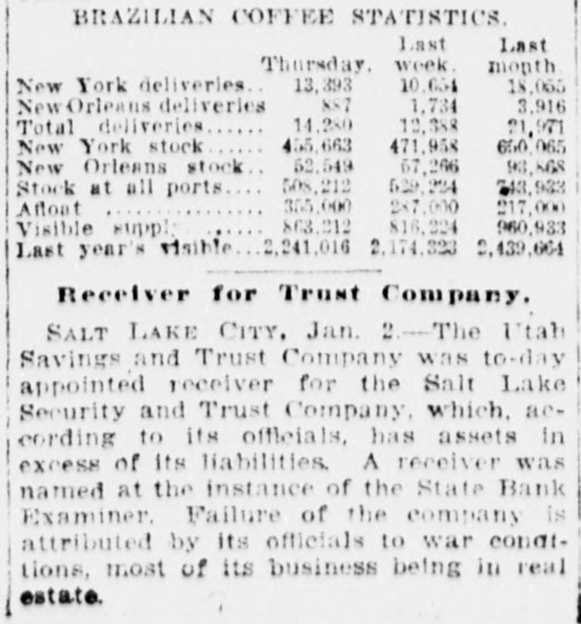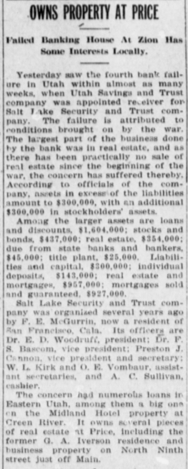 OWNS PROPERTY AT PRICE Failed Banking House At Zion Has Some Interests Locally. Yesterday saw the fourth bank failure in Utah within almost as many weeks, when Utah Savings and Trust company was appointed receiver for Salt Take Security and Trust company. The failure is attributed to conditions brought on by the war. The largest part of the business done by the bank was in real estate, and as there has been practically no sale of real estate since the beginning of the war, the concern has suffered thereby. According to officials of the company, assets in excessiof the liabilities amount to $300,000, with an additional $300,000 in stockholders' assets. Among the larger assets are loans and discounts, $1,604,000; stocks and bonds, $437,000; real estate, $354,000; due from state banks and bankers, $45,000; title plant, $25,000. Liabilities and capital, $300,000; individual deposits, $143,000; real estate and mortgages, $957,000; mortgages sold and guaranteed, $927,000. Salt Lake Security and Trust company was organized several years ago by F. E. McGurrin, now a resident of Ban Francisco, Cala. Its officers are Dr. E. D. Woodruff, president: Dr. F. S. Bascom, vice president: Preston J. Cannon, vice president and secretary: W. L. Kirk and O, E. Vombaur, assistant secretaries, and A. C. Sullivan, cashier. The concern had numerous loans in Eastern Utah, among them a big one on the Midland Hotel property at Creen River. It owns several pieces of real estate at Price, including the former G. A. Iverson residence and business property on North Ninth street just off Main.