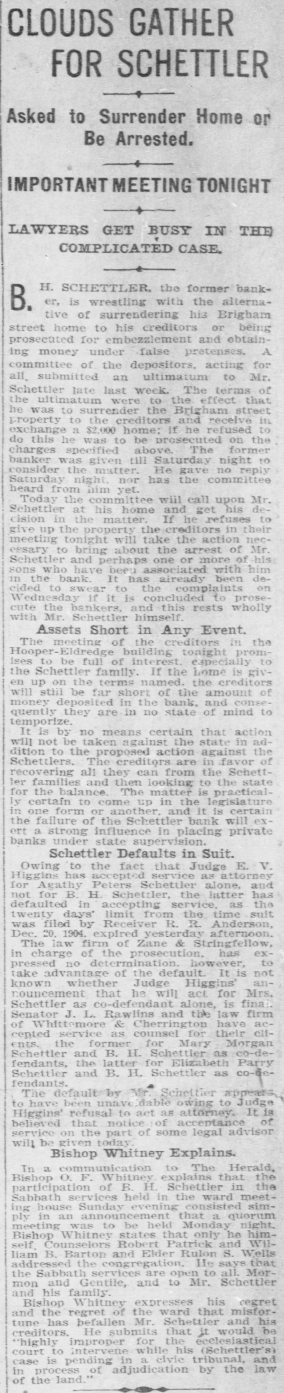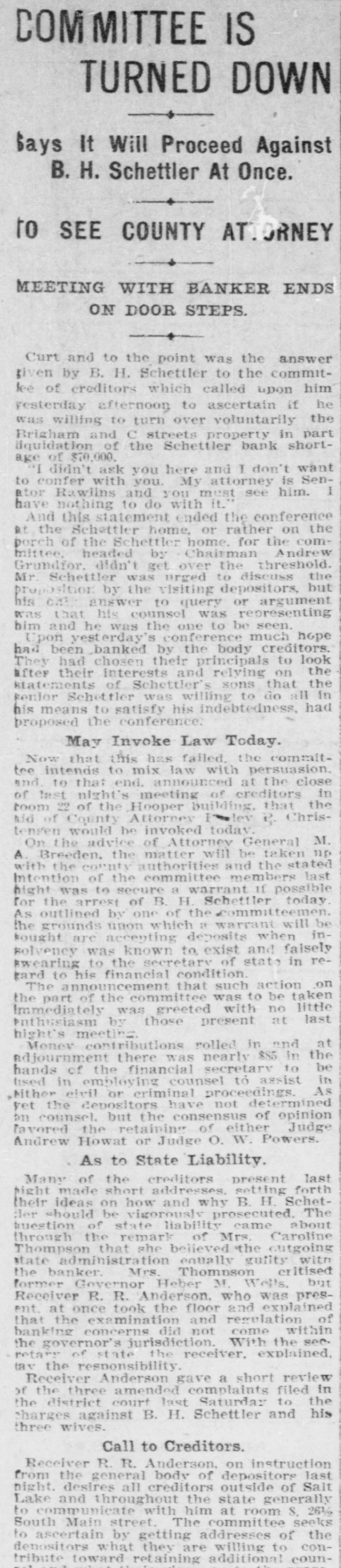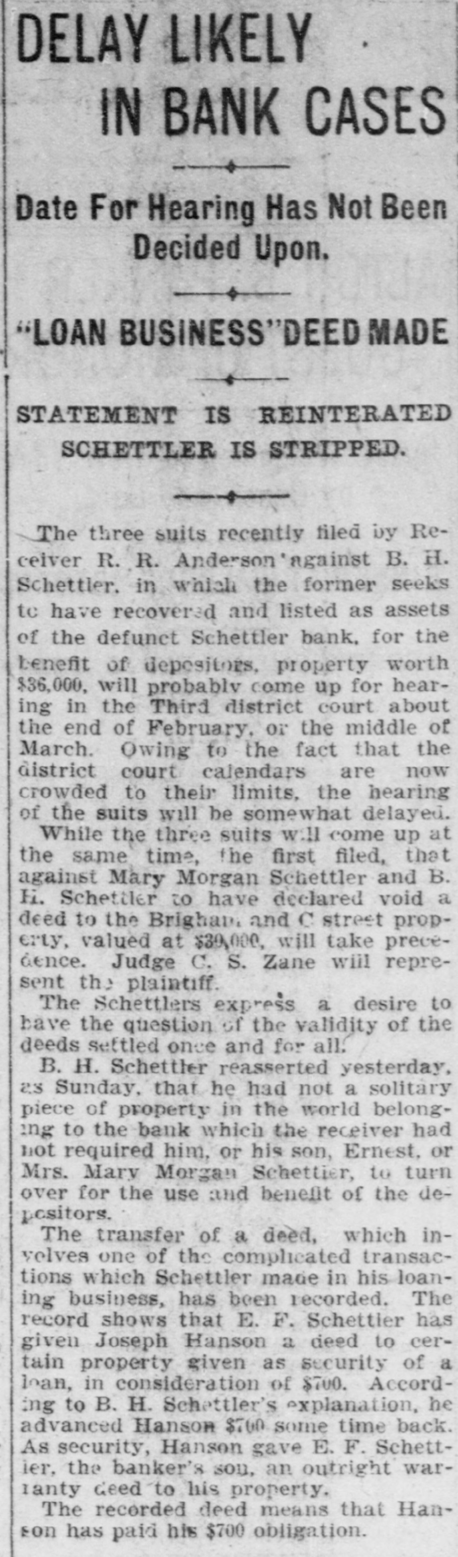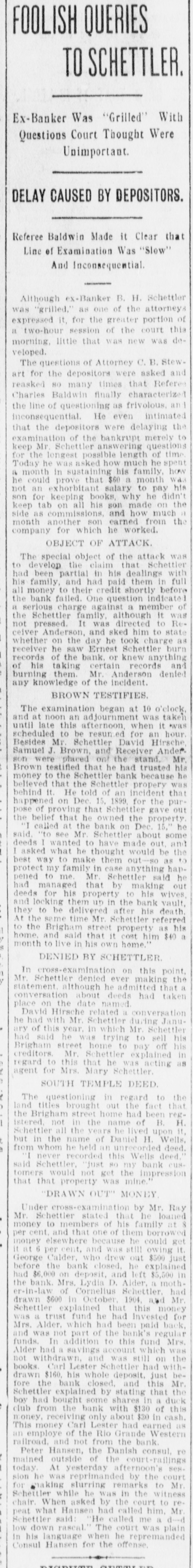 "However, I do say that Schettier has been dishonest in the conduct of his private bank. In The Herald of this morning he practically admits, he does admit, that he has been liable to the penal code for months past. As evidence of his dishonesty there is the deeding of his Brigham street property last May over to his wife. Another evidence of his dishonesty he took money from trusting depositors up until almost the last day."