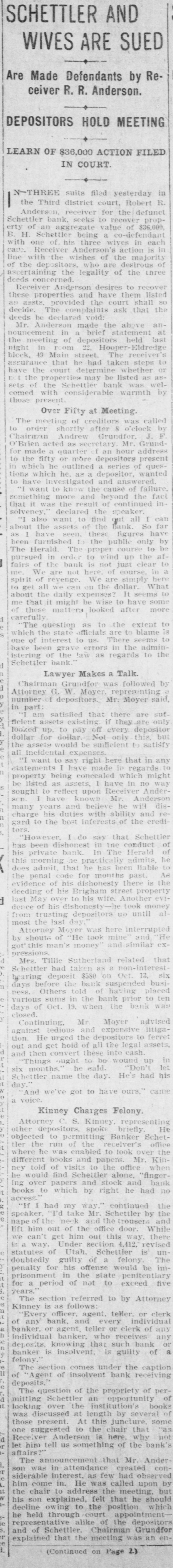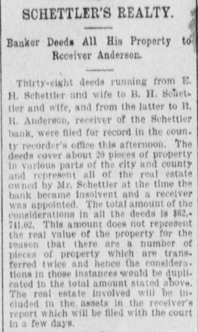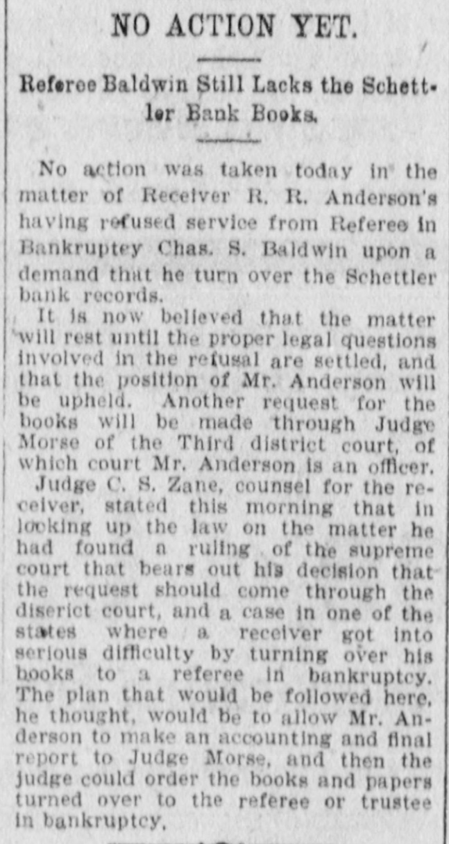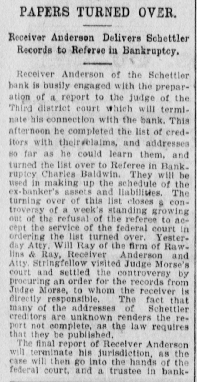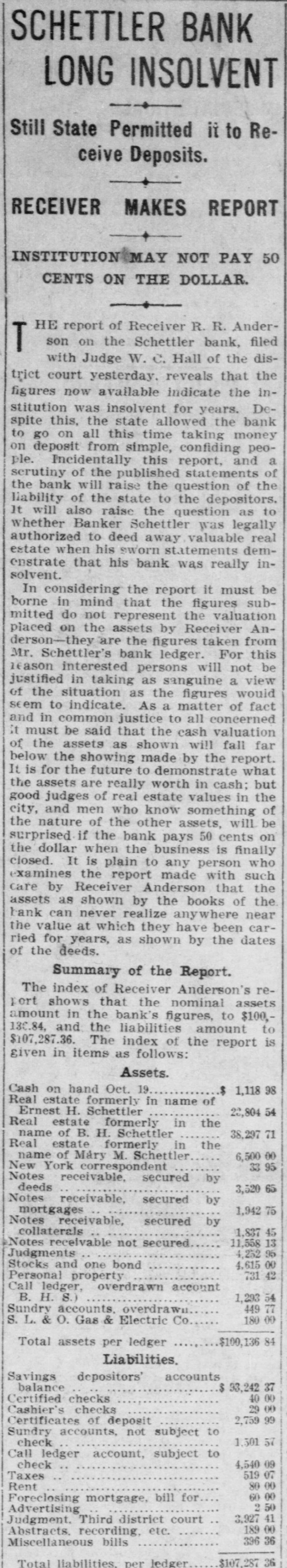 "However, I do say that Schettier has been dishonest in the conduct of his private bank. In The Herald of this morning he practically admits, he does admit, that he has been liable to the penal code for months past. As evidence of his dishonesty there is the deeding of his Brigham street property last May over to his wife. Another evidence of his dishonesty he took money from trusting depositors up until almost the last day."