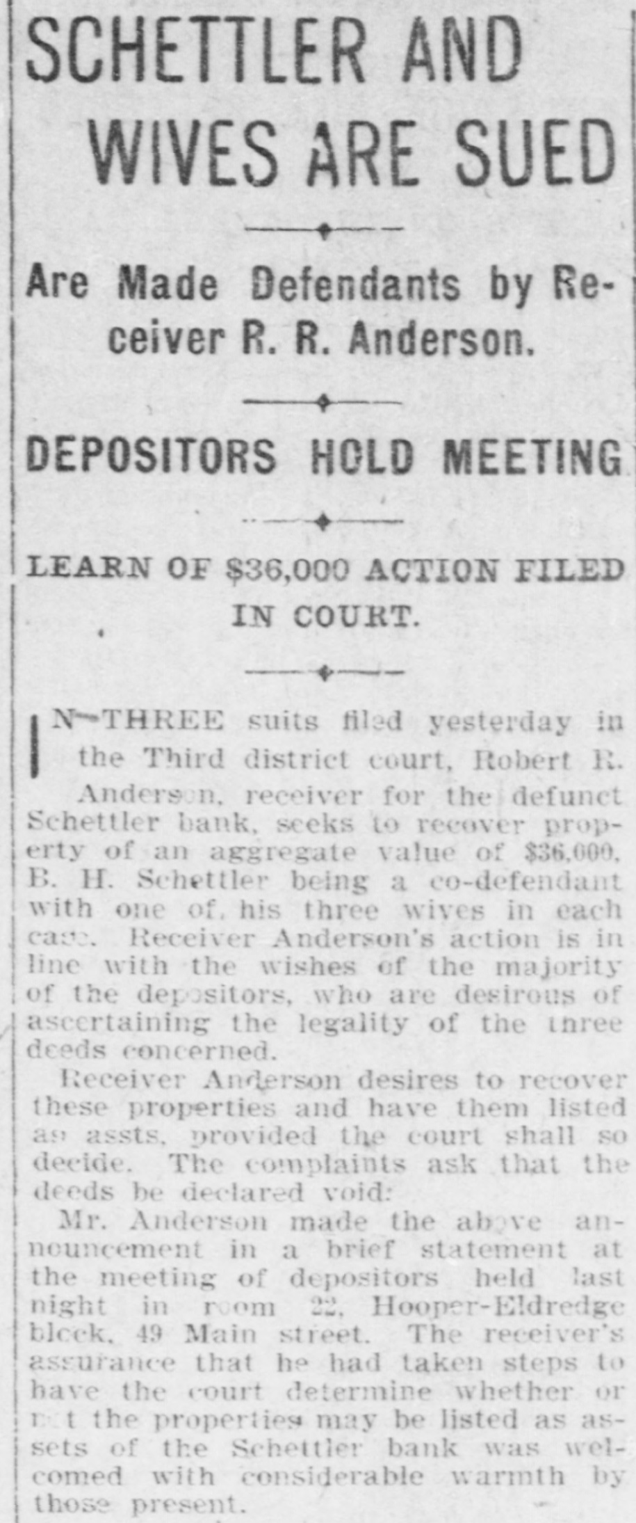 IN-THREE suits filed yesterday in the Third district court, Robert R. Anderson, receiver for the defunct Schettler bank, seeks to recover property of an aggregate value of $36,000, B. H. Schettler being a co-defendant with one of his three wives in each case. Receiver Anderson's action is in line with the wishes of the majority of the depositors, who are desirous of ascertaining the legality of the three deeds concerned.